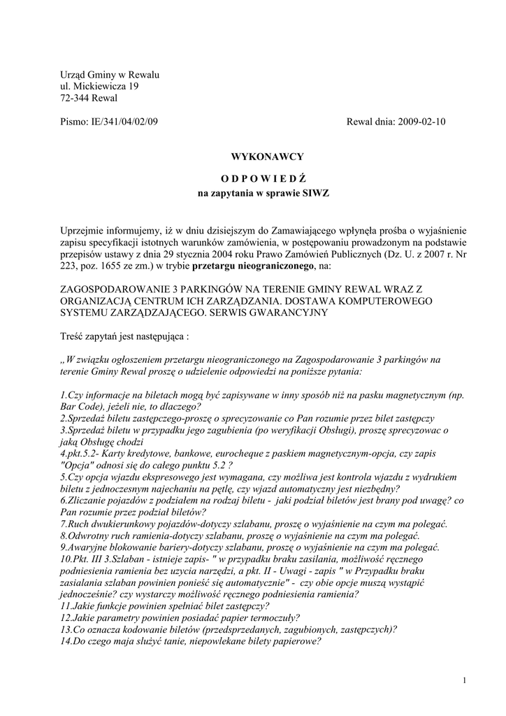 Urząd Gminy w Rewalu ul. Mickiewicza 19 72-344 Rewal Pismo: IE/341/04/02/09 Rewal dnia: 2009-02-10 WYKONAWCY ODPOWIEDŹ na zapytania w sprawie SIWZ Uprzejmie informujemy, iŜ w dniu dzisiejszym do Zamawiającego wpłynęła prośba o wyjaśnienie zapisu specyfikacji istotnych warunków zamówienia, w postępowaniu prowadzonym na podstawie przepisów ustawy z dnia 29 stycznia 2004 roku Prawo Zamówień Publicznych (Dz. U. z 2007 r. Nr 223, poz. 1655 ze zm.) w trybie przetargu nieograniczonego, na: ZAGOSPODAROWANIE 3 PARKINGÓW NA TERENIE GMINY REWAL WRAZ Z ORGANIZACJĄ CENTRUM ICH ZARZĄDZANIA. DOSTAWA KOMPUTEROWEGO SYSTEMU ZARZĄDZAJĄCEGO. SERWIS GWARANCYJNY Treść zapytań jest następująca : „W związku ogłoszeniem przetargu nieograniczonego na Zagospodarowanie 3 parkingów na terenie Gminy Rewal proszę o udzielenie odpowiedzi na poniŜsze pytania: 1.Czy informacje na biletach mogą być zapisywane w inny sposób niŜ na pasku magnetycznym (np. Bar Code), jeŜeli nie, to dlaczego? 2.SprzedaŜ biletu zastępczego-proszę o sprecyzowanie co Pan rozumie przez bilet zastępczy 3.SprzedaŜ biletu w przypadku jego zagubienia (po weryfikacji Obsługi), proszę sprecyzowac o jaką Obsługę chodzi 4.pkt.5.2- Karty kredytowe, bankowe, eurocheque z paskiem magnetycznym-opcja, czy zapis "Opcja" odnosi się do całego punktu 5.2 ? 5.Czy opcja wjazdu ekspresowego jest wymagana, czy moŜliwa jest kontrola wjazdu z wydrukiem biletu z jednoczesnym najechaniu na pętlę, czy wjazd automatyczny jest niezbędny? 6.Zliczanie pojazdów z podziałem na rodzaj biletu - jaki podział biletów jest brany pod uwagę? co Pan rozumie przez podział biletów? 7.Ruch dwukierunkowy pojazdów-dotyczy szlabanu, proszę o wyjaśnienie na czym ma polegać. 8.Odwrotny ruch ramienia-dotyczy szlabanu, proszę o wyjaśnienie na czym ma polegać. 9.Awaryjne blokowanie bariery-dotyczy szlabanu, proszę o wyjaśnienie na czym ma polegać. 10.Pkt. III 3.Szlaban - istnieje zapis- " w przypadku braku zasilania, moŜliwość ręcznego podniesienia ramienia bez uzycia narzędzi, a pkt. II - Uwagi - zapis " w Przypadku braku zasialania szlaban powinien ponieść się automatycznie" - czy obie opcje muszą wystąpić jednocześnie? czy wystarczy moŜliwość ręcznego podniesienia ramienia? 11.Jakie funkcje powinien spełniać bilet zastępczy? 12.Jakie parametry powinien posiadać papier termoczuły? 13.Co oznacza kodowanie biletów (przedsprzedanych, zagubionych, zastępczych)? 14.Do czego maja sluŜyć tanie, niepowlekane bilety papierowe? 1 15.Wydruk raportu po zakończonej zmianie - jaki zakres ma mieć raport? czego konkretnie powinien dotyczyc?” Odpowiedzi Zamawiającego. 1.Czy informacje na biletach mogą być zapisywane w inny sposób niŜ na pasku magnetycznym (np. Bar Code), jeŜeli nie, to dlaczego? Nie przewidujemy innego zapisu. - Informacje powinny być zapisywane na pasku magnetycznym, aby parkingi działały równieŜ w przypadku braku połączenia internetowego z centralą - system musi pracować bez problemów – wpuszczać, naliczać właściwie opłaty, oraz wypuszczać pojazdy tylko po ich opłaceniu, takŜe w trybie off-line. - Bilety z paskiem są grubsze, a zatem trwalsze w uŜytkowaniu przez okres trwania urlopów naszych klientów. 2.SprzedaŜ biletu zastępczego-proszę o sprecyzowanie co Pan rozumie przez bilet zastępczy Bilet zastępczy to bilet, który się koduje i wydaje Klientowi w momencie uszkodzenia / zniszczenia biletu, na który wjechał za jego okazaniem. Jest on duplikatem biletu oryginalnego i wydany na jego podstawie tzn. zakodowany na ta sama godzinę wjazdu, o której został wydany oryginalny bilet. 3.SprzedaŜ biletu w przypadku jego zagubienia (po weryfikacji Obsługi), proszę sprecyzować, o jaką Obsługę chodzi Chodzi o weryfikacje wizualną dokumentów pojazdu lub systemu monitoringu parkingu. 4.pkt.5.2- Karty kredytowe, bankowe, eurocheque z paskiem magnetycznym-opcja, czy zapis "Opcja" odnosi się do całego punktu 5.2 ? Tak, system musi mieć moŜliwość rozbudowy w przyszłości o moduł i oprogramowanie akceptujące płatności przy uŜyciu bankowych kart płatniczych – kredytowych, debetowych i innych, spełniające wymogi instytucji wydających karty. 5.Czy opcja wjazdu ekspresowego jest wymagana, czy moŜliwa jest kontrola wjazdu z wydrukiem biletu z jednoczesnym najechaniu na pętlę, czy wjazd automatyczny jest niezbędny? Drukowanie biletu po najechaniu na pętlę tzw. wjazd ekspresowy, jest funkcją opcjonalną. Podstawowa funkcja to aktywacja wydruku biletu po najechaniu na pętlę. 6.Zliczanie pojazdów z podziałem na rodzaj biletu - jaki podział biletów jest brany pod uwagę? co Pan rozumie przez podział biletów? 2 Konieczna jest informacja ile pojazdów z poszczególnymi typami kart / biletów znajduje się na parkingu w danym czasie. Informacja ta pozwoli na ewentualną rezerwację miejsc na parkingu dla np. kart abonamentowych. 7.Ruch dwukierunkowy pojazdów-dotyczy szlabanu, proszę o wyjaśnienie na czym ma polegać. System musi być przygotowany do rozbudowy, a takŜe to przełączania jednego przejazdu na funkcje WJAZD lub WYJAZD 8.Odwrotny ruch ramienia-dotyczy szlabanu, proszę o wyjaśnienie na czym ma polegać. Ramię szlabanu powinno zamknąć się dopiero po opuszczeniu przez pojazd pętli zamykającej. Gdy pojazd z jakiegoś powodu cofnie się na pętlę zamykającą gdy ramię szlabanu się zamykało, powinno ono natychmiast odwrócić ruch i powrócić do górnego połoŜenia aby uniknąć uszkodzenia pojazdu. 9.Awaryjne blokowanie bariery-dotyczy szlabanu, proszę o wyjaśnienie na czym ma polegać. Chodzi o moŜliwość blokady (zdalnej z poziomu komputera oraz bezpośrednio w barierze) w danej pozycji, np. W pozycji pionowej jeśli ma być wypuszczana kolumna pojazdów bez konieczności ich zatrzymywania. 10.Pkt. III 3.Szlaban - istnieje zapis- " w przypadku braku zasilania, moŜliwość ręcznego podniesienia ramienia bez uŜy