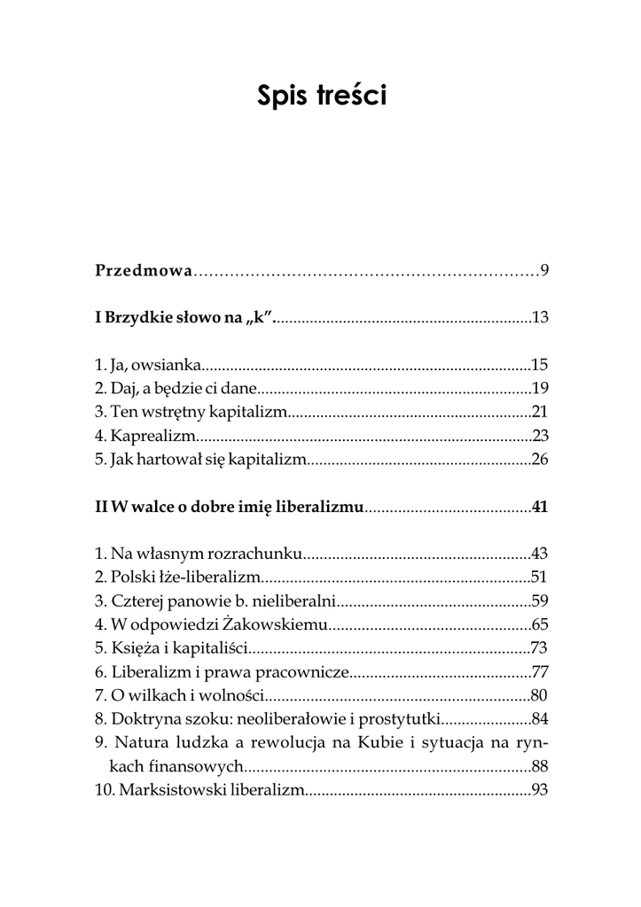 Spis treœci Przedmowa...................................................................9 I Brzydkie s³owo na „k”...............................................................13 1. Ja, owsianka.................................................................................15 2. Daj, a bêdzie ci dane...................................................................19 3. Ten wstrêtny kapitalizm............................................................21 4. Kaprealizm...................................................................................23 5. Jak hartowa³ siê kapitalizm.......................................................26 II W walce o dobre imiê liberalizmu........................................41 1. Na w³asnym rozrachunku.......................................................43 2. Polski ³¿e-liberalizm.................................................................51 3. Czterej panowie b. nieliberalni...............................................59 4. W odpowiedzi ¯akowskiemu.................................................65 5. Ksiê¿a i kapitaliœci....................................................................73 6. Liberalizm i prawa pracownicze............................................77 7. O wilkach i wolnoœci................................................................80 8. Doktryna szoku: neolibera³owie i prostytutki......................84 9. Natura ludzka a rewolucja na Kubie i sytuacja na rynkach finansowych.....................................................................88 10. Marksistowski liberalizm.......................................................93 5 A nie mówi³em? III Polska transformacja............................................................ 101 1. (Nie)realny kapitalizm w³adzy...............................................103 2. Na co id¹ nasze podatki...........................................................106 3. Koniec wolnoœci po 20 latach niepodleg³oœci.......................112 4. Prawem wytrycha...................................................................118 5. Polskie k³amstwa.....................................................................124 6. Wêdruj¹cy sukces.....................................................................134 IV Przeciw leczeniu ospy choler¹...........................................145 1. Dziecko do ¿³obka, mama do pracy....................................147 2. Nie stoi na stacji lokomotywa...............................................149 3. Cukier ekologiczny.................................................................151 4. Euro jak marihuana................................................................153 5. Euro 2012!!!...............................................................155 6. Rz¹d na macierzyñskim...................................................158 7. M¹æ tê narodow¹ kadŸ, serce truj, g³owê traæ...............160 8. Szko³y, Giertych i Friedman..................................................162 9. Prokuratorzy z „gara¿u na Grochowie”.............................167 10. Rz¹d zwiêksza prokreacjê...................................................169 11. Deficyt & w³adza..................................................................171 12. Pose³ Janosik........................................................................174 13. Belk¹ po artystach..............................................................178 14. Bezbolesne reformy profesora Balcerowicza...................181 15. Bezrobotni nie chc¹ pracowaæ...........................................183 16. Opodatkowaæ Billa Gatesa!...............................................185 17. Kosmiczna konstytucja.......................................................187 6 V Podatkowe zmagania...........................................................195 1. Zlikwidowaæ dochodowy. Projekt podatkowy CAS.......197 2. Liniowy, czyli uczciwy............................................................206 3. Gospodarka na ulgach traci...................................................214 4. Czy podatki mog¹ byæ sprawiedliwe i proste.....................219 5. Progresywna grabie¿............................................................228 6. Podatki w zaklêtym kole przyczyn......................................239 7. Czy mo¿na nie p³aciæ podatków?.........................................257 8. Niesprawiedliwa progresja....................................................259 9. Podatek od wdów i sierot.......................................................267 10. Bezrobocie po polsku.............................................................269 11. Progresja orê¿em marksizmu s³u¿¹cym obaleniu kapitalizmu..........................................................271 12. Katolicyzm a progresja podatkowa..............................273 13. Dlaczego protestowaæ przeciwko progresji?....................277 14. Czy podatki powinny byæ celowe?.................................283 15. Koszty progresji dla Matematyka...............................291 16. Œwiêta, œwiêta i po œwiêtach... A teraz trzeba pop³aciæ podatki..................................................................297 17. Chiñczyk, sojusznik Kowalskiego.................................299 VI Meandry ubezpieczeñ spo³ecznych..........................303 1. Niewygodna prawda..........................................................305 2. Nieweso³a prawda o OFE...................................................310 3. Emerytury nasze kochane...................................................315 4. Uk³ad ubezpieczeniowy.....................................................321 7 A nie mówi³em? 5. Porzuæmy z³udzenia, zlikwidujmy ZUS.............................326 6. ZUS-ik mój widzê malutki...................................................337 VII Kryzys.................................................................343 1. Krach socjalizmu na Wall Street....................