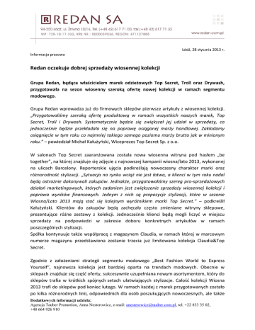 Łódź, 28 stycznia 2013 r. Informacja prasowa Redan oczekuje dobrej sprzedaży wiosennej kolekcji Grupa Redan, będąca właścicielem marek odzieżowych Top Secret, Troll oraz Drywash, przygotowała na sezon wiosenny szeroką ofertę nowej kolekcji w ramach segmentu modowego. Grupa Redan wprowadza już do firmowych sklepów pierwsze artykuły z wiosennej kolekcji. „Przygotowaliśmy szeroką ofertę produktową w ramach wszystkich naszych marek, Top Secret, Troll i Drywash. Systematycznie będzie się zwiększał jej udział w sprzedaży, co jednocześnie będzie przekładało się na poprawę osiąganej marży handlowej. Zakładamy osiągnięcie w tym roku co najmniej takiego samego poziomu marży brutto jak w minionym roku.” – powiedział Michał Kałużyński, Wiceprezes Top Secret Sp. z o.o. W salonach Top Secret zaaranżowana została nowa wiosenna witryna pod hasłem „be together”, na której znajduje się zdjęcie z najnowszej kampanii wiosna/lato 2013, wykonanej na ulicach Barcelony. Reporterskie ujęcia podkreślają nowoczesny charakter marki oraz różnorodność stylizacji. „Sytuacja na rynku wciąż nie jest łatwa, a klienci w tym roku nadal będą ostrożnie dokonywali zakupów. Jednakże, przygotowaliśmy szereg pro-sprzedażowych działań marketingowych, których zadaniem jest zwiększenie sprzedaży wiosennej kolekcji i poprawa wyników finansowych. Jednym z nich są propozycje stylizacji, które w sezonie Wiosna/Lato 2013 mają stać się kolejnym wyróżnikiem marki Top Secret.” – podkreślił Kałużyński. Klientów do zakupów będą zachęcały często zmieniane witryny sklepowe, prezentujące różne zestawy z kolekcji. Jednocześnie klienci będą mogli liczyć w miejscu sprzedaży na podpowiedzi w zakresie doboru konkretnych artykułów w ramach poszczególnych stylizacji. Spółka kontynuuje także współpracę z magazynem Claudia, w ramach której w marcowym numerze magazynu przedstawiona zostanie trzecia już limitowana kolekcja Claudia&Top Secret. Zgodnie z założeniami strategii segmentu modowego „Best Fashion World to Express Yourself”, najnowsza kolekcja jest bardziej oparta na trendach modowych. Obecnie w sklepach znajduje się część oferty, sukcesywnie uzupełniana nowym asortymentem, który do sklepów trafia w krótkich spójnych setach ułatwiających stylizacje. Całość kolekcji Wiosna 2013 trafi do sklepów pod koniec lutego. W ramach każdej z marek przygotowanych zostało po kilka różnorodnych linii, odpowiednich dla osób poszukujących nowoczesnych, ale także Dodatkowych informacji udziela: Agencja Tauber Promotion, Anna Nesterowicz, e-mail: [email protected], tel. +22 833 35 02, +48 664 926 910 klasycznych propozycji. Dla marki Top Secret główną inspiracją jest sztuka art-deco, pop-art oraz inspiracje wzorami missoni. Jak zawsze marka stawia na podkreślenie kobiecości, gdzie w zależności od stylu pastelowy trend przełamany jest czarnymi skóry. W kolekcji męskiej zastosowano ciężkie materiały w kontraście z lekkimi dzianinami. Kolekcja marki Troll inspirowana jest kolorem i przeznaczona jest dla odważnych osób. Marka Drywash postawiła na kobiecość i nietuzinkowość, tworząc ofertę dla energicznych, choć niekoniecznie i wysportowanych osób. *** Redan SA jest operatorem znanych detalicznych marek odzieżowych: Top Secret, Troll i Drywash oraz sieci sklepów TextilMarket. Spółka funkcjonuje w ramach Grupy Kapitałowej, która zajmuje się projektowaniem, marketingiem oraz dystrybucją odzieży. Redan zleca swoją produkcję fabrykom w Polsce, Chinach, Indiach Turcji, Korei i Bangladeszu. W Polsce Grupa Kapitałowa zatrudnia dwa tysiące osób. Sprzedaż jest prowadzona w 4 sieciach detalicznych: Top Secret, Top Secret&Friends, Troll oraz Textilmarket liczących ponad 500 sklepów. Redan powstał w 1995 roku, a w 2003 roku akcje Spółki zostały dopuszczone do publicznego obrotu na Giełdzie Papierów Wartościowych w Warszawie. Spółka aktywnie wspiera Fundację Happy Kids. Dodatkowych informacji udziela: Agencja Tauber Promotion, Anna Nesterowicz, e-mail: [email protected], tel. +22 833 35 02, +48 664 926 910