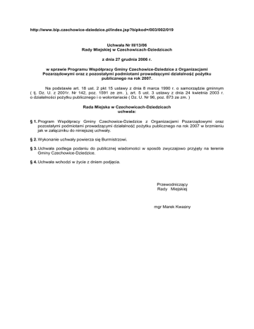 http://www.bip.czechowice-dziedzice.pl/index.jsp?bipkod=/003/002/019 Uchwała Nr III/13/06 Rady Miejskiej w Czechowicach-Dziedzicach z dnia 27 grudnia 2006 r. w sprawie Programu Współpracy Gminy Czechowice-Dziedzice z Organizacjami Pozarz dowymi oraz z pozostałymi podmiotami prowadz cymi działalno po ytku publicznego na rok 2007. Na podstawie art. 18 ust. 2 pkt 15 ustawy z dnia 8 marca 1990 r. o samorzdzie gminnym ( tj. Dz. U. z 2001r. Nr 142, poz. 1591 ze zm. ), art. 5 ust. 3 ustawy z dnia 24 kwietnia 2003 r. o działalnoci poytku publicznego i o wolontariacie ( Dz. U. Nr 96, poz. 873 ze zm. ) Rada Miejska w Czechowicach-Dziedzicach uchwala: § 1. Program Współpracy Gminy Czechowice-Dziedzice z Organizacjami Pozarzdowymi oraz pozostałymi podmiotami prowadzcymi działalno poytku publicznego na rok 2007 w brzmieniu jak w załczniku do niniejszej uchwały. § 2. Wykonanie uchwały powierza si Burmistrzowi. § 3. Uchwała podlega podaniu do publicznej wiadomoci w sposób zwyczajowo przyjty na terenie Gminy Czechowice-Dziedzice. § 4. Uchwała wchodzi w ycie z dniem podjcia. Przewodniczcy Rady Miejskiej mgr Marek Kwany Zał cznik do Uchwały Rady Miejskiej Nr III/13/06 z dnia 27 grudnia 2006 r. PROGRAM WSPÓŁPRACY GMINY CZECHOWICE-DZIEDZICE Z ORGANIZACJAMI POZARZ DOWYMI ORAZ POZOSTAŁYMI PODMIOTAMI PROWADZ CYMI DZIAŁALNO PO YTKU PUBLICZNEGO NA ROK 2007 Rozdział I Postanowienia ogólne §1 1. Program stanowi element lokalnej, szeroko rozumianej polityki społecznej i ma na celu objcie moliwie jak najszerszych obszarów aktywnoci obywatelskiej w społecznoci lokalnej gminy Czechowice-Dziedzice, umacnianie w wiadomoci społecznej poczucia odpowiedzialnoci za siebie oraz wspólnot lokaln a tak e zwikszenie udziału mieszkaców w rozwizywaniu lokalnych problemów. 2. Program dotyczy organizacji prowadzcych działalno mieszkaców gminy Czechowice-Dziedzice. poytku publicznego na rzecz 3. Współpraca z organizacjami dotyczy realizacji zada publicznych ujtych w ustawie o działalnoci poytku publicznego i o wolontariacie, zgodnych z zadaniami gminy, okrelonymi w ustawie o samorzdzie gminnym. 4. Organizacje potwierdzaj wol współpracy i działa na rzecz społecznoci lokalnej poprzez wypełnienie ankiety stanowicej podstaw bazy danych o organizacjach pozarzdowych. 5. Ilekro w niniejszym Programie Współpracy Gminy Czechowice-Dziedzice z Organizacjami Pozarzdowymi oraz pozostałymi podmiotami prowadzcymi działalno poytku publicznego jest mowa o: 5.1. ustawie – naley rozumie przez to ustaw z dnia 24 kwietnia 2003 roku o działalnoci poytku publicznego i o wolontariacie, 5.2. działalnoci poytku publicznego – naley rozumie przez to działalno społecznie uyteczn, prowadzon przez organizacje pozarzdowe w sferze zada publicznych okrelonych w art. 4 ustawy, 5.3. organizacji – naley rozumie przez to organizacje pozarzdowe, osoby prawne i jednostki organizacyjne, o których mowa w art. 3 ust. 2 i 3 ustawy, 5.4. programie – naley rozumie przez to Program Współpracy Gminy Czechowice-Dziedzice z Organizacjami Pozarzdowymi oraz z pozostałymi podmiotami prowadzcymi działalno poytku publicznego na rok 2007. Rozdział II Obszar współpracy §2 Współpraca gminy Czechowice-Dziedzice z organizacjami pozarzdowymi w roku 2007 obejmowa bdzie zadania własne Gminy mieszczce si w katalogu zada z art. 4 ust. 1 ustawy, a w szczególnoci : 1. Pomoc społeczna i ochrona zdrowia, w tym: 1.1. pomoc rodzinom i osobom w trudnej sytuacji yciowej oraz wyrównywanie szans tych rodzin, obejmujca: 1.1.1. 1.1.2. prowadzenie wietlicy profilaktyczno-wychowawczej dla dzieci pochodzcych z rodzin zagroonych marginalizacj społeczn, Do zlecania realizacji zada, o których mowa w ust.1.1. stosuje si przepisy o pomocy społecznej. 1.2. działalno na rzecz osób niepełnosprawnych obejmujc przewóz osób niepełnosprawnych, prowadzenie edukacji i rehabilitacji oraz działania integracyjne, obejmujca: 1.2.1. 1.2.2. 1.2.3. 1.2.4. 1.2.5. 1.2.6. 1.2.7. programy rehabilitacyjno-wychowawcze dla dzieci i młodziey ze sprzonymi niepełnosprawnociami, działalno na rzecz osób niepełnosprawnych obejmujca przewóz osób niepełnosprawnych, prowadzenie edukacji, rehabilitacji oraz działania integracyjne, rewalidacja osób niepełnosprawnych poprzez hipoterapi, zajcia plastyczno-techniczne oraz rehabilitacj ruchow, umoliwienie korzystania z rehabilitacji zajciowych młodziey niepełnosprawnej, programy rehabilitacyjno-wychowawcze dla osób dorosłych ze sprzonymi niepełnosprawnociami ( tzw. ”dorosłe dzieci” ), integracja społeczna jako terapia dla dzieci niepełnosprawnych i ich rodziców, rodzestwa oraz opiekunów, spotkania integracyjne, paraolimpiada, rehabilitacja dzieci niepełnosprawnych poprzez rozwijanie zainteresowa, w tym zorganizowanie kółka filmowo-fotograficznego dla osób niepełnosprawnych umysłowo oraz organizacja konkursów, 1.3. zwikszanie dostpnoci pomocy terapeutycznej i rehabilitacyjnej dla osób uzalenionych od alkoholu i współuzalenionych, 1.4. udzielanie rodzinom, w których wystpuj problemy alkoholowe, pomocy psychospołecznej i prawnej, a w szczególnoci ochrony przed przemoc w rodzinie, 1.5. prowadzenie profilaktycznej działalnoci informacyjnej i edukacyjnej w zakresie rozwizywania problemów alkoholowych w szczególnoci dla dzieci i młodziey, w tym prowadzenie pozalekcyjnych zaj sportowych, a take działa na rzecz doywiania dzieci uczestniczcych w pozalekcyjnych programach opiekuczo-wychowawczych i socjoterapeutycznych. 1.6. Zadania okrelone w ust. 1.3., 1.4. i 1.5. realizowane s w oparciu o Gminny Program Profilaktyki i Rozwizywania Problemów Alkoholowych. 1.7. zwikszanie dostpnoci pomocy terapeutycznej i rehabilitacyjnej dla osób uzalenionych i osób zagroonych uzalenieniem, 1.8. udzielanie rodzinom, w których wystpuj problemy narkomanii, pomocy psychospołecznej i prawnej, 1.9. prowadzenie profilaktycznej działalnoci informacyjnej, edukacyjnej oraz szkoleniowej w zakresie rozwizyw