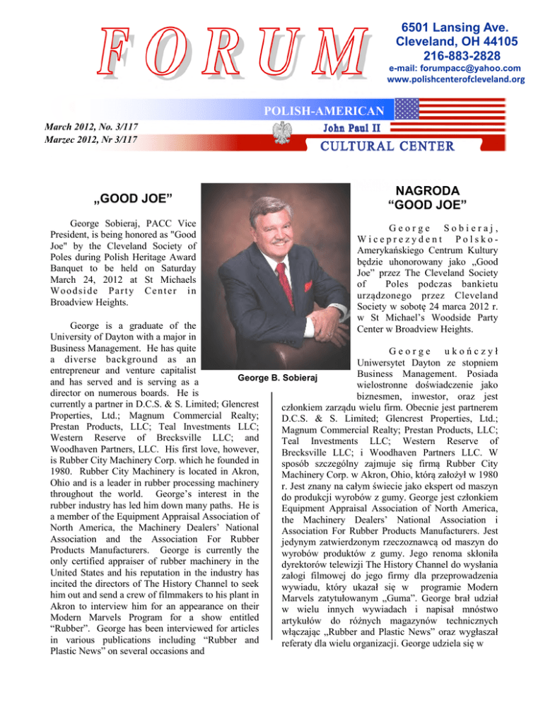 6501 Lansing Ave. Cleveland, OH 44105 216-883-2828 e-mail: [email protected] www.polishcenterofcleveland.org POLISH-AMERICAN March 2012, No. 3/117 Marzec 2012, Nr 3/117 „GOOD JOE” George Sobieraj, PACC Vice President, is being honored as "Good Joe" by the Cleveland Society of Poles during Polish Heritage Award Banquet to be held on Saturday March 24, 2012 at St Michaels Woodside Party Center in Broadview Heights. NAGRODA “GOOD JOE” George Sobieraj, Wiceprezydent PolskoAmerykańskiego Centrum Kultury będzie uhonorowany jako „Good Joe” przez The Cleveland Society of Poles podczas bankietu urządzonego przez Cleveland Society w sobotę 24 marca 2012 r. w St Michael’s Woodside Party Center w Broadview Heights. George is a graduate of the University of Dayton with a major in Business Management. He has quite George ukończył a diverse background as an Uniwersytet Dayton ze stopniem entrepreneur and venture capitalist Business Management. Posiada George B. Sobieraj and has served and is serving as a wielostronne doświadczenie jako director on numerous boards. He is biznesmen, inwestor, oraz jest currently a partner in D.C.S. & S. Limited; Glencrest członkiem zarządu wielu firm. Obecnie jest partnerem Properties, Ltd.; Magnum Commercial Realty; D.C.S. & S. Limited; Glencrest Properties, Ltd.; Prestan Products, LLC; Teal Investments LLC; Magnum Commercial Realty; Prestan Products, LLC; Western Reserve of Brecksville LLC; and Teal Investments LLC; Western Reserve of Woodhaven Partners, LLC. His first love, however, Brecksville LLC; i Woodhaven Partners LLC. W is Rubber City Machinery Corp. which he founded in sposób szczególny zajmuje się firmą Rubber City 1980. Rubber City Machinery is located in Akron, Machinery Corp. w Akron, Ohio, którą założył w 1980 Ohio and is a leader in rubber processing machinery r. Jest znany na całym świecie jako ekspert od maszyn throughout the world. George’s interest in the do produkcji wyrobów z gumy. George jest członkiem rubber industry has led him down many paths. He is Equipment Appraisal Association of North America, a member of the Equipment Appraisal Association of the Machinery Dealers’ National Association i North America, the Machinery Dealers’ National Association For Rubber Products Manufacturers. Jest Association and the Association For Rubber jedynym zatwierdzonym rzeczoznawcą od maszyn do Products Manufacturers. George is currently the wyrobów produktów z gumy. Jego renoma skłoniła only certified appraiser of rubber machinery in the dyrektorów telewizji The History Channel do wysłania United States and his reputation in the industry has załogi filmowej do jego firmy dla przeprowadzenia incited the directors of The History Channel to seek wywiadu, który ukazał się w programie Modern him out and send a crew of filmmakers to his plant in Marvels zatytułowanym „Guma”. George brał udział Akron to interview him for an appearance on their w wielu innych wywiadach i napisał mnóstwo Modern Marvels Program for a show entitled artykułów do różnych magazynów technicznych “Rubber”. George has been interviewed for articles włączając „Rubber and Plastic News” oraz wygłaszał in various publications including “Rubber and referaty dla wielu organizacji. George udziela się w Plastic News” on several occasions and Forum - March 2012 - appeared as guest speaker for various organizations. He has also been involved with various civic organizations over the years including serving as president of the Seven Hills Jaycees. George is a charter member of the Case Western Reserve University Advisory Council for Macular Degeneration Research and is a member of Marymount Hospital’s Community Action Board. George’s other love is the Polish community. Born in the St. Hyacinth area, he is very proud of his Polish heritage. Anyone who knows George is aware that he is always ready to do whatever it takes to promote Polonia in the community. Several years ago he negotiated with the Cleveland Indians to have a Polish Night at the stadium. Since then, this had been an annual event through 2010 which commenced with a pre-game infield parade and a ceremonial first pitch. The record of ticket sales for this event was in 2007 when 1,000 tickets were sold by the Polish organizations. George had the honor of throwing out the first pitch that year. When the International Children’s Games and Cultural Festival were held in Cleveland, besides chauffeuring the Polish dignitaries around Cleveland, George supplied Cleveland Indians baseball caps to all of the athletes from Poland as a remembrance of the event. George also organized an annual “Polish Open” golf tournament which had become quite popular over the years. When asked what he considers a major accomplishment, George is quick to respond that he considers his efforts to have the war memorial bearing the names of two of his uncles, as well as other veterans from the Polish neighborhood, moved from the closed St. Hyacinth Church grounds to Calvary Cemetery to be among those accomplishments most dear to his heart. In 2009, George received the Polish Heritage Award from the Polonia Foundation of which he is a Knight of Pulaski. When the President of Poland, Bronislaw Komorowski, visited Cleveland in December of 2010, George was honored to be among those welcoming him to the Polish-American Cultural Center and proud to shake his hand and take a small part in this historical visit. In 2011, George was the Honoree of the Ohio Chapter of The Kosciuszko Foundation at their annual awards banquet. George served as business advisor to the November, 2011 production of Zatańczmy, a celebration of Polish Folk Dance performed at the Breen Center for Performing Arts. George has been a frequent guest on the Polish Radio Program on 90.3 FM hosted by Eugenia Stolarczyk. He is thrilled to be the voice behind the opening intro to Eugenia each Sunday. Currently George is pr