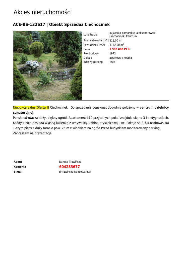 Akces nieruchomości ACE-BS-132617 | Obiekt Sprzedaż Ciechocinek Lokalizacja kujawsko-pomorskie, aleksandrowski, Ciechocinek, Centrum Pow. całkowita [m2] 211,00 m2 Pow. działki [m2] 3172,00 m2 Cena 1 500 000 PLN Rok budowy 1972 Dojazd asfaltowa / kostka Własny parking True Niepowtarzalna Oferta !! Ciechocinek. Do sprzedania pensjonat dogodnie położony w centrum dzielnicy sanatoryjnej. Pensjonat otacza duży, piękny ogród. Apartament i 10 przytulnych pokoi znajduje się na 3 kondygnacjach. Każdy z nich posiada własną łazienkę z umywalką, kabiną prysznicową i wc. Pokoje są 2,3,4-osobowe. Na 1-szym piętrze duży taras o pow. 25 m z widokiem na ogród.Przed budynkiem monitorowany parking. Zapraszam na prezentację. Agent Danuta Trawińska Komórka 604283677 E-mail [email protected]