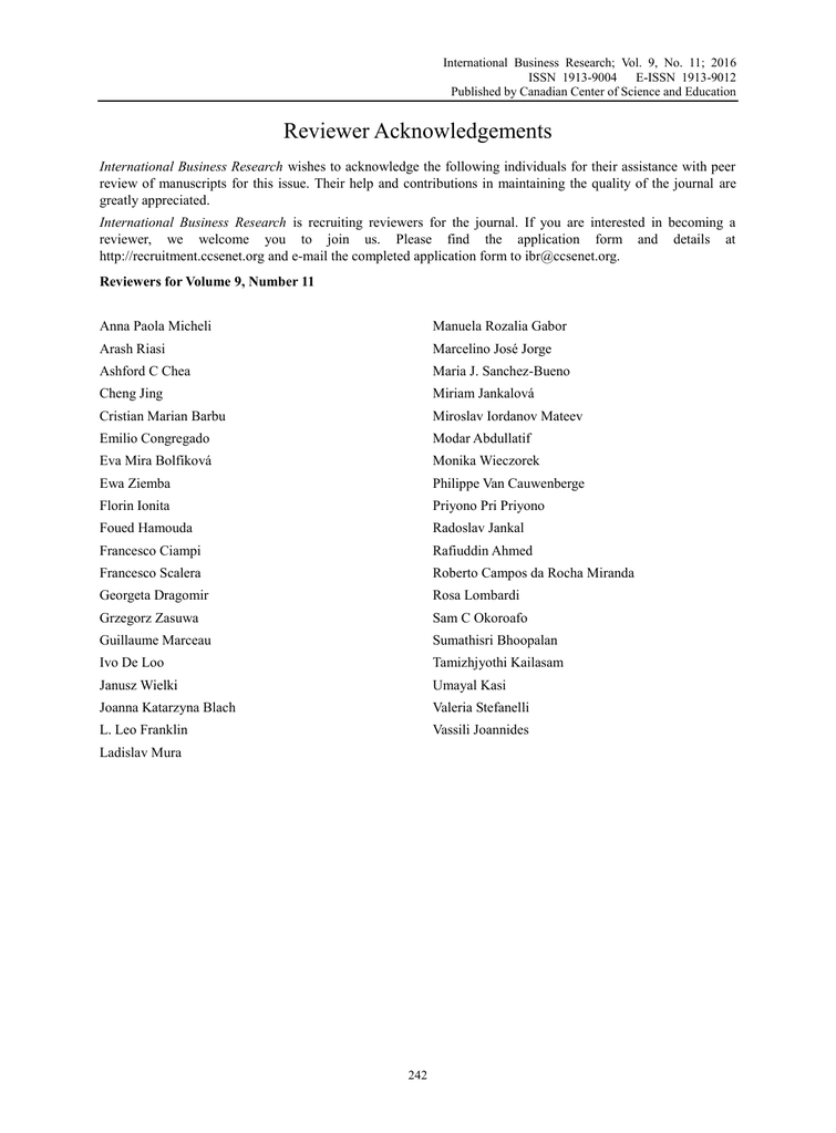 International Business Research; Vol. 9, No. 11; 2016 ISSN 1913-9004 E-ISSN 1913-9012 Published by Canadian Center of Science and Education Reviewer Acknowledgements International Business Research wishes to acknowledge the following individuals for their assistance with peer review of manuscripts for this issue. Their help and contributions in maintaining the quality of the journal are greatly appreciated. International Business Research is recruiting reviewers for the journal. If you are interested in becoming a reviewer, we welcome you to join us. Please find the application form and details at http://recruitment.ccsenet.org and e-mail the completed application form to [email protected]. Reviewers for Volume 9, Number 11 Anna Paola Micheli Manuela Rozalia Gabor Arash Riasi Marcelino JoséJorge Ashford C Chea Maria J. Sanchez-Bueno Cheng Jing Miriam Jankalová Cristian Marian Barbu Miroslav Iordanov Mateev Emilio Congregado Modar Abdullatif Eva Mira Bolfí ková Monika Wieczorek Ewa Ziemba Philippe Van Cauwenberge Florin Ionita Priyono Pri Priyono Foued Hamouda Radoslav Jankal Francesco Ciampi Rafiuddin Ahmed Francesco Scalera Roberto Campos da Rocha Miranda Georgeta Dragomir Rosa Lombardi Grzegorz Zasuwa Sam C Okoroafo Guillaume Marceau Sumathisri Bhoopalan Ivo De Loo Tamizhjyothi Kailasam Janusz Wielki Umayal Kasi Joanna Katarzyna Blach Valeria Stefanelli L. Leo Franklin Vassili Joannides Ladislav Mura 242