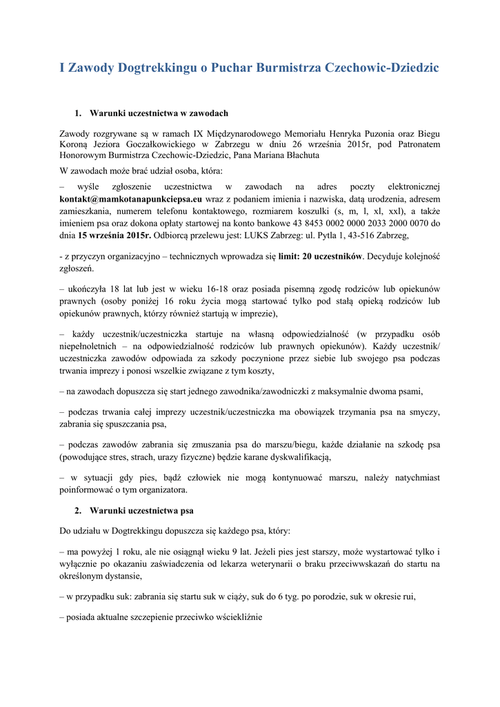 I Zawody Dogtrekkingu o Puchar Burmistrza Czechowic-Dziedzic 1. Warunki uczestnictwa w zawodach Zawody rozgrywane są w ramach IX Międzynarodowego Memoriału Henryka Puzonia oraz Biegu Koroną Jeziora Goczałkowickiego w Zabrzegu w dniu 26 września 2015r, pod Patronatem Honorowym Burmistrza Czechowic-Dziedzic, Pana Mariana Błachuta W zawodach może brać udział osoba, która: – wyśle zgłoszenie uczestnictwa w zawodach na adres poczty elektronicznej [email protected] wraz z podaniem imienia i nazwiska, datą urodzenia, adresem zamieszkania, numerem telefonu kontaktowego, rozmiarem koszulki (s, m, l, xl, xxl), a także imieniem psa oraz dokona opłaty startowej na konto bankowe 43 8453 0002 0000 2033 2000 0070 do dnia 15 września 2015r. Odbiorcą przelewu jest: LUKS Zabrzeg: ul. Pytla 1, 43-516 Zabrzeg, - z przyczyn organizacyjno – technicznych wprowadza się limit: 20 uczestników. Decyduje kolejność zgłoszeń. – ukończyła 18 lat lub jest w wieku 16-18 oraz posiada pisemną zgodę rodziców lub opiekunów prawnych (osoby poniżej 16 roku życia mogą startować tylko pod stałą opieką rodziców lub opiekunów prawnych, którzy również startują w imprezie), – każdy uczestnik/uczestniczka startuje na własną odpowiedzialność (w przypadku osób niepełnoletnich – na odpowiedzialność rodziców lub prawnych opiekunów). Każdy uczestnik/ uczestniczka zawodów odpowiada za szkody poczynione przez siebie lub swojego psa podczas trwania imprezy i ponosi wszelkie związane z tym koszty, – na zawodach dopuszcza się start jednego zawodnika/zawodniczki z maksymalnie dwoma psami, – podczas trwania całej imprezy uczestnik/uczestniczka ma obowiązek trzymania psa na smyczy, zabrania się spuszczania psa, – podczas zawodów zabrania się zmuszania psa do marszu/biegu, każde działanie na szkodę psa (powodujące stres, strach, urazy fizyczne) będzie karane dyskwalifikacją, – w sytuacji gdy pies, bądź człowiek nie mogą kontynuować marszu, należy natychmiast poinformować o tym organizatora. 2. Warunki uczestnictwa psa Do udziału w Dogtrekkingu dopuszcza się każdego psa, który: – ma powyżej 1 roku, ale nie osiągnął wieku 9 lat. Jeżeli pies jest starszy, może wystartować tylko i wyłącznie po okazaniu zaświadczenia od lekarza weterynarii o braku przeciwwskazań do startu na określonym dystansie, – w przypadku suk: zabrania się startu suk w ciąży, suk do 6 tyg. po porodzie, suk w okresie rui, – posiada aktualne szczepienie przeciwko wściekliźnie – prowadzony jest na smyczy lub na lince z amortyzatorem, w szelkach lub obroży; kategorycznie zabrania się prowadzenia psa w kagańcu, kolczatce oraz obroży zaciskowej - zabrania się udziału w imprezie psów o agresywnym wychowaniu – organizator ma prawo nie dopuścić do zawodów psa, jeśli stwierdzi, że zagraża to bezpieczeństwu innych zawodników. 3. Wyposażenie uczestnika Każdy uczestnik zawodów zobowiązany jest do posiadania: – książeczki z aktualnymi szczepieniami psa, – karty uczestnictwa (do pobraniu w biurze zawodów w dniu zawodów, wypełnioną kartę zwraca się na mecie), – telefonu komórkowego (naładowanego!), – miski oraz wody dla psa, Wyposażenie zawodników może być sprawdzane przez sędziego przed startem. 4. Opłaty startowe 5 zł – ulgowy koszt uczestnictwa w zawodach dla aktywnych wolontariuszy działających w schroniskach dla bezdomnych zwierząt, 20 zł – normalny koszt uczestnictwa w zawodach. Wpłaty należy dokonać przelewem na konto bankowe LUKS Zabrzeg: ul. Pytla 1, 43-516 Zabrzeg 43 8453 0002 0000 2033 2000 0070 Płatności dokonane na konto Organizatora tytułem uczestnictwa nie podlegają zwrotowi. W tytule płatności należy wpisać nazwisko/nazwiska osoby/osób, za które dokonywana jest opłata. W ramach opłaty startowej zawodnik otrzymuje: – pamiątkowy medal oraz koszulkę, – ubezpieczenie NNW, – poczęstunek, 5. Trasa Do pokonania zawodnicy mają dystans 10.5km. Trasa pokrywa się z trasą dla biegaczy (opis trasy oraz nagranie przebiegu trasy dostępne na www.memorialhenrykapuzonia.pl 6. Nagrody W kategorii kobiet: I miejsce - Puchar Burmistrza Czechowic-Dziedzic II Miejsce - Puchar Burmistrza Czechowic-Dziedzic III Miejsce - Puchar Burmistrza Czechowic-Dziedzic W kategorii mężczyzn: I miejsce - Puchar Burmistrza Czechowic-Dziedzic II Miejsce - Puchar Burmistrza Czechowic-Dziedzic III Miejsce - Puchar Burmistrza Czechowic-Dziedzic 7. Ruch drogowy Podczas uczestnictwa w Dogtrekkingu należy dostosować się do przepisów Ruchu Drogowego obowiązujących na całej trasie. Organizator nie ponosi odpowiedzialności za ewentualne kolizje i wypadki. 8. Kary Sędzia w porozumieniu z Organizatorem może zasądzić następujące kary: – Upomnienie, – Dyskwalifikację Spożywanie alkoholu na trasie oraz terenie zawodów przez zawodnika/zawodniczkę jest jednoznaczne z jego/ jej dyskwalifikacją. 9. Ochrona środowiska naturalnego Zaśmiecanie terenu zawodów oraz trasy będzie karane dyskwalifikacją. Zawodnicy/ zawodniczki zobowiązani/ zobowiązane są do sprzątania odchodów po swoim psie na terenie zawodów oraz na całej trasie. Wyjątkiem są kompleksy leśne, w obrębie których nie ma odpowiednich pojemników. 10. Protesty Protesty do Sędziego Głównego zawodów można składać w formie pisemnej w czasie trwania zawodów. Decyzja ostateczna należy do Sędziego Głównego. 11. Informacje dodatkowe Organizator nie ponosi odpowiedzialności materialnej za rzeczy zaginione w trakcie trwania zawodów. Brak znajomości regulaminu nie będzie uznawany jako wytłumaczenie jego nieprzestrzegania. Dogtrekking odbędzie się bez względu na warunki atmosferyczne. Organizator zastrzega sobie prawo do odwołania imprezy bez podania przyczyny. Uczestnik Dogtrekkingu wypełniając kartę zgłoszeniową akceptuje warunki niniejszego regulaminu i wyraża zgodę na przetwarzanie swoich danych osobowych w celach promo