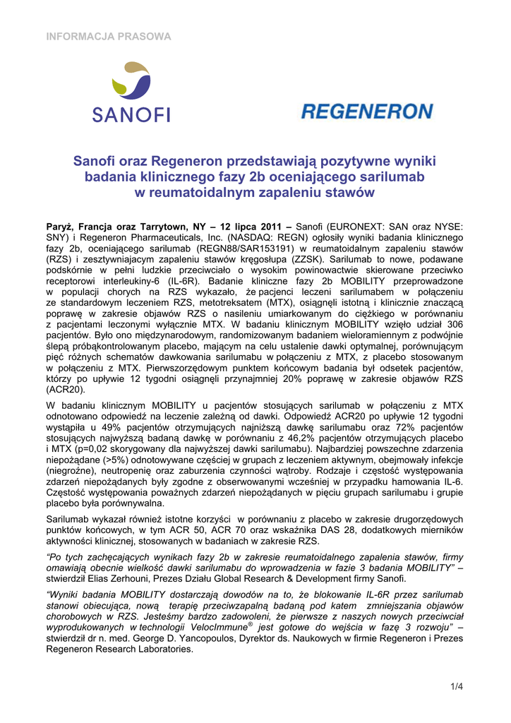 INFORMACJA PRASOWA Sanofi oraz Regeneron przedstawiają pozytywne wyniki badania klinicznego fazy 2b oceniającego sarilumab w reumatoidalnym zapaleniu stawów Paryż, Francja oraz Tarrytown, NY – 12 lipca 2011 – Sanofi (EURONEXT: SAN oraz NYSE: SNY) i Regeneron Pharmaceuticals, Inc. (NASDAQ: REGN) ogłosiły wyniki badania klinicznego fazy 2b, oceniającego sarilumab (REGN88/SAR153191) w reumatoidalnym zapaleniu stawów (RZS) i zesztywniajacym zapaleniu stawów kręgosłupa (ZZSK). Sarilumab to nowe, podawane podskórnie w pełni ludzkie przeciwciało o wysokim powinowactwie skierowane przeciwko receptorowi interleukiny-6 (IL-6R). Badanie kliniczne fazy 2b MOBILITY przeprowadzone w populacji chorych na RZS wykazało, że pacjenci leczeni sarilumabem w połączeniu ze standardowym leczeniem RZS, metotreksatem (MTX), osiągnęli istotną i klinicznie znaczącą poprawę w zakresie objawów RZS o nasileniu umiarkowanym do ciężkiego w porównaniu z pacjentami leczonymi wyłącznie MTX. W badaniu klinicznym MOBILITY wzięło udział 306 pacjentów. Było ono międzynarodowym, randomizowanym badaniem wieloramiennym z podwójnie ślepą próbąkontrolowanym placebo, mającym na celu ustalenie dawki optymalnej, porównującym pięć różnych schematów dawkowania sarilumabu w połączeniu z MTX, z placebo stosowanym w połączeniu z MTX. Pierwszorzędowym punktem końcowym badania był odsetek pacjentów, którzy po upływie 12 tygodni osiągnęli przynajmniej 20% poprawę w zakresie objawów RZS (ACR20). W badaniu klinicznym MOBILITY u pacjentów stosujących sarilumab w połączeniu z MTX odnotowano odpowiedź na leczenie zależną od dawki. Odpowiedź ACR20 po upływie 12 tygodni wystąpiła u 49% pacjentów otrzymujących najniższą dawkę sarilumabu oraz 72% pacjentów stosujących najwyższą badaną dawkę w porównaniu z 46,2% pacjentów otrzymujących placebo i MTX (p=0,02 skorygowany dla najwyższej dawki sarilumabu). Najbardziej powszechne zdarzenia niepożądane (>5%) odnotowywane częściej w grupach z leczeniem aktywnym, obejmowały infekcje (niegroźne), neutropenię oraz zaburzenia czynności wątroby. Rodzaje i częstość występowania zdarzeń niepożądanych były zgodne z obserwowanymi wcześniej w przypadku hamowania IL-6. Częstość występowania poważnych zdarzeń niepożądanych w pięciu grupach sarilumabu i grupie placebo była porównywalna. Sarilumab wykazał również istotne korzyści w porównaniu z placebo w zakresie drugorzędowych punktów końcowych, w tym ACR 50, ACR 70 oraz wskaźnika DAS 28, dodatkowych mierników aktywności klinicznej, stosowanych w badaniach w zakresie RZS. “Po tych zachęcających wynikach fazy 2b w zakresie reumatoidalnego zapalenia stawów, firmy omawiają obecnie wielkość dawki sarilumabu do wprowadzenia w fazie 3 badania MOBILITY” – stwierdził Elias Zerhouni, Prezes Działu Global Research & Development firmy Sanofi. “Wyniki badania MOBILITY dostarczają dowodów na to, że blokowanie IL-6R przez sarilumab stanowi obiecująca, nową terapię przeciwzapalną badaną pod katem zmniejszania objawów chorobowych w RZS. Jesteśmy bardzo zadowoleni, że pierwsze z naszych nowych przeciwciał wyprodukowanych w technologii VelocImmune® jest gotowe do wejścia w fazę 3 rozwoju” – stwierdził dr n. med. George D. Yancopoulos, Dyrektor ds. Naukowych w firmie Regeneron i Prezes Regeneron Research Laboratories. 1/4 W fazie 2b badania klinicznego ALIGN przeprowadzonego w populacji chorych na zesztywniające zapalenie stawów kręgosłupa (ZZSK), sarilumab nie wykazał istotnej i klinicznie znaczącej poprawy w zakresie objawów aktywnej postaci ZZSK w porównaniu z placebo u pacjentów z niedostateczną odpowiedzią na NLPZ. Sarilumab był w większości dobrze tolerowany. Najczęściej występującymi zdarzeniami niepożądanymi, odnotowywanymi częściej w grupach z aktywnym leczeniem, były infekcje i neutropenia. Pełne dane dotyczące obu badań klinicznych fazy 2b zostaną przedłożone do prezentacji podczas zbliżającej się konferencji naukowej. Informacje na temat sarilumabu Sarilumab (REGN88/ SAR153191) jest pierwszym w pełni ludzkim przeciwciałem monklonalnym skierowanym przeciwko podjednostce alfa kompleksu receptora IL-6 (IL-6Rα). Sarilumab jest podawanym podskórnie specyficznym inhibitorem sygnalizacji IL-6 o wysokim powinowactwie. Blokuje on wiązanie się IL-6 do jej receptora i w konsekwencji przerywa wywoływaną przez cytokiny kaskadę zapalną. Sarilumab został uzyskany przy użyciu technologii opracowywania przeciwciał VelocImmune® firmy Regeneron. Informacje na temat badania klinicznego MOBILITY MOBILITY jest, randomizowanym, z podwójnie ślepą próbą , kontrolowanym placebo, wieloośrodkowym, dwuczęściowym, mającym na celu ustalenie i potwierdzenie optymalnej dawki, ciągłym badaniem klinicznym , j. Oceniało ono skuteczność oraz bezpieczeństwo sarilumabu stosowanego razem z MTX u pacjentów z aktywną postacią RZS, u których terapia MTX okazała się niewystarczająca. Głównym celem części A badania klinicznego MOBILITY, mającego na celu ustalenie dawki optymalnej, było wykazanie, że sarilumab stosowany jako lek dodany do MTX jest skuteczny w zakresie zmniejszania objawów RZS w ciągu 12 tygodni. Pięć badanych dawek stanowiły: 100 miligramów (mg) oraz 150 mg co tydzień, a także 100 mg, 150 mg i 200 mg co dwa tygodnie. Głównym celem części B badania klinicznego MOBILITY będzie natomiast wykazanie, że sarilumab dodany do MTX jest skuteczny w zakresie zmniejszania objawów RZS w ciągu 24 tygodni. Dalsze szczegóły dotyczące badania klinicznego MOBILITY są dostępne na stronie internetowej: http://clinicaltrials.gov/ct2/results?term=SAR+153191+mobility Informacje na temat reumatoidalnego zapalenia stawów Reumatoidalne zapalenie stawów (RZS) jest przewlekłą układową chorobą autoimmunologiczną dotykającą w przybliżeniu 0,5–1% dorosłych na cał