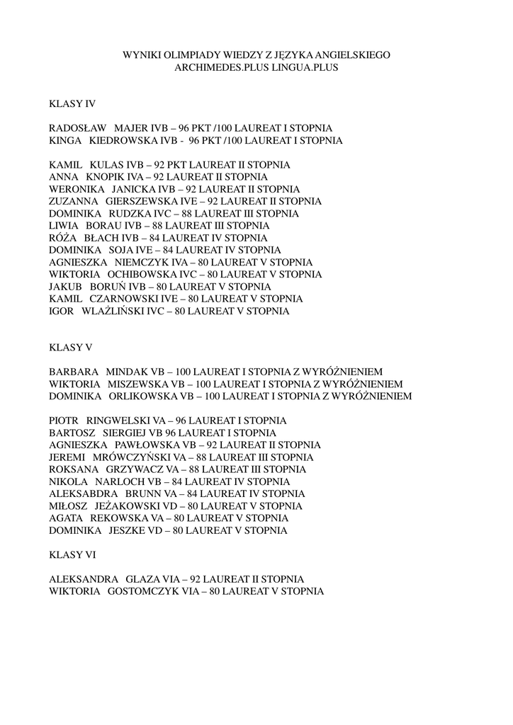 WYNIKI OLIMPIADY WIEDZY Z JĘZYKA ANGIELSKIEGO ARCHIMEDES.PLUS LINGUA.PLUS KLASY IV RADOSŁAW MAJER IVB – 96 PKT /100 LAUREAT I STOPNIA KINGA KIEDROWSKA IVB - 96 PKT /100 LAUREAT I STOPNIA KAMIL KULAS IVB – 92 PKT LAUREAT II STOPNIA ANNA KNOPIK IVA – 92 LAUREAT II STOPNIA WERONIKA JANICKA IVB – 92 LAUREAT II STOPNIA ZUZANNA GIERSZEWSKA IVE – 92 LAUREAT II STOPNIA DOMINIKA RUDZKA IVC – 88 LAUREAT III STOPNIA LIWIA BORAU IVB – 88 LAUREAT III STOPNIA RÓŻA BŁACH IVB – 84 LAUREAT IV STOPNIA DOMINIKA SOJA IVE – 84 LAUREAT IV STOPNIA AGNIESZKA NIEMCZYK IVA – 80 LAUREAT V STOPNIA WIKTORIA OCHIBOWSKA IVC – 80 LAUREAT V STOPNIA JAKUB BORUŃ IVB – 80 LAUREAT V STOPNIA KAMIL CZARNOWSKI IVE – 80 LAUREAT V STOPNIA IGOR WLAŻLIŃSKI IVC – 80 LAUREAT V STOPNIA KLASY V BARBARA MINDAK VB – 100 LAUREAT I STOPNIA Z WYRÓŻNIENIEM WIKTORIA MISZEWSKA VB – 100 LAUREAT I STOPNIA Z WYRÓŻNIENIEM DOMINIKA ORLIKOWSKA VB – 100 LAUREAT I STOPNIA Z WYRÓŻNIENIEM PIOTR RINGWELSKI VA – 96 LAUREAT I STOPNIA BARTOSZ SIERGIEJ VB 96 LAUREAT I STOPNIA AGNIESZKA PAWŁOWSKA VB – 92 LAUREAT II STOPNIA JEREMI MRÓWCZYŃSKI VA – 88 LAUREAT III STOPNIA ROKSANA GRZYWACZ VA – 88 LAUREAT III STOPNIA NIKOLA NARLOCH VB – 84 LAUREAT IV STOPNIA ALEKSABDRA BRUNN VA – 84 LAUREAT IV STOPNIA MIŁOSZ JEŻAKOWSKI VD – 80 LAUREAT V STOPNIA AGATA REKOWSKA VA – 80 LAUREAT V STOPNIA DOMINIKA JESZKE VD – 80 LAUREAT V STOPNIA KLASY VI ALEKSANDRA GLAZA VIA – 92 LAUREAT II STOPNIA WIKTORIA GOSTOMCZYK VIA – 80 LAUREAT V STOPNIA