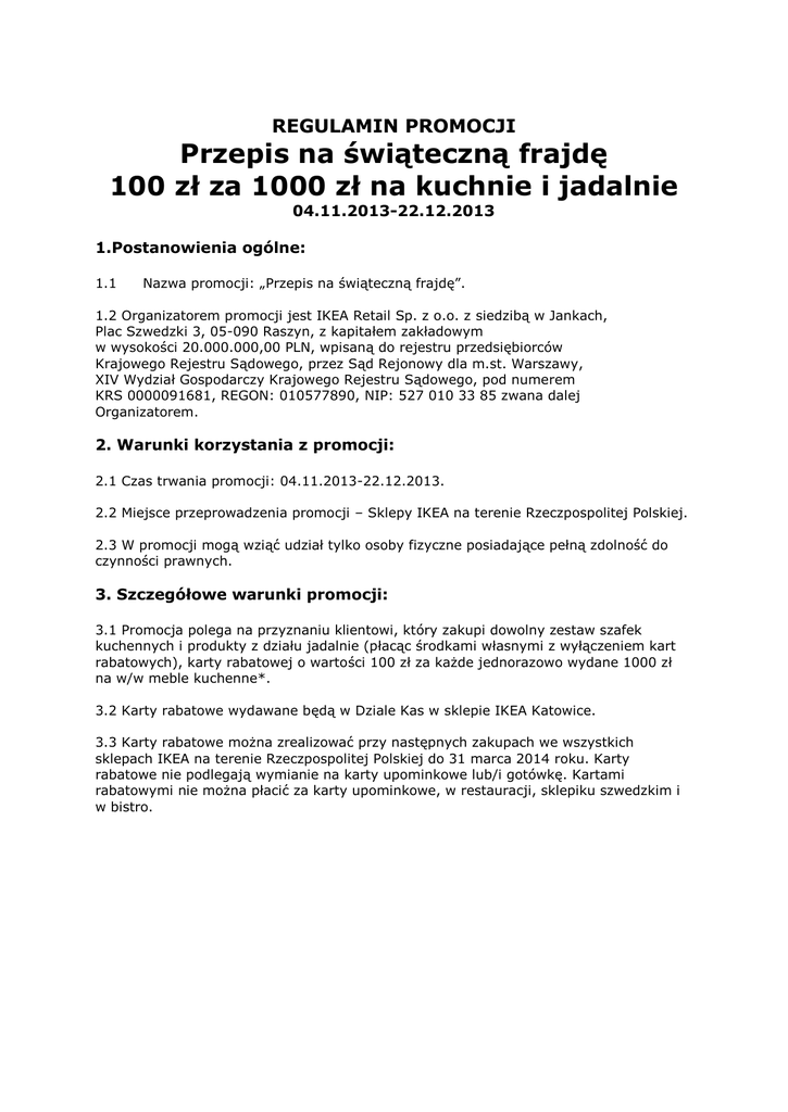 REGULAMIN PROMOCJI Przepis na świąteczną frajdę 100 zł za 1000 zł na kuchnie i jadalnie 04.11.2013-22.12.2013 1.Postanowienia ogólne: 1.1 Nazwa promocji: „Przepis na świąteczną frajdę”. 1.2 Organizatorem promocji jest IKEA Retail Sp. z o.o. z siedzibą w Jankach, Plac Szwedzki 3, 05-090 Raszyn, z kapitałem zakładowym w wysokości 20.000.000,00 PLN, wpisaną do rejestru przedsiębiorców Krajowego Rejestru Sądowego, przez Sąd Rejonowy dla m.st. Warszawy, XIV Wydział Gospodarczy Krajowego Rejestru Sądowego, pod numerem KRS 0000091681, REGON: 010577890, NIP: 527 010 33 85 zwana dalej Organizatorem. 2. Warunki korzystania z promocji: 2.1 Czas trwania promocji: 04.11.2013-22.12.2013. 2.2 Miejsce przeprowadzenia promocji – Sklepy IKEA na terenie Rzeczpospolitej Polskiej. 2.3 W promocji mogą wziąć udział tylko osoby fizyczne posiadające pełną zdolność do czynności prawnych. 3. Szczegółowe warunki promocji: 3.1 Promocja polega na przyznaniu klientowi, który zakupi dowolny zestaw szafek kuchennych i produkty z działu jadalnie (płacąc środkami własnymi z wyłączeniem kart rabatowych), karty rabatowej o wartości 100 zł za każde jednorazowo wydane 1000 zł na w/w meble kuchenne*. 3.2 Karty rabatowe wydawane będą w Dziale Kas w sklepie IKEA Katowice. 3.3 Karty rabatowe można zrealizować przy następnych zakupach we wszystkich sklepach IKEA na terenie Rzeczpospolitej Polskiej do 31 marca 2014 roku. Karty rabatowe nie podlegają wymianie na karty upominkowe lub/i gotówkę. Kartami rabatowymi nie można płacić za karty upominkowe, w restauracji, sklepiku szwedzkim i w bistro. 3.4 Warunki realizacji usługi montażu mebli kuchennych objętych niniejszą promocją odbywają się zgodnie z Ogólnymi Warunkami Świadczenia Usług Montażu Mebli dostępnymi w sklepach IKEA. Maksymalny czas wykonania kompleksowej usługi montażu to 3 tygodnie. Czas realizacji usługi liczony jest od momentu złożenia zamówienia w Punkcie Obsługi Transportowej(złożenie zamówienia musi nastąpić w trakcie trwania promocji „Przepis na świąteczną frajdę”). Klienci zainteresowani realizacją usługi montażu mebli kuchennych, aby kuchnia była zmontowana przed 22 grudnia 2013, muszą zakupić meble kuchenne i złożyć zamówienie na usługę montażu w Punkcie Sprzedaży Usług w wybranym sklepie IKEA najpóźniej do 1 grudnia 2013. Przesunięcie zleconego terminu usługi montażu w okresie promocji może spowodować brak możliwości wykonania usługi w terminie 3 tygodni od ponownego jej zlecenia. 3.5 W przypadku finansowania usług (np. transport, montaż, ect.) kredytem udzielonym przez Ikano Bank wycena dokonana w Punkcie Sprzedaży/Punkcie Obsługi Transportowej jest wyceną szacunkową. Ewentualna dopłata do usługi nastąpi po jej wykonaniu. Dopłata za usługę montażu jest możliwa tylko gotówką (jako potwierdzenie przyjęcia dopłaty firma transportowomontażowa wystawi pokwitowanie). W przypadku, gdy końcowa wartość serwisu jest niższa niż opłacona przez klienta w Kasie IKEA, Klient otrzyma kartę refundacyjną na wartość różnicy w Dziale Obsługi Klienta IKEA. 3.6 Zwrot artykułów zakupionych w promocji lub artykułów zakupionych z wykorzystaniem karty rabatowej oznacza jednocześnie rezygnację z promocji: a) Karta niewykorzystana - wartość karty musi zostać pomniejszona proporcjonalnie do wartości zwracanych artykułów promocyjnych. W przypadku zwrotu wszystkich artykułów następuje odbiór niewykorzystanej karty rabatowej. b) Karta wykorzystana częściowo - wartość karty musi zostać pomniejszona proporcjonalnie do wartości zwracanych artykułów promocyjnych. W przypadku, gdy wartość środków na karcie jest niewystarczająca brakujące środki zostaną potrącona z wartości zwracanych artykułów promocyjnych. c) Karta wykorzystana w całości - wartość karty zostanie potrącona proporcjonalnie do wartości zwracanych artykułów promocyjnych. 3.7. W przypadku reklamacji artykułów zakupionych w promocji lub artykułów zakupionych z wykorzystaniem karty rabatowej: a) Wymiana reklamowanych artykułów na identyczne oznacza zachowanie praw do promocji i wymianę na produkt identyczny bez ponoszenia dodatkowych kosztów lub potrąceń. b) Wymiana reklamowanych produktów na inne lub zwrot oznacza rezygnację z promocji, a sposób zwrotu przeprowadzony tak samo jak w punkcie 3.6. 3.8 Promocja nie obejmuje mebli kuchennych i artykułów ich wyposażenia zakupionych w Dziale Sprzedaży Okazyjnej oraz z ekspozycji. 4. Inne postanowienia: 4.1 Przystąpienie do promocji jest równoznaczne z potwierdzeniem zapoznania się klienta z treścią niniejszego Regulaminu i jego akceptacją. 4.2 Wszelkie reklamacje dotyczące promocji należy składać w formie pisemnej W terminie 14 dni od dnia uczestnictwa w promocji w Dziale Obsługi Klienta w Sklepie IKEA, w którym dokonano zakupu. 4.3 Pisemna reklamacja powinna zawierać: dane kontaktowe z Klientem tj. imię i nazwisko, adres, telefon oraz opis i powód reklamacji. 4.4 Roszczenia z tytułu udziału w promocji nie mogą być zgłaszane po upływie 14 dni od dnia zakończenia promocji. W przypadku przesłania reklamacji za pośrednictwem poczty, decyduje data nadania pisma w urzędzie pocztowym. Reklamacje będą rozpatrzone pisemnie w terminie 14 dni. Po wyczerpaniu postępowania reklamacyjnego uczestnikowi przysługuje prawo do dochodzenia nieuwzględnionych roszczeń we właściwym sądzie powszechnym. 4.5 Organizator zastrzega sobie prawo dokonywania zmian w niniejszym Regulaminie w trakcie trwania promocji. Zmienione warunki Regulaminu zostaną udostępnione na stronie internetowej IKEA.pl oraz w sklepach IKEA. Zmiana warunków Regulaminu pozostanie bez wpływu na nabyte przez klienta prawa przed wejściem w życie zmian w Regulaminie. *Zestaw mebli kuchennych IKEA i elementy wyposażenaia kuchni objęte promocja to: • • • • • • • • • • Obudowy szafek