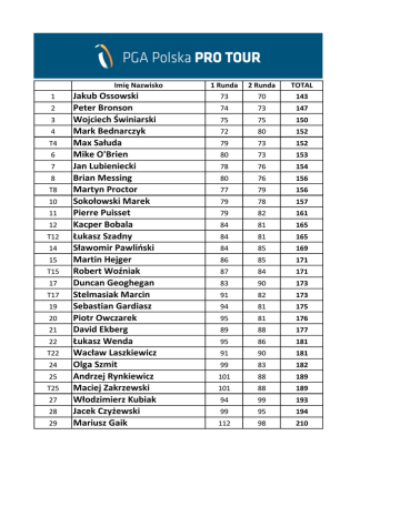 Imię Nazwisko 1 2 3 4 T4 6 7 8 T8 10 11 12 T12 14 15 T15 17 T17 19 20 21 22 T22 24 25 T25 27 28 29 Jakub Ossowski Peter Bronson Wojciech Świniarski Mark Bednarczyk Max Sałuda Mike O'Brien Jan Lubieniecki Brian Messing Martyn Proctor Sokołowski Marek Pierre Puisset Kacper Bobala Łukasz Szadny Sławomir Pawliński Martin Hejger Robert Woźniak Duncan Geoghegan Stelmasiak Marcin Sebastian Gardiasz Piotr Owczarek David Ekberg Łukasz Wenda Wacław Laszkiewicz Olga Szmit Andrzej Rynkiewicz Maciej Zakrzewski Włodzimierz Kubiak Jacek Czyżewski Mariusz Gaik 1 Runda 2 Runda TOTAL 73 70 143 74 73 147 75 75 150 72 80 152 79 73 152 80 73 153 78 76 154 80 76 156 77 79 156 79 78 157 79 82 161 84 81 165 84 81 165 84 85 169 86 85 171 87 84 171 83 90 173 91 82 173 94 81 175 95 81 176 89 88 177 95 86 181 91 90 181 99 83 182 101 88 189 101 88 189 94 99 193 99 95 194 112 98 210