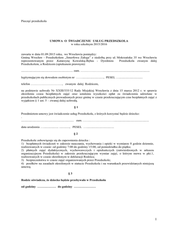 Pieczęć przedszkola UMOWA O ŚWIADCZENIU USŁUG PRZEDSZKOLA w roku szkolnym 2015/2016 zawarta w dniu 01.09.2015 roku, we Wrocławiu pomiędzy: Gminą Wrocław - Przedszkolem ,,Smerfowa Załoga” z siedzibą przy ul. Mokrzańska 35 we Wrocławiu reprezentowanym przez .Katarzynę Kowalską-Bębas - Dyrektora Przedszkola zwanym dalej Przedszkolem, a Rodzicem (opiekunem prawnym): .................................................................. zam. …………………............................................................ legitymującym się dowodem osobistym nr ……..........................., PESEL ….............................. telefon …………………………, zwanym dalej Rodzicem, na podstawie uchwały Nr XXIII/535/12 Rady Miejskiej Wrocławia z dnia 15 marca 2012 r. w sprawie określenia czasu bezpłatnych zajęć oraz ustalenia wysokości opłat za świadczenia udzielane w przedszkolach publicznych prowadzonych przez gminę w czasie przekraczającym czas bezpłatnych zajęć z wyjątkiem § 1 ust. 5 – zwanej dalej uchwałą. §1 Przedmiotem umowy jest świadczenie usług Przedszkola, z których korzystać będzie dziecko: . ................................................................... zam. …………………………............................................ data urodzenia …................... ............., PESEL …................................... §2 Przedszkole zobowiązuje się do zapewnienia dziecku : 1) bezpłatnych świadczeń w zakresie nauczania, wychowania i opieki w wymiarze 8 godzin dziennie, realizowanych w czasie: od godziny 7:00 do godziny 15:00, od poniedziałku do piątku; 2) płatnych zajęć dydaktycznych, wychowawczych i opiekuńczych (zatwierdzonych w arkuszu organizacyjnym Przedszkola) w zakresie przekraczającym wymiar zajęć, o którym mowa w pkt.1, realizowanych w czasie określonym w deklaracji Rodzica; 3) bezpieczeństwa w czasie zajęć organizowanych przez Przedszkole; 4) posiłków na zasadach określonych w statucie Przedszkola i na warunkach przewidzianych niniejszą umową. §3 Rodzic oświadcza, że dziecko będzie przebywało w Przedszkolu od godziny ……………… do godziny ………………… 1 §4 1. Dziecko korzystać będzie z: a. * I śniadanie b. * II śniadanie c. * zupa d. * drugie danie e. * podwieczorek * niepotrzebne skreślić 2. Rodzaj i godziny wydawania posiłków określa statut Przedszkola oraz procedura korzystania ze stołówki w Przedszkolu §5 Rodzic zobowiązuje się do: 1) zapoznania się z treścią statutu Przedszkola i przestrzegania jego postanowień, 2) współpracy z Przedszkolem w szczególności w zakresie spraw związanych z przebiegiem procesu wychowawczo-dydaktycznego, którego uczestnikiem jest jego dziecko, 3) przyprowadzania do Przedszkola zdrowego dziecka i niezwłocznego powiadomienia w przypadku choroby zakaźnej, 4) powiadomienia Przedszkola o terminie nieobecności dziecka, nie później niż w drugim dniu nieobecności, 5) wniesienia pisemnego usprawiedliwienia w terminie 7 dni, po zakończeniu nieobecności dziecka powyżej 30 dni kalendarzowych, spowodowanych sytuacją zdrowotną, 6) terminowego wnoszenia opłat z tytułu korzystania przez dziecko ze świadczeń Przedszkola do 15 dnia każdego miesiąca, 7) przyprowadzani i terminowego odbierania dziecka z Przedszkola przez Rodziców lub przez osobę wskazaną przez nich w pisemnym upoważnieniu, wystawionym w obecności dyrektora lub nauczyciela Przedszkola. §6 1. Rodzic zobowiązuje się wnosić na rzecz Przedszkola, z tytułu świadczonych usług opłatę miesięczną składającą się z: 1/odpłatności za catering w kwocie 12,50 zł za dzień wg zamówienia, rozliczane na koniec miesiąca 2/ opłatę za świadczenia wymienione w § 2 pkt 2 w kwocie ……..………….. zł (słownie: ………………………………………..……………………………… ..…../100 złotych), 2. Opłatę za świadczenia opisane w § 2 pkt 2 ustala się za czas zadeklarowany przez rodzica w § 4 niniejszej umowy. §7 2 Rodzic zobowiązuje się do wniesienia opłaty miesięcznej, o której mowa w § 7 ust. 2, do dnia 15 każdego miesiąca z góry, przelewem na rachunek bankowy: 27 1140 2004 0000 3702 7560 3888 VT sp. z o.o. ul. Podolska 24/24b, 54-620 Wrocław. 1. Termin płatności oznacza dzień wpływu należności na w/w rachunek bankowy lub wpłaty do kasy ZOJM. 2. W razie nieobecności dziecka w Przedszkolu, opłata miesięczna ulega proporcjonalnemu obniżeniu, odpowiednio do liczby dni nieobecności. Rozliczenie następuje poprzez obniżenie opłaty w kolejnym miesiącu. 3. W celu rozliczeń opłaty miesięcznej strony umowy przyjmują 21 dni roboczych jako uśrednioną liczbę dni w miesiącu. Opłata podlega zaokrągleniu do dwóch miejsc po przecinku. §8 W przypadku przyjęcia dziecka do Przedszkola w trakcie trwania miesiąca, Rodzic wnosi opłatę miesięczną liczoną proporcjonalnie od dnia korzystania dziecka z usług Przedszkola. §9 1. W razie zwłoki w zapłacie opłaty miesięcznej za dwa pełne okresy płatności, Przedszkole może rozwiązać umowę bez zachowania terminu wypowiedzenia, po uprzednim pisemnym wezwaniu Rodzica do zapłaty, z określeniem siedmiodniowego terminu płatności zaległej należności. 2. Przedszkole może rozwiązać umowę bez wypowiedzenia w przypadku braku pisemnego usprawiedliwienia ciągłej nieobecności dziecka, trwającej co najmniej 30 dni kalendarzowych, o której mowa w § 6 pkt. 5. 3. Przedszkole może rozwiązać umowę bez wypowiedzenia w przypadku skreślenia dziecka z listy wychowanków w przypadkach określonych w Statucie Przedszkola. 4. W przypadku 3-krotnego nieuzasadnionego przekroczenia w ciągu miesiąca zadeklarowanych przez Rodzica godzin dziennego pobytu dziecka w Przedszkolu: 1) Strony umowy ponownie uaktualniają czas pobytu dziecka. 2) Strony wprowadzają przedmiotową zmianę w formie pisemnego aneksu do umowy, pod rygorem 