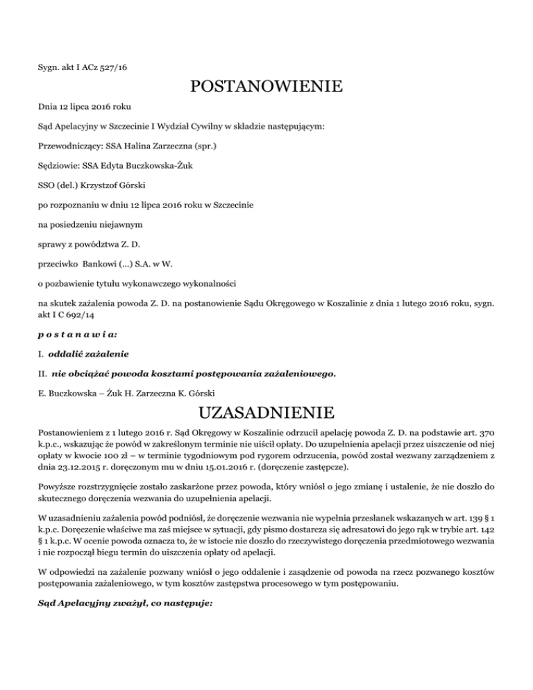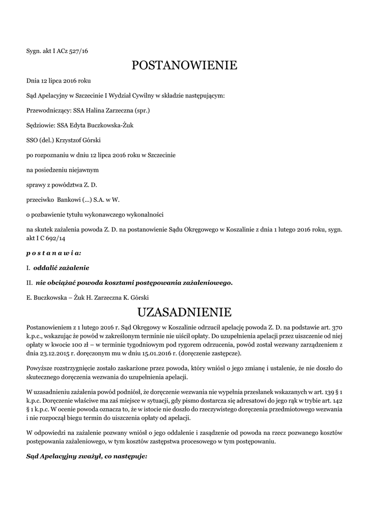 Sygn. akt I ACz 527/16 POSTANOWIENIE Dnia 12 lipca 2016 roku Sąd Apelacyjny w Szczecinie I Wydział Cywilny w składzie następującym: Przewodniczący: SSA Halina Zarzeczna (spr.) Sędziowie: SSA Edyta Buczkowska-Żuk SSO (del.) Krzystzof Górski po rozpoznaniu w dniu 12 lipca 2016 roku w Szczecinie na posiedzeniu niejawnym sprawy z powództwa Z. D. przeciwko Bankowi (...) S.A. w W. o pozbawienie tytułu wykonawczego wykonalności na skutek zażalenia powoda Z. D. na postanowienie Sądu Okręgowego w Koszalinie z dnia 1 lutego 2016 roku, sygn. akt I C 692/14 p o s t a n a w i a: I. oddalić zażalenie II. nie obciążać powoda kosztami postępowania zażaleniowego. E. Buczkowska – Żuk H. Zarzeczna K. Górski UZASADNIENIE Postanowieniem z 1 lutego 2016 r. Sąd Okręgowy w Koszalinie odrzucił apelację powoda Z. D. na podstawie art. 370 k.p.c., wskazując że powód w zakreślonym terminie nie uiścił opłaty. Do uzupełnienia apelacji przez uiszczenie od niej opłaty w kwocie 100 zł – w terminie tygodniowym pod rygorem odrzucenia, powód został wezwany zarządzeniem z dnia 23.12.2015 r. doręczonym mu w dniu 15.01.2016 r. (doręczenie zastępcze). Powyższe rozstrzygnięcie zostało zaskarżone przez powoda, który wniósł o jego zmianę i ustalenie, że nie doszło do skutecznego doręczenia wezwania do uzupełnienia apelacji. W uzasadnieniu zażalenia powód podniósł, że doręczenie wezwania nie wypełnia przesłanek wskazanych w art. 139 § 1 k.p.c. Doręczenie właściwe ma zaś miejsce w sytuacji, gdy pismo dostarcza się adresatowi do jego rąk w trybie art. 142 § 1 k.p.c. W ocenie powoda oznacza to, że w istocie nie doszło do rzeczywistego doręczenia przedmiotowego wezwania i nie rozpoczął biegu termin do uiszczenia opłaty od apelacji. W odpowiedzi na zażalenie pozwany wniósł o jego oddalenie i zasądzenie od powoda na rzecz pozwanego kosztów postępowania zażaleniowego, w tym kosztów zastępstwa procesowego w tym postępowaniu. Sąd Apelacyjny zważył, co następuje: Zażalenie powoda jako nieuzasadnione podlegało oddaleniu. Powód w zażaleniu skupił się na wykazaniu, że doręczenie właściwe ma miejsce jedynie w sposób opisany w art. 142 § 1 k.p.c. W przepisie tym został jednak określony jedynie sposób prawidłowego potwierdzenia odbioru pism. Natomiast instytucja doręczenia właściwego uregulowana jest w art. 132 – 138 k.p.c. W sprawie znalazła zastosowanie instytucja doręczenia zastępczego, która została uregulowana w art. 139 k.p.c. W pierwszej kolejności podkreślić należy zatem, że doręczenia dokonana zgodnie z art. 138 i 139 k.p.c. oparte są na domniemaniu, że pismo sądowe dotarło do rąk adresata i że w ten sposób doręczenie zostało dokonane prawidłowo. W niniejszej sprawie powód nie kwestionował zaś, że pismo do niego adresowane nie było prawidłowo awizowane, czy też, że osoba, której pismo doręczono zastępczo, bądź urząd, w którym je złożono, nie oddały mu pisma. Powód zatem nie zdołał skutecznie obalić domniemania prawidłowego awizowania pisma wzywającego do uiszczenia brakującej opłaty od apelacji. Powód pod adresem, na który zostało wysłane pismo zawierające zobowiązanie do uiszczenia braków fiskalnych, odbierał inne przesyłki sądowe. Z. D. nie informował sądu o zmianie tego adresu, w związku z czym Sąd Okręgowy miał podstawy domniemywać, że powód przebywa pod tym adresem. W razie niemożności dokonania właściwego doręczenia pisma powodowi, który jest osobą fizyczną, w trybie art. 133 § 1 k.p.c. bądź w trybie art. 138 k.p.c., doręczyciel pozostawia je stosownie do art. 139 § 1 k.p.c. w urzędzie pocztowym, zawiadamiając o tym adresata w miejscu jego zamieszkania ze wskazaniem, gdzie i kiedy pismo pozostawiono, oraz z pouczeniem, że należy je odebrać w terminie siedmiu dni od dnia umieszczenia zawiadomienia. Jeżeli zostaną spełnione przesłanki określone w omawianym przepisie, pismo uważa się za doręczone, nawet jeśli adresat faktycznie go nie otrzymał. A zatem wbrew twierdzeniom skarżącego, nawet jeśli nie dokonał on technicznej czynności potwierdzenia dokonania odbioru pisma zgodnie z dyspozycją art.. 142 k.p.c. jeżeli pismo sądowe przesłane pod właściwy adres strony nie zostało podjęte w awizowanym terminie, należy pozostawić je w aktach sprawy ze skutkiem doręczenia, przyjmując, że zostało doręczone w dniu, w którym upłynął termin do jego odbioru w oddawczym urzędzie pocztowym (por. uchwałę składu siedmiu sędziów Sądu Najwyższego z dnia 10 maja 1971 r., III CZP 10/71, OSNCP 1971 nr 11, poz. 187). Na przesyłce adresowanej do powoda, zawierającej zobowiązanie do uiszczenia brakującej opłaty od apelacji, znajdują się opatrzone stemplami operatora pocztowego i podpisami adnotacje, z których wynika, że w dniu 31 grudnia 2015 r. podjęto próbę jego doręczenia na adres powoda i awizowano po raz pierwszy ze względu na nieobecność adresata, w dniu 8 stycznia 2016 r. awizowano powtórnie, a w dniu 18 stycznia 2016 r. dokonano zwrotu przesyłki ze względu na jej niepodjęcie w terminie. Do tego dnia przesyłka pozostawała w placówce operatora pocztowego. W ocenie Sądu Apelacyjnego pozwala to na przyjęcie, że w rozpoznawanej sprawie zostały spełnione wszystkie przesłanki skutecznego doręczenia pisma w sposób przewidziany w art. 139 § 1 k.p.c., a Sąd I instancji prawidłowo posłużył się instytucją przewidzianą w tym przepisie. Z akt sprawy nie wynika, żeby Z. D. starał się obalić prawdziwość adnotacji poczynionych przez operatora pocztowego na przesłanej mu przesyłce. Ciężar zaś dowodu, że adnotacje te poświadczają nieprawdę spoczywa bowiem na osobie twierdzącej, że pismo sądowe nie zostało jej prawidłowo doręczone, a więc na powodzie. Tymczasem skarżący nie przedstawił żadnych dowodów, które by potwierdzały, że przesyłka nie została mu prawidłowo d