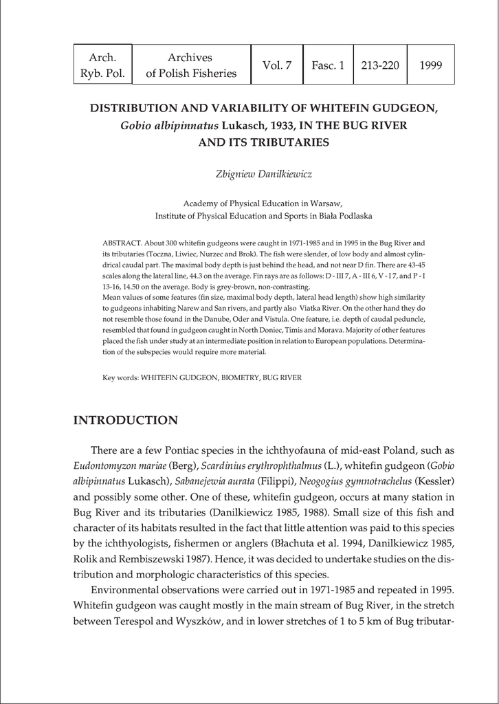 Arch. Ryb. Pol. Archives of Polish Fisheries Vol. 7 Fasc. 1 213-220 1999 DISTRIBUTION AND VARIABILITY OF WHITEFIN GUDGEON, Gobio albipinnatus Lukasch, 1933, IN THE BUG RIVER AND ITS TRIBUTARIES Zbigniew Danilkiewicz Academy of Physical Education in Warsaw, Institute of Physical Education and Sports in Bia³a Podlaska ABSTRACT. About 300 whitefin gudgeons were caught in 1971-1985 and in 1995 in the Bug River and its tributaries (Toczna, Liwiec, Nurzec and Brok). The fish were slender, of low body and almost cylindrical caudal part. The maximal body depth is just behind the head, and not near D fin. There are 43-45 scales along the lateral line, 44.3 on the average. Fin rays are as follows: D - III 7, A - III 6, V - I 7, and P - I 13-16, 14.50 on the average. Body is grey-brown, non-contrasting. Mean values of some features (fin size, maximal body depth, lateral head length) show high similarity to gudgeons inhabiting Narew and San rivers, and partly also Viatka River. On the other hand they do not resemble those found in the Danube, Oder and Vistula. One feature, i.e. depth of caudal peduncle, resembled that found in gudgeon caught in North Doniec, Timis and Morava. Majority of other features placed the fish under study at an intermediate position in relation to European populations. Determination of the subspecies would require more material. Key words: WHITEFIN GUDGEON, BIOMETRY, BUG RIVER INTRODUCTION There are a few Pontiac species in the ichthyofauna of mid-east Poland, such as Eudontomyzon mariae (Berg), Scardinius erythrophthalmus (L.), whitefin gudgeon (Gobio albipinnatus Lukasch), Sabanejewia aurata (Filippi), Neogogius gymnotrachelus (Kessler) and possibly some other. One of these, whitefin gudgeon, occurs at many station in Bug River and its tributaries (Danilkiewicz 1985, 1988). Small size of this fish and character of its habitats resulted in the fact that little attention was paid to this species by the ichthyologists, fishermen or anglers (B³achuta et al. 1994, Danilkiewicz 1985, Rolik and Rembiszewski 1987). Hence, it was decided to undertake studies on the distribution and morphologic characteristics of this species. Environmental observations were carried out in 1971-1985 and repeated in 1995. Whitefin gudgeon was caught mostly in the main stream of Bug River, in the stretch between Terespol and Wyszków, and in lower stretches of 1 to 5 km of Bug tributar- 214 Z. DANILKIEWICZ Fig. 1. Scheme of the study area. 1 - Œlipicze, 2 - Czumów, 3 - Orchówek, 4 - £êgi, 5 - Stary Bubel, 6 - Niemirów, 7 - Sutno, 8 - Serpelice, 9- Klepaczew, 10 - Zabu¿e, 11 - Kózki, 12 - Zajêczniki, 13 - Wojtkowice, 14 £ochów, 15 - Kamieñczyk DISTRIBUTION AND VARIABILITY OF WHITEFIN GUDGEON 215 ies: Toczna, Liwiec, Nurzec and Brok. Single individuals, almost always juveniles, were caught in the Bug near Hrubieszów, in Œlipcz and Czumow, and in Orchówek near W³odawa. Large schools were present in Bug River at all sandy stations, especially at £êgi, Stary Bubel, Niemirów, Sutno, Sarpelice, Klepaczew, Mielnik, Kózki, Zajêczniki, Wojtkowice and Kamieñczyk, and in Liwiec River, between £ochów and Kamieñczyk (Fig. 1). Fish concentrated at the depth from 1 to 3 m. In summer feeding schools were frequently observed in shallower current, about 0.5 m in depth, often mixed with Gobio gobio (L.). Gudgeons were at all stations accompanied by roach, Rutilis rutilus (L), Leuciscus leuciscus (L.), Cobitis taenia L., Sabanejwia aurata (Filippi), and in 1995, between Terespol and Drohiczyn, also by Neogobius gymnotrachelus. At £êgi, in the mainstream of the Bug River, also Rhodeus sericeus (Pallas) appeared in masses in the last year of the study. MATERIAL AND METHODS Basic fishing gear was used: a trawl and dip nets, made of net of mesh size 1 cm2, and of mill gauze. Totally 300 whitefin gudgeons were caught. Small fish dominated, mostly juveniles. Only 40 mature fish were kept, the rest was released due to the need of protecting this species in Poland. The materials collected were compared with those exhibited in the Museum of the Institute of Zoology, PAS, in Warsaw, which originate from other Polish rivers as well as rivers of Ukraine and Rumania. Comparisons were also made with the exhibits owned by the Natural Museum of Wroc³aw University, originating from Oder River basin. Sexually mature fish were selected for the examination, which had well developed species diagnostic features (Lukasch 1933). The materials contained also some fish of intermediate features between whitefin gudgeon and common gudgeon. Most frequent similarities consisted of body shape, colouring of body and fins and presence of ornamental scales. It was assumed after Lukasch (1933) that the following characters enable classification to species: 1) whitefin gudgeon fins were transparent, only D, C and A had one or two rows of small spots, 2) anus located in from of the middle point between V and A, 3) barbs reached at least vertical eye diameter, 4) scales of the dorsal part, mostly in front and under D, noticeably waved, 5) isthmus and body part between pectoral fins without scales. All these characters had to be present to classify a specimen as Gobio albipinnatus Lukasch, i.e. all examined specimens were typical „albipinnata, prosopyga et longicirris” forms (Lukasch 1933, Berg 1949). Biometric measurements were made 216 Z. DANILKIEWICZ directly after fish preservation, up to 0.1 mm, at the left-side of the body. Scheme of measurements was adopted from Pravdin (1939), and character symbols were taken from Bryliñska (1991). RESULTS Whitefin gudgeon body is elongated, rounded, shallow (width amounts on the average to 80.26 % of body depth), with an almost cylindrical caudal peduncle (its width represents 98.06 % of the smallest body depth). Maximal body depth is found just behind the head, and dorsal line of almost all specimens arches, with no break at the front of dorsal fin (the latter character was mentione