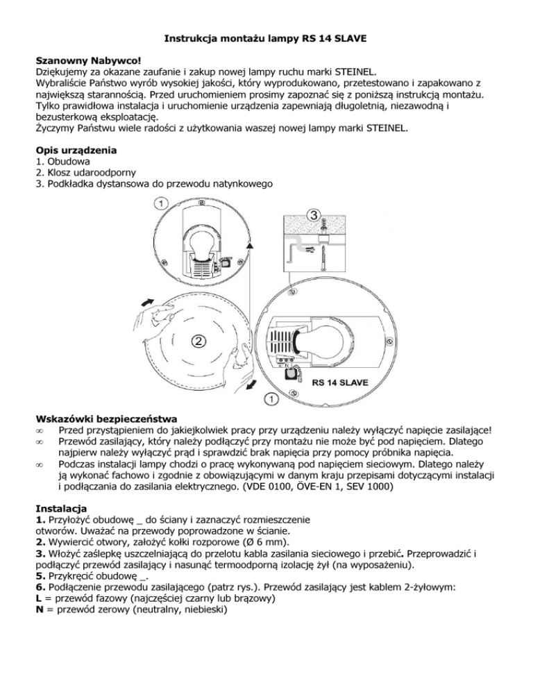 Instrukcja montażu lampy RS 14 SLAVE Szanowny Nabywco! Dziękujemy za okazane zaufanie i zakup nowej lampy ruchu marki STEINEL. Wybraliście Państwo wyrób wysokiej jakości, który wyprodukowano, przetestowano i zapakowano z największą starannością. Przed uruchomieniem prosimy zapoznać się z poniższą instrukcją montażu. Tylko prawidłowa instalacja i uruchomienie urządzenia zapewniają długoletnią, niezawodną i bezusterkową eksploatację. Życzymy Państwu wiele radości z użytkowania waszej nowej lampy marki STEINEL. Opis urządzenia 1. Obudowa 2. Klosz udaroodporny 3. Podkładka dystansowa do przewodu natynkowego Wskazówki bezpieczeństwa • Przed przystąpieniem do jakiejkolwiek pracy przy urządzeniu należy wyłączyć napięcie zasilające! • Przewód zasilający, który należy podłączyć przy montażu nie może być pod napięciem. Dlatego najpierw należy wyłączyć prąd i sprawdzić brak napięcia przy pomocy próbnika napięcia. • Podczas instalacji lampy chodzi o pracę wykonywaną pod napięciem sieciowym. Dlatego należy ją wykonać fachowo i zgodnie z obowiązującymi w danym kraju przepisami dotyczącymi instalacji i podłączania do zasilania elektrycznego. (VDE 0100, ÖVE-EN 1, SEV 1000) Instalacja 1. Przyłożyć obudowę _ do ściany i zaznaczyć rozmieszczenie otworów. Uważać na przewody poprowadzone w ścianie. 2. Wywiercić otwory, założyć kołki rozporowe (Ø 6 mm). 3. Włożyć zaślepkę uszczelniającą do przelotu kabla zasilania sieciowego i przebić. Przeprowadzić i podłączyć przewód zasilający i nasunąć termoodporną izolację żył (na wyposażeniu). 5. Przykręcić obudowę _. 6. Podłączenie przewodu zasilającego (patrz rys.). Przewód zasilający jest kablem 2-żyłowym: L = przewód fazowy (najczęściej czarny lub brązowy) N = przewód zerowy (neutralny, niebieski) Dane techniczne Moc: RS 14slave: max. 60 W/E 27 Zasilanie: 230 – 240 V, 50 Hz Miejsce zastosowania: wewnątrz budynków, montaż na ścianie/suficie Deklaracja zgodności z normami Firma STEINEL GmbH, Dieselstraße 80–84, D-33442 Herzebrock oświadcza, ze lampa wewnętrzna z czujnikiem ruchu spełnia wymogi następujących dyrektyw i norm: Dyrektywy w sprawie urządzeń niskiego napięcia 73/23/EWG, dyrektywy o zgodności elektromagnetycznej 89/336/EWG, dyrektywy R & TTE 1999/5/WE o urządzeniach radiowych i telekomunikacyjnych urządzeniach nadawczych, EN 60598, ETS 300 683, ETS 300 440 Herzebrock, wrzesień 2004. Lampa RS 14 spełnia wymogi dla urządzeń pracujących w II klasie ochronności co jest oznaczone na tabliczce znamionowej. Gwarancja funkcjonowania Poniższy produkt firmy STEINEL został bardzo starannie wykonany. Prawidłowe działanie i bezpieczeństwo użytkowania potwierdzają przeprowadzane losowo kontrole jakości oraz zgodność z obowiązującymi przepisami. Firma STEINEL udziela gwarancji na prawidłową jakość i działanie. Okres gwarancji wynosi 36 miesięcy i rozpoczyna się z dniem sprzedaży użytkownikowi. W okresie gwarancyjnym producent usuwa braki spowodowane wadami materiałowymi lub wykonawczymi, świadczenie gwarancyjne polega na naprawie lub wymianie wadliwych części wg wyboru producenta. Gwarancja nie obejmuje uszkodzenia części podlegających zużyciu eksploatacyjnemu, uszkodzeń i usterek spowodowanych przez nieprawidłową obsługę lub konserwację. Gwarancja nie obejmuje odpowiedzialności za szkody wtórne powstałe na przedmiotach trzecich. Gwaracja udzielana jest tylko w przypadku, jeżeli prawidłowo zapakowane urządzenie (nierozłożone na części) wraz z krótkim opisem usterek i z paragonem lub rachunkiem zakupu (opatrzonym datą zakupu i pieczątką sklepu) odesłane zostanie do odpowiedniego punktu serwisowego. Serwis naprawczy: Po upływie okresu gwarancji albo w razie usterek nie objętych gwarancją naprawy wykonuje nasz serwis firmowy. Prosimy o przesłanie dobrze zapakowanego przyrządu do najbliższej placówki serwisowej.