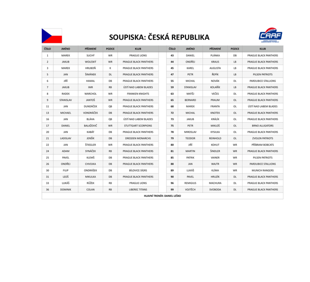 SOUPISKA:ČESKÁREPUBLIKA ČÍSLO JMÉNO PŘÍJMENÍ POZICE KLUB ČÍSLO JMÉNO PŘÍJMENÍ POZICE KLUB 1 MAREK SUCHÝ WR PRAGUELIONS 43 DANIEL PLÁNKA DB PRAGUEBLACKPANTHERS 2 JAKUB WOLESKÝ WR PRAGUEBLACKPANTHERS 44 ONDŘEJ KRAUS LB PRAGUEBLACKPANTHERS 3 MAREK HRUBOŇ K PRAGUEBLACKPANTHERS 45 KAREL AUGUSTA LB PRAGUEBLACKPANTHERS 5 JAN ŠIMÁNEK DL PRAGUEBLACKPANTHERS 47 PETR ŘEPÍK LB PILSENPATRIOTS 6 JIŘÍ HAMAL DB PRAGUEBLACKPANTHERS 55 MICHAL NOVÁK DL PARDUBICESTALLIONS 7 JAKUB IMR RB ÚSTÍNADLABEMBLADES 59 STANISLAV KOLAŘÍK LB PRAGUEBLACKPANTHERS 8 RADEK WARCHOL WR FRANKENKNIGHTS 63 MATĚJ VEČES DL PRAGUEBLACKPANTHERS 9 STANISLAV JANTOŠ WR PRAGUEBLACKPANTHERS 65 BERNARD PRAUM OL PRAGUEBLACKPANTHERS 11 JAN DUNDÁČEK QB PRAGUEBLACKPANTHERS 68 MAREK FRANTA OL ÚSTÍNADLABEMBLADES 13 MICHAEL VONDRÁČEK DB PRAGUEBLACKPANTHERS 72 MICHAL KNOTEK OL PRAGUEBLACKPANTHERS 16 JAN BLÁHA QB ÚSTÍNADLABEMBLADES 73 JAKUB KRÁLÍK OL PRAGUEBLACKPANTHERS 17 DANIEL BALAŽOVIČ WR STUTTGARTSCORPIONS 75 PETR MIKLOŠ OL BRNOALLIGATORS 20 JAN KABÁT DB PRAGUEBLACKPANTHERS 78 MIROSLAV KYSILKA OL PRAGUEBLACKPANTHERS 21 LADISLAV JENŠÍK DB DRESDENMONARCHS 79 TEODOR REINHOLD OL ZVOLENPATRIOTS 22 JAN ŠTIEGLER WR PRAGUEBLACKPANTHERS 80 JIŘÍ KOHUT WR PŘÍBRAMBOBCATS 24 ADAM SYNÁČEK RB PRAGUEBLACKPANTHERS 81 MARTIN ŠINDLER WR PRAGUEBLACKPANTHERS 25 PAVEL KLEMŠ DB PRAGUEBLACKPANTHERS 85 PATRIK VAINER WR PILSENPATRIOTS 26 ONDŘEJ CHVOJKA DB PRAGUEBLACKPANTHERS 88 JAN WAJTR WR PARDUBICESTALLIONS 30 FILIP ONDRÁŠEK DB BÍLOVICESÍGRS 89 LUKÁŠ KLÍMA WR MUNICHRANGERS 31 LEOŠ MIKULKA DB PRAGUEBLACKPANTHERS 90 PAVEL HRUZÍK DL PRAGUEBLACKPANTHERS 33 LUKÁŠ RŮŽEK RB PRAGUELIONS 96 REMIGIUS MACHURA DL PRAGUEBLACKPANTHERS 36 DOMINIK COLAN RB LIBERECTITANS 99 VOJTĚCH SVOBODA DL PRAGUEBLACKPANTHERS HLAVNÍTRENÉR:DANIELLEŠKO