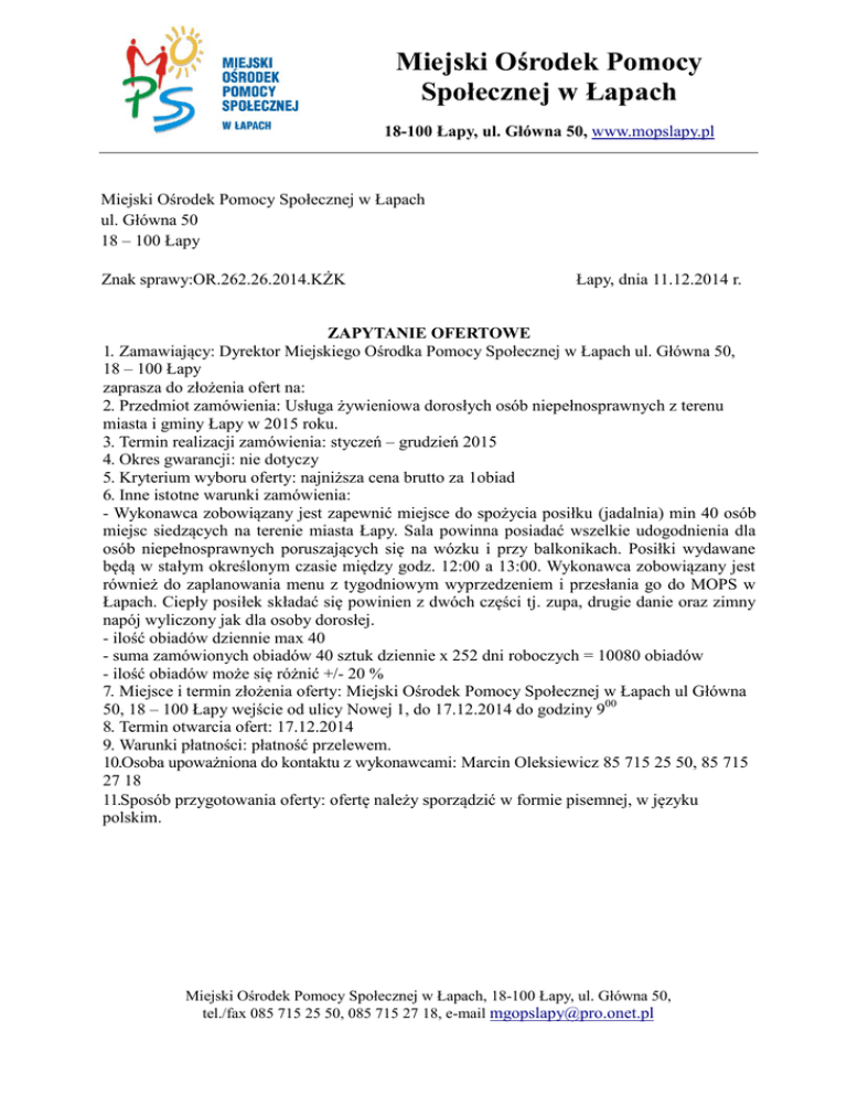 Miejski Ośrodek Pomocy Społecznej w Łapach 18-100 Łapy, ul. Główna 50, www.mopslapy.pl Miejski Ośrodek Pomocy Społecznej w Łapach ul. Główna 50 18 – 100 Łapy Znak sprawy:OR.262.26.2014.KŻK Łapy, dnia 11.12.2014 r. ZAPYTANIE OFERTOWE 1. Zamawiający: Dyrektor Miejskiego Ośrodka Pomocy Społecznej w Łapach ul. Główna 50, 18 – 100 Łapy zaprasza do złożenia ofert na: 2. Przedmiot zamówienia: Usługa żywieniowa dorosłych osób niepełnosprawnych z terenu miasta i gminy Łapy w 2015 roku. 3. Termin realizacji zamówienia: styczeń – grudzień 2015 4. Okres gwarancji: nie dotyczy 5. Kryterium wyboru oferty: najniższa cena brutto za 1obiad 6. Inne istotne warunki zamówienia: - Wykonawca zobowiązany jest zapewnić miejsce do spożycia posiłku (jadalnia) min 40 osób miejsc siedzących na terenie miasta Łapy. Sala powinna posiadać wszelkie udogodnienia dla osób niepełnosprawnych poruszających się na wózku i przy balkonikach. Posiłki wydawane będą w stałym określonym czasie między godz. 12:00 a 13:00. Wykonawca zobowiązany jest również do zaplanowania menu z tygodniowym wyprzedzeniem i przesłania go do MOPS w Łapach. Ciepły posiłek składać się powinien z dwóch części tj. zupa, drugie danie oraz zimny napój wyliczony jak dla osoby dorosłej. - ilość obiadów dziennie max 40 - suma zamówionych obiadów 40 sztuk dziennie x 252 dni roboczych = 10080 obiadów - ilość obiadów może się różnić +/- 20 % 7. Miejsce i termin złożenia oferty: Miejski Ośrodek Pomocy Społecznej w Łapach ul Główna 50, 18 – 100 Łapy wejście od ulicy Nowej 1, do 17.12.2014 do godziny 900 8. Termin otwarcia ofert: 17.12.2014 9. Warunki płatności: płatność przelewem. 10.Osoba upoważniona do kontaktu z wykonawcami: Marcin Oleksiewicz 85 715 25 50, 85 715 27 18 11.Sposób przygotowania oferty: ofertę należy sporządzić w formie pisemnej, w języku polskim. Miejski Ośrodek Pomocy Społecznej w Łapach, 18-100 Łapy, ul. Główna 50, tel./fax 085 715 25 50, 085 715 27 18, e-mail [email protected] Miejski Ośrodek Pomocy Społecznej w Łapach 18-100 Łapy, ul. Główna 50, www.mopslapy.pl 12. Treść oferty: 12.1 nazwa wykonawcy ........................................................................................................... 12.2 adres wykonawcy ............................................................................................................ 12.3 NIP ............................................................................................................................. 12.4 regon ................................................................................................................................ 12.5 nr rachunku bankowego ................................................................................................. 12.6 Oferuję wykonanie przedmiotu zamówienia za: Cenę netto..................................... zł (słownie złotych ........................................................... ................................................................................... ) Podatek VAT ................................. zł (słownie złotych ........................................................... ........................................................ ) Cenę brutto .................................... zł (słownie złotych ........................................................... ........................................................ ) 12.7. Oświadczam, że zapoznałem się z opisem przedmiotu zamówienia i nie wnoszę do niego zastrzeżeń. 12.8. Termin realizacji zamówienia ................................................................... 12.9. Okres gwarancji: brak 12.10 Potwierdzam termin realizacji zamówienia do dnia ................................... 12.11 Wyrażam zgodę na warunki płatności określone w zapytaniu cenowym. dnia........................... ………………………………………….. (podpis wykonawcy lub osoby upoważnionej) ……………………………… (pieczątka wykonawcy) Miejski Ośrodek Pomocy Społecznej w Łapach, 18-100 Łapy, ul. Główna 50, tel./fax 085 715 25 50, 085 715 27 18, e-mail [email protected]
