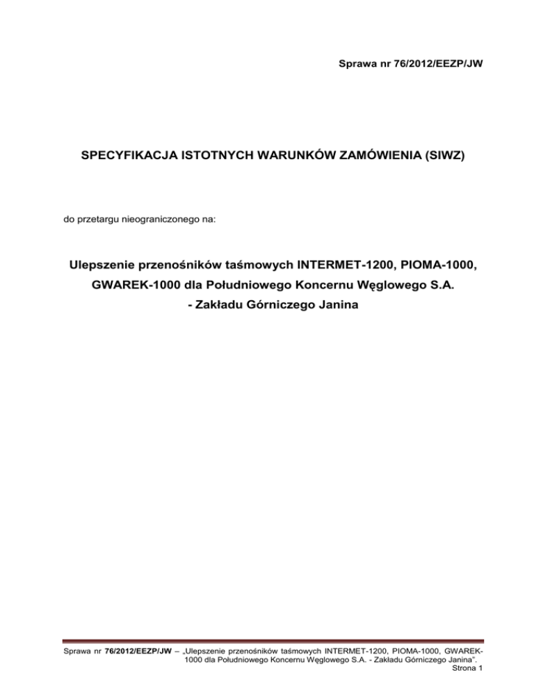 Sprawa nr 76/2012/EEZP/JW SPECYFIKACJA ISTOTNYCH WARUNKÓW ZAMÓWIENIA (SIWZ) do przetargu nieograniczonego na: Ulepszenie przenośników taśmowych INTERMET-1200, PIOMA-1000, GWAREK-1000 dla Południowego Koncernu Węglowego S.A. - Zakładu Górniczego Janina Sprawa nr 76/2012/EEZP/JW – „Ulepszenie przenośników taśmowych INTERMET-1200, PIOMA-1000, GWAREK1000 dla Południowego Koncernu Węglowego S.A. - Zakładu Górniczego Janina”. Strona 1 NAZWA I ADRES ZAMAWIAJĄCEGO Południowy Koncern Węglowy S.A. 43 – 600 Jaworzno, ul. Grunwaldzka 37 Adres internetowy (URL): www.pkwsa.pl Wydział Zamówień Publicznych: godziny urzędowania - od 7:00 do 15:00; fax +48 32 615 08 62 lub +48 32 615 59 42, tel. +48 32 618 50 31 Kancelaria Główna - czynna w godzinach od 7:00 do 15:00 TRYB UDZIELENIA ZAMÓWIENIA Przetarg nieograniczony Podstawa prawna: art. 134 ust. 1 oraz art. 39 ustawy z dnia 29 stycznia 2004 r. Prawo zamówień publicznych (tekst jedn. Dz. U. z 2010 r. Nr 113, poz. 759 z późn. zm.). PRZEDMIOT ZAMÓWIENIA Nazwa nadana przez Zamawiającego: Ulepszenie przenośników taśmowych INTERMET-1200, PIOMA-1000, GWAREK1000 dla Południowego Koncernu Węglowego S.A. - Zakładu Górniczego Janina Nazwa wg Wspólnego Słownika Zamówień: Kod CPV: 42419800 „Różny sprzęt transportowy i części zapasowe”. Kod CPV Uzupełniający: IA31-9 „Ulepszenia”, IA10-6 „Modernizacja” Szczegółowy opis przedmiotu zamówienia stanowi załącznik nr 1 do SIWZ. TERMIN REALIZACJI ZAMÓWIENIA Termin realizacji zamówienia: do 8 tygodni od dnia zawarcia umowy. WYKAZ ZAŁĄCZNIKÓW DO SIWZ Załącznik nr 1 – Opis przedmiotu zamówienia. Załącznik nr 1a – Wykaz spełnienia istotnych dla Zamawiającego wymagań i parametrów technicznych. Załącznik nr 2 – FORMULARZ OFERTOWY (wzór). Załącznik nr 3 – Wykaz dostaw (wzór). Załącznik nr 4 – Oświadczenia Wykonawcy potwierdzające brak podstaw do wykluczenia z postępowania (wzór). Załącznik nr 5 – Oświadczenia Wykonawcy dotyczące zdolności technicznej (wzór). Sprawa nr 76/2012/EEZP/JW – „Ulepszenie przenośników taśmowych INTERMET-1200, PIOMA-1000, GWAREK1000 dla Południowego Koncernu Węglowego S.A. - Zakładu Górniczego Janina”. Strona 2 Załącznik nr 6 – Zintegrowana Polityka Jakości, Środowiska, Bezpieczeństwa i Higieny Pracy w Południowym Koncernie Węglowym S.A. Załącznik nr 7 – Projekt UMOWY. Zgodnie z art. 36 ust. 1 ustawy Prawo zamówień publicznych określa się poniższe warunki: I. INFORMACJE OGÓLNE 1. Ilekroć w niniejszej Specyfikacji zastosowane jest pojęcie „ustawa” bez bliższego określenia o jaką ustawę chodzi, to dotyczy to znowelizowanej ustawy z dnia 29.01.2004 roku Prawo zamówień publicznych. 2. Wykonawca przedstawi ofertę w języku polskim - zgodną z postanowieniami SIWZ. 3. Wykonawca złoży jedną ofertę w dwóch egzemplarzach, tj.: oryginał w tradycyjnej formie pisemnej oraz kopię oferty wykonaną z oryginału – w wersji elektronicznej na płycie CD–ROM z możliwością odczytu w programach Microsoft Word i/lub Microsoft Excel i/lub Adobe Reader (pliki zapisane w formacie PDF). 4. Ofertę stanowi wypełniony „Formularz ofertowy” stanowiący załącznik nr 2 do SIWZ wraz z wymaganymi przez Zamawiającego dokumentami oraz oświadczeniami. 5. W razie rozbieżności między treścią oryginału i kopii - obowiązuje treść oryginału oferty. 6. Złożenie większej liczby ofert spowoduje odrzucenie wszystkich ofert złożonych przez danego Wykonawcę. 7. Wykonawca poniesie wszelkie koszty związane z przygotowaniem i złożeniem oferty. Zamawiający nie przewiduje zwrotu kosztów związanych z uczestnictwem w postępowaniu. 8. Wykonawcy mogą wspólnie ubiegać się o udzielenie zamówienia. Grupa Wykonawców ubiegająca się o udzielenie zamówienia musi przyjąć formę prawną określoną w art. 23 ustawy. 9. Jeżeli oferta Wykonawców wspólnie ubiegających się o udzielenie zamówienia zostanie wybrana, przed zawarciem umowy w sprawie przedmiotowego zamówienia Zamawiający żąda przedłożenia umowy regulującej współpracę tych Wykonawców. 10. Zamawiający informuje, że umożliwi wgląd do jawnej części złożonych ofert w wyznaczonym przez siebie terminie, określonym w pisemnej odpowiedzi na pisemny wniosek zainteresowanego. 11. Wymaga się, aby najpóźniej w dniu zawierania umowy, ale przed jej podpisaniem Wykonawca dostarczył Zamawiającemu listę jednostek zależnych wchodzących w skład Grupy Kapitałowej Wykonawcy w rozumieniu przepisów o rachunkowości, która stanowić będzie załącznik do umowy oraz niezwłocznie informował Zamawiającego o każdej zmianie w składzie swojej Grupy Kapitałowej. Jeśli wykonawca nie należy do żadnej Grupy Kapitałowej, zamiast listy jednostek zależnych składa stosowne oświadczenie, że jego firma nie wchodzi w skład żadnej Grupy Kapitałowej i nie posiada jednostek zależnych wchodzących w skład jego Grupy Kapitałowej. Niedostarczenie powyższej listy jednostek zależnych lub stosownego oświadczenia w terminie wyznaczonym przez Zamawiającego będzie traktowane jako uchylanie się Wykonawcy od zawarcia umowy, co w konsekwencji skutkować będzie zatrzymaniem wadium na podstawie art. 46 ust. 5 ustawy. Sprawa nr 76/2012/EEZP/JW – „Ulepszenie przenośników taśmowych INTERMET-1200, PIOMA-1000, GWAREK1000 dla Południowego Koncernu Węglowego S.A. - Zakładu Górniczego Janina”. Strona 3 12. Wymaga się, aby Wykonawca, zapoznał się z obowiązującymi u Zamawiającego przepisami prawnymi i normami w zakresie jakości, ochrony środowiska oraz bezpieczeństwa i higieny pracy w związku z wdrożoną u niego Zintegrowaną Polityką Jakości, Środowiska, Bezpieczeństwa i Higieny Pracy, w ramach aktualnie obowiązującej „Misji Południowego Koncernu Węglowego S.A.”, oraz ich przestrzegał podczas realizacji przedmiotu zamówienia (Polityka ZSZ i misja firmy określon