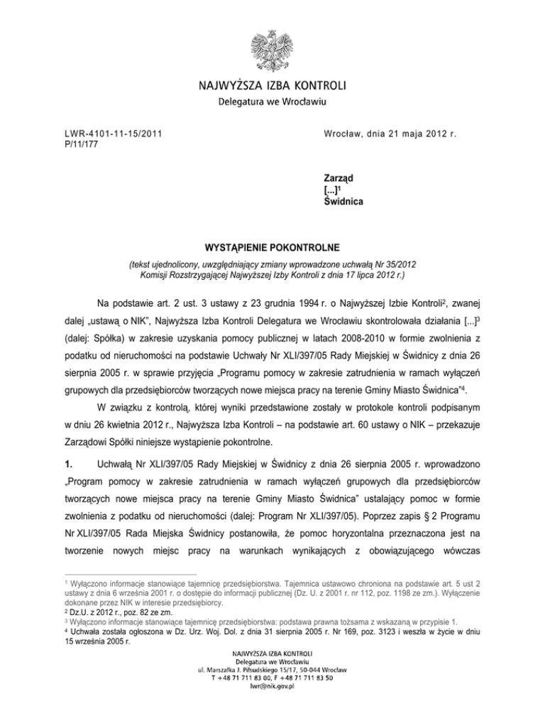 LWR-4101-11-15/2011 P/11/177 Wrocław, dnia 21 maja 2012 r. Zarząd [...]1 Świdnica WYSTĄPIENIE POKONTROLNE (tekst ujednolicony, uwzględniający zmiany wprowadzone uchwałą Nr 35/2012 Komisji Rozstrzygającej Najwyższej Izby Kontroli z dnia 17 lipca 2012 r.) Na podstawie art. 2 ust. 3 ustawy z 23 grudnia 1994 r. o Najwyższej Izbie Kontroli2, zwanej dalej „ustawą o NIK”, Najwyższa Izba Kontroli Delegatura we Wrocławiu skontrolowała działania [...]3 (dalej: Spółka) w zakresie uzyskania pomocy publicznej w latach 2008-2010 w formie zwolnienia z podatku od nieruchomości na podstawie Uchwały Nr XLI/397/05 Rady Miejskiej w Świdnicy z dnia 26 sierpnia 2005 r. w sprawie przyjęcia „Programu pomocy w zakresie zatrudnienia w ramach wyłączeń grupowych dla przedsiębiorców tworzących nowe miejsca pracy na terenie Gminy Miasto Świdnica”4. W związku z kontrolą, której wyniki przedstawione zostały w protokole kontroli podpisanym w dniu 26 kwietnia 2012 r., Najwyższa Izba Kontroli – na podstawie art. 60 ustawy o NIK – przekazuje Zarządowi Spółki niniejsze wystąpienie pokontrolne. 1. Uchwałą Nr XLI/397/05 Rady Miejskiej w Świdnicy z dnia 26 sierpnia 2005 r. wprowadzono „Program pomocy w zakresie zatrudnienia w ramach wyłączeń grupowych dla przedsiębiorców tworzących nowe miejsca pracy na terenie Gminy Miasto Świdnica” ustalający pomoc w formie zwolnienia z podatku od nieruchomości (dalej: Program Nr XLI/397/05). Poprzez zapis § 2 Programu Nr XLI/397/05 Rada Miejska Świdnicy postanowiła, że pomoc horyzontalna przeznaczona jest na tworzenie nowych miejsc pracy na warunkach wynikających z obowiązującego wówczas 1 Wyłączono informacje stanowiące tajemnicę przedsiębiorstwa. Tajemnica ustawowo chroniona na podstawie art. 5 ust 2 ustawy z dnia 6 września 2001 r. o dostępie do informacji publicznej (Dz. U. z 2001 r. nr 112, poz. 1198 ze zm.). Wyłączenie dokonane przez NIK w interesie przedsiębiorcy. 2 Dz.U. z 2012 r., poz. 82 ze zm. 3 Wyłączono informacje stanowiące tajemnicę przedsiębiorstwa: podstawa prawna tożsama z wskazaną w przypisie 1. 4 Uchwała została ogłoszona w Dz. Urz. Woj. Dol. z dnia 31 sierpnia 2005 r. Nr 169, poz. 3123 i weszła w życie w dniu 15 września 2005 r. rozporządzenia Komisji (WE) Nr 2204/2002 z dnia 12 grudnia 2002 r. w sprawie stosowania art. 87 i 88 Traktatu WE w odniesieniu do pomocy państwa w zakresie zatrudnienia5. [...]6 Spółka wypełniła warunki Programu w zakresie nakładów inwestycyjnych i zatrudnienia - do 31 grudnia 2009 r. [...]7. 2. Kontrola wykazała nieprawidłowości w deklaracjach na podatek od nieruchomości, które zostały złożone przez Spółkę w latach 2008-2011, w zakresie podstawy opodatkowania budynków i budowli, polegające na zaniżeniu lub zawyżeniu wartości budowli oraz zawyżeniu powierzchni użytkowej budynków, co łącznie skutkowało wykazaniem w deklaracjach podatkowych wartości zwolnienia z podatku od nieruchomości od budynków i budowli w wysokości o 165,6 tys. zł niższej od faktycznie uzyskanej. Nieprawidłowość ta została usunięta przez Spółkę poprzez złożenie w czasie kontroli NIK korekt deklaracji na podatek od nieruchomości. Zgodnie z treścią art. 61 ust. 1 ustawy o NIK, w terminie 7 dni od daty otrzymania niniejszego wystąpienia pokontrolnego, przysługuje kierownikowi jednostki kontrolowanej8 prawo zgłoszenia na piśmie do Dyrektora Najwyższej Izby Kontroli Delegatury we Wrocławiu, umotywowanych zastrzeżeń w sprawie ocen, uwag i wniosków zawartych w tym wystąpieniu. Dz. Urz. WE L 337 z 13.12.2002 r., s.3. – obowiązywało do 30 czerwca 2008 r. Wyłączono informacje stanowiące tajemnicę przedsiębiorstwa: podstawa prawna tożsama z wskazaną w przypisie 1. 7 Wyłączono informacje stanowiące tajemnicę przedsiębiorstwa: podstawa prawna tożsama z wskazaną w przypisie 1. 8 W rozumieniu art. 2a pkt 3 ustawy o NIK 5 6 2