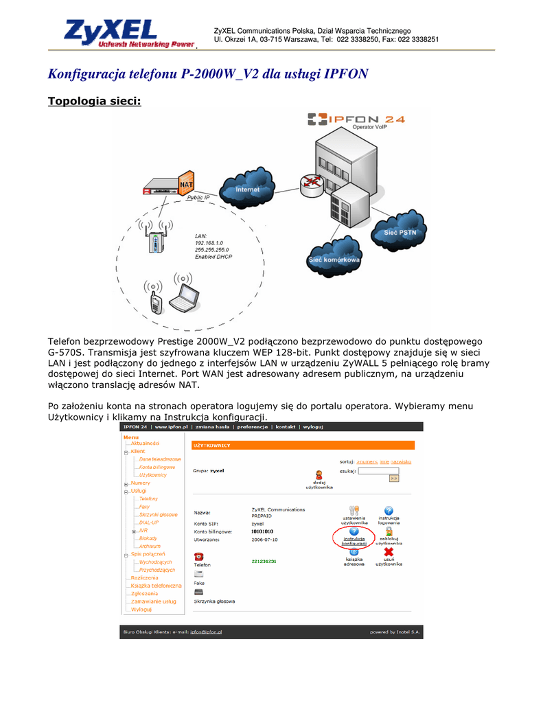 ZyXEL Communications Polska, Dział Wsparcia Technicznego Ul. Okrzei 1A, 03-715 Warszawa, Tel: 022 3338250, Fax: 022 3338251 . Konfiguracja telefonu P-2000W_V2 dla usługi IPFON Topologia sieci: Telefon bezprzewodowy Prestige 2000W_V2 podłączono bezprzewodowo do punktu dostępowego G-570S. Transmisja jest szyfrowana kluczem WEP 128-bit. Punkt dostępowy znajduje się w sieci LAN i jest podłączony do jednego z interfejsów LAN w urządzeniu ZyWALL 5 pełniącego rolę bramy dostępowej do sieci Internet. Port WAN jest adresowany adresem publicznym, na urządzeniu włączono translację adresów NAT. Po założeniu konta na stronach operatora logujemy się do portalu operatora. Wybieramy menu Użytkownicy i klikamy na Instrukcja konfiguracji. ZyXEL Communications Polska, Dział Wsparcia Technicznego Ul. Okrzei 1A, 03-715 Warszawa, Tel: 022 3338250, Fax: 022 3338251 . Strona Protokół aktywacji usługi zawiera informację potrzebne do konfiguracji usługi w telefonie VoIP. Są to nazwa serwera Proxy (1), nazwa użytkownika (2) i hasło (3). Telefon P-2000W_V2 – przyłączenie do sieci WiFi. Po włączeniu zasilania, tworzymy nowy profil dla sieci bezprzewodowej. Wybieramy menu 4.1.2. Ponieważ w sieci uruchomiony jest serwer DHCP, ustawiamy automatyczną konfigurację adresacji IP na telefonie. Pozycja druga DHCP. Następnie przechodzimy do ustawień sieci bezprzewodowej, menu numer 7. Wybieramy Site Survey, następnie po wyszukaniu dostępnych sieci bezprzewodowych wybieramy identyfikator SSID sieci do której chcemy się podłączyć. W pozycjach 7.3 Network Mode ustawiamy Infrastructure. Menu 7.4 Channel umożliwia ustawienie kanału radiowego, zaś menu 7.5 ustalenie prędkości transmisji WiFi, ustawiamy auto. ZyXEL Communications Polska, Dział Wsparcia Technicznego Ul. Okrzei 1A, 03-715 Warszawa, Tel: 022 3338250, Fax: 022 3338251 . Następnie ustawiamy sposób szyfrowania połączenia. Przechodzimy do Menu 7.6 WEP Select i ustalmy długość klucza wykorzystywanego podczas transmisji danych. Wybieramy 128 bitów identycznie jak na naszym punkcie dostępowym. Następnie wybieramy pozycję 7.1 WEP Key 1 i wpisujemy klucz WEP. Na koniec wybieramy uaktywniamy klucz 1 w menu 7.11 Key Select. Aby zapisać profil przechodzimy do menu 7.7 Profiles. Wybieramy Create i wybieramy pozycję na której dany profil połączenia ma być zapisany. Po zapisaniu profilu wybieramy ponownie 7.7, pozycję Activate i zaznaczamy zapisany profil jako aktywny. ZyXEL Communications Polska, Dział Wsparcia Technicznego Ul. Okrzei 1A, 03-715 Warszawa, Tel: 022 3338250, Fax: 022 3338251 . Po ponownym uruchomieniu, telefon jest skonfigurowany poprawnie do korzystania z szyfrowanej bezprzewodowej sieci WiFi. Konfiguracja konta SIP Przechodzimy do menu 5.1.1 Registrar IP. Wpisujemy adres IP lub nazwę DNS serwera rejestrującego SIP. W przypadku usługi IPFone sip.ipfone.pl. Numer portu pozostawiamy bez zmian (ustawione domyślnie na 5060). Taki sam adres wpisujemy w pozycjach 5.2.1 Outbound Proxy i 5.3.1 Proxy Server. W pozycji 5.4.1 Phone Number i 5.4.2 Username wpisujemy tą samą nazwę użytkownika (odczytane ze strony operatora 1), w polu 5.4.3 wpisujemy hasło. ZyXEL Communications Polska, Dział Wsparcia Technicznego Ul. Okrzei 1A, 03-715 Warszawa, Tel: 022 3338250, Fax: 022 3338251 . Po ponownym uruchomieniu, telefon powinien pomyślnie się zarejestrować i być gotowy do użycia.