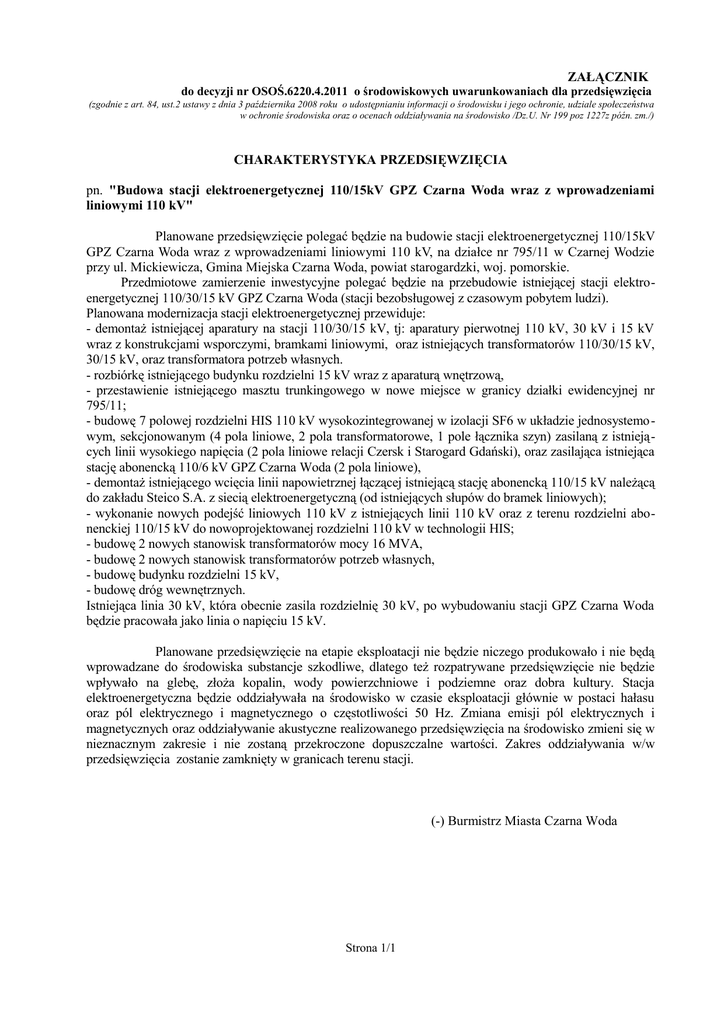 ZAŁĄCZNIK do decyzji nr OSOŚ.6220.4.2011 o środowiskowych uwarunkowaniach dla przedsięwzięcia (zgodnie z art. 84, ust.2 ustawy z dnia 3 października 2008 roku o udostępnianiu informacji o środowisku i jego ochronie, udziale społeczeństwa w ochronie środowiska oraz o ocenach oddziaływania na środowisko /Dz.U. Nr 199 poz 1227z późn. zm./) CHARAKTERYSTYKA PRZEDSIĘWZIĘCIA pn. "Budowa stacji elektroenergetycznej 110/15kV GPZ Czarna Woda wraz z wprowadzeniami liniowymi 110 kV" Planowane przedsięwzięcie polegać będzie na budowie stacji elektroenergetycznej 110/15kV GPZ Czarna Woda wraz z wprowadzeniami liniowymi 110 kV, na działce nr 795/11 w Czarnej Wodzie przy ul. Mickiewicza, Gmina Miejska Czarna Woda, powiat starogardzki, woj. pomorskie. Przedmiotowe zamierzenie inwestycyjne polegać będzie na przebudowie istniejącej stacji elektroenergetycznej 110/30/15 kV GPZ Czarna Woda (stacji bezobsługowej z czasowym pobytem ludzi). Planowana modernizacja stacji elektroenergetycznej przewiduje: - demontaż istniejącej aparatury na stacji 110/30/15 kV, tj: aparatury pierwotnej 110 kV, 30 kV i 15 kV wraz z konstrukcjami wsporczymi, bramkami liniowymi, oraz istniejących transformatorów 110/30/15 kV, 30/15 kV, oraz transformatora potrzeb własnych. - rozbiórkę istniejącego budynku rozdzielni 15 kV wraz z aparaturą wnętrzową, - przestawienie istniejącego masztu trunkingowego w nowe miejsce w granicy działki ewidencyjnej nr 795/11; - budowę 7 polowej rozdzielni HIS 110 kV wysokozintegrowanej w izolacji SF6 w układzie jednosystemowym, sekcjonowanym (4 pola liniowe, 2 pola transformatorowe, 1 pole łącznika szyn) zasilaną z istniejących linii wysokiego napięcia (2 pola liniowe relacji Czersk i Starogard Gdański), oraz zasilająca istniejąca stację abonencką 110/6 kV GPZ Czarna Woda (2 pola liniowe), - demontaż istniejącego wcięcia linii napowietrznej łączącej istniejącą stację abonencką 110/15 kV należącą do zakładu Steico S.A. z siecią elektroenergetyczną (od istniejących słupów do bramek liniowych); - wykonanie nowych podejść liniowych 110 kV z istniejących linii 110 kV oraz z terenu rozdzielni abonenckiej 110/15 kV do nowoprojektowanej rozdzielni 110 kV w technologii HIS; - budowę 2 nowych stanowisk transformatorów mocy 16 MVA, - budowę 2 nowych stanowisk transformatorów potrzeb własnych, - budowę budynku rozdzielni 15 kV, - budowę dróg wewnętrznych. Istniejąca linia 30 kV, która obecnie zasila rozdzielnię 30 kV, po wybudowaniu stacji GPZ Czarna Woda będzie pracowała jako linia o napięciu 15 kV. Planowane przedsięwzięcie na etapie eksploatacji nie będzie niczego produkowało i nie będą wprowadzane do środowiska substancje szkodliwe, dlatego też rozpatrywane przedsięwzięcie nie będzie wpływało na glebę, złoża kopalin, wody powierzchniowe i podziemne oraz dobra kultury. Stacja elektroenergetyczna będzie oddziaływała na środowisko w czasie eksploatacji głównie w postaci hałasu oraz pól elektrycznego i magnetycznego o częstotliwości 50 Hz. Zmiana emisji pól elektrycznych i magnetycznych oraz oddziaływanie akustyczne realizowanego przedsięwzięcia na środowisko zmieni się w nieznacznym zakresie i nie zostaną przekroczone dopuszczalne wartości. Zakres oddziaływania w/w przedsięwzięcia zostanie zamknięty w granicach terenu stacji. (-) Burmistrz Miasta Czarna Woda Strona 1/1