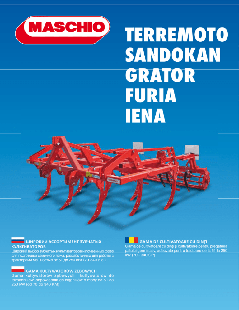 TERREMOTO SANDOKAN GRATOR FURIA IENA ШИРОКИЙ АССОРТИМЕНТ ЗУБЧАТЫХ КУЛЬТИВАТОРОВ Широкий выбор зубчатых культиваторов и почвенных фрез для подготовки семенного ложа, разработанных для работы с тракторами мощностью от 51 до 250 кВт (70-340 л.с.) GAMA KULTYWATORÓW ZĘBOWYCH Gama kultywatorów zębowych i kultywatorów do rozsadników, odpowiednia do ciągników o mocy od 51 do 250 kW (od 70 do 340 KM) GAMA DE CULTIVATOARE CU DINŢI Gamă de cultivatoare cu dinţi şi cultivatoare pentru pregătirea patului germinativ, adecvate pentru tractoare de la 51 la 250 kW (70 - 340 CP) 1964... ЛЮДИ, ВЕДУЩИЕ БИЗНЕС: Более 45 лет успешного ведения бизнеса на международном рынке сельскохозяйственной техники... … это результат непрерывной работы братьев Maschio, Egidio и Giorgio, вместе с их видением, смелостью принятия решений и талантливым управлением бизнесом. Сегодня Maschio Gaspardo Group - это крупнейший международный бизнес, известный во всем мире благодаря своим инновационным продуктам, организационной структуре, ответственному и надежному ведению дел на мировом рынке сельскохозяйственной техники. LUDZIE, KTÓRZY STWORZYLI TEN BIZNES: Ponad 45 lat sukcesów w branży maszyn rolniczych… ...stanowi rezultat pełnej zaangażowania postawy braci Maschio, Egidia i Giorgia, a także ich wizji, odwagi i zdolności w zakresie zarządzania. Obecnie Maschio Gaspardo Group to duże, międzynarodowe przedsiębiorstwo, powszechnie znane dzięki swym innowacyjnym produktom, a także dzięki uczciwości, pewności i poważnemu podejściu, charakteryzującym działania firmy na światowym rynku maszyn rolniczych. OAMENII CARE AU CREAT AFACEREA: Peste 45 de ani de succese în domeniul maşinilor agricole... ...rezultatul dedicaţiei fraţilor Maschio, Egidio şi Giorgio, împreună cu viziunea, curajul şi talentele manageriale ale acestora. În prezent, Maschio Gaspardo Group este o companie multinaţională majoră cunoscută în toată lumea pentru produsele inovatoare şi pentru integritatea, seriozitatea şi fiabilitatea cu care funcţionează în domeniul maşinilor agricole. 2 1964 1975 1993 2003 2004 2010 2011 2012 С ПЕРСПЕКТИВОЙ НА БУДУЩЕЕ PATRZĄC W PRZYSZŁOŚĆ O AFACERE DE VIITOR Братья Maschio впервые основали бизнес дома на конюшне, начав производить вращающиеся фрезы. Через несколько лет производство в мастерской переросло в организованный промышленный бизнес. Продукция компании Maschio начала завоевывать зарубежный рынок. В 1979 г. тенденция к развитию стала причиной приобретения завода Maschio Gaspardo в Кадонеге, Падуя, являющегося стратегической площадкой для механической обработки деталей машин. Последующее приобретение Gaspardo Seminatrici в Морсано-аль-Тальяменто, Порденоне. Открытие завода Maschio Gaspardo Romania в Кишинеу-Криш, Арад, Румыния, для производства машин для минимальной культивации. Открытие завода Maschio Gaspardo Qingdao в Шаньдуне для производства вращающихся почвенных фрез, машин для поверхностного рыхления почвы и сеялок. Открытие завода Maschio Gaspardo в СанДжорджо-делле-Пертиче, Падуя, для холодной прессовки металлических листов. Закладка фундамента завода Maschio Gaspardo India в Аундх, Пуна, Индия, для производства вращающихся почвенных фрез, активных борон и сеялок. Более 1000 рабочих, 4 производственные мощности в Италии, 3 завода за рубежом и 13 коммерческих дочерних предприятий по всему миру. С этими цифрами мы решаем задачи настоящего и будущего …, обладая характером, выкованным в прошлом! Приобретение компаний Unigreen и Finotto для производства полной линейки разбрызгивателей и опрыскивающих машин. Bracia Maschio założyli swój interes w przydomowej stajni, zaczynając od produkcji kultywatorów obrotowych. W ciągu kilku lat rzemieślnicza produkcja została przekształcona w zorganizowany zakład przemysłowy. Produkty Maschio zaczęto sprzedawać za granicą. Trend wzrostowy doprowadził w 1979 roku do nabycia zakładu produkcyjnego Maschio Gaspardo w Cadoneghe (Padwa). To strategiczna lokalizacja dla produkcji mechanicznej. Nabycie Gaspardo Seminatrici w Morsano al Tagliamento (Pordenone). Otwarcie zakładu Maschio Gaspardo Romania w Chisineu-Cris (Arad), produkującego maszyny do uprawy minimalnej. Fraţii Maschio au început afacerea în grajdul casei lor, producând freze. În câţiva ani, producţia artizanală s-a transformat într-o realitate industrială organizată.