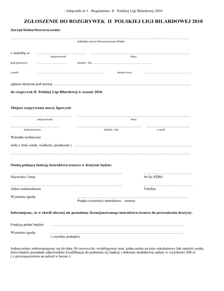 - Załącznik nr 1 - Regulaminu II Polskiej Ligi Bilardowej 2010 ZGŁOSZENIE DO ROZGRYWEK II POLSKIEJ LIGI BILARDOWEJ 2010 Zarząd Klubu/Stowarzyszenia: ………………………………………………………………………………………………………..…………………… dokładna nazwa Stowarzyszenia-Klubu z siedzibą w: ………………………………… ……………………………………………………………………. miejscowość ulica kod pocztowy ………………………… telefon / fax…………………………………………………… e-mail …………………………………………………………. strona www. ……………………………………….. zgłasza drużynę pod nazwą: ………………………………………………………………………………………………. do rozgrywek II Polskiej Ligi Bilardowej w sezonie 2010. Miejsce rozgrywania meczy ligowych: ………………………………………… ……………………………………………………………………………… miejscowość ……………………..……….… kod pocztowy ulica …………………………………………… telefon / fax ………………………….….. e-mail Warunki techniczne stoły ( ilość sztuk, wielkość, producent ) ………………………………………………………………………………… …………………………………………………………………………………………………………………………….. Osobą pełniącą funkcję instruktora-trenera w drużynie będzie: …………………………………………………………………………….. Nazwisko i Imię ………………………………... Nr lic PZBil …………………………………………………………………………….. Adres zamieszkania ………………………………… Telefon Wyrażam zgodę: ……………………………………………………………………………. Podpis (czytelny) instruktora – trenera Informujemy, że w chwili obecnej nie posiadamy licencjonowanego instruktora-trenera do prowadzenia drużyny. Funkcję pełnić będzie ……………………………………………………………………………………………. Wyrażam zgodę: ……………………………………………………………………………………………. ( czytelny podopis) Jednocześnie zobowiązujemy się do dnia 30 czerwca br, wydelegować min. jedną osobę na kurs szkoleniowy lub znaleźć osobę, która będzie posiadała odpowiednie kwalifikacje do pełnienia tej funkcji i dokonać dodatkowej opłaty w wysokości 200 zł ( z przeznaczeniem na udział w kursie ). -2- Adres do korespondencji – OSOBY ODPOWIEDZIALNEJ ZA KONTAKT Z BIUREM PZBIL i KPLB: ………………………………………………………………………………………………………………………………… dokładne dane osoby do której będą wysyłane wszystkie dokumenty związane z rozgrywkami ligowymi ………………………… …………………………………………………………………………………. miejscowość ……………………..…. ulica …………………………………………… kod pocztowy telefon komórkowy / fax …………………………. e-mail Jednocześnie zobowiązujemy się przestrzegać regulaminów i przepisów związanych z rozgrywkami ligowymi. Informujemy również, że żadna z osób wymienionych w zgłoszeniu i Klub nie jest obciążona zobowiązaniami finansowymi wobec PZBil oraz karami dyscyplinarnymi. ………………………………………… Pieczęć Klubu /Stowarzyszenia ………………………………………… Podpis i pieczęć Prezesa Klubu Data …………………………………… W załączeniu: -potwierdzenie opłaty startowej do rozgrywek II PLB w sezonie 2010, -potwierdzenie opłaty licencji klubu na 2010 rok, - odpis statutu lub umowy spółki w przypadku klubu działającego jako osoba prawna, -wykaz zawodników którzy będą występowali w meczach ligowych w sezonie 2010 (zał. nr 2 RPLB). - aktualny wyciąg z z KRS lub innego rejestru właściwego dla formy organizacji ( z ostatnich 3 miesięcy) -zgłoszenie sędziego na mecze ligowe ( zał. nr 3 RPLB ) -logo klubu ( corel , psdf ) Skrót RPLB - Regulamin Polskiej Ligi Bilardowej 2010 OSTATECZNY TERMIN PRZESYŁANIA WNIOSKÓW WRAZ Z POTWIERDZENIEM OPŁATY STARTOWEJ UPŁYWA 31 STYCZNIA 2010 ROKU. WNIOSKI NIEKOMPLETNE NIE BĘDĄ PRZYJMOWANE - Załącznik nr 2 - Regulaminu II Polskiej Ligi Bilardowej 2010 WYKAZ ZAWODNIKÓW KTÓRZY BĘDĄ WYSTĘPOWALI W ROZGRYWKACH II POLSKIEJ LIGI BILARDOWEJ W SEZONIE 2010 W BARWACH KLUBU ………………………………………………………..…………………………………………………………… Lp. Imię i nazwisko Nr Licencji 1. …………………………………………………………………………… ………………… 2. …………………………………………………………………………… ………………… 3. …………………………………………………………………………… ………………… 4. …………………………………………………………………………… ………………… 5. …………………………………………………………………………… ………………… 6. …………………………………………………………………………… ………………… 7. …………………………………………………………………………… ………………… 8. …………………………………………………………………………… ………………… 9. ………………………………………………