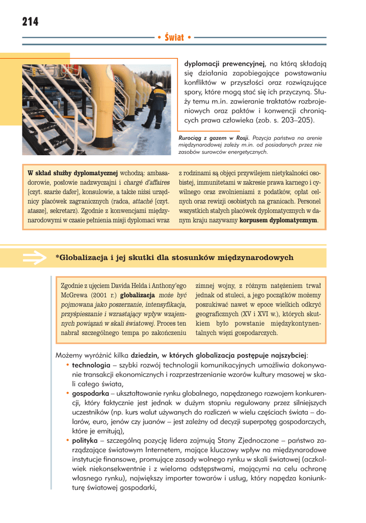 214 • Âwiat • dyplomacji prewencyjnej, na którà sk∏adajà si´ dzia∏ania zapobiegajàce powstawaniu konfliktów w przysz∏oÊci oraz rozwiàzujàce spory, które mogà staç si´ ich przyczynà. S∏u˝y temu m.in. zawieranie traktatów rozbrojeniowych oraz paktów i konwencji chroniàcych prawa cz∏owieka (zob. s. 203–205). Rurociàg z gazem w Rosji. Pozycja paƒstwa na arenie mi´dzynarodowej zale˝y m.in. od posiadanych przez nie zasobów surowców energetycznych. W sk∏ad s∏u˝by dyplomatycznej wchodzà: ambasadorowie, pos∏owie nadzwyczajni i chargé d’affaires [czyt. szar˝e dafer], konsulowie, a tak˝e ni˝si urz´dnicy placówek zagranicznych (radca, attaché [czyt. atasze], sekretarz). Zgodnie z konwencjami mi´dzynarodowymi w czasie pe∏nienia misji dyplomaci wraz fi z rodzinami sà obj´ci przywilejem nietykalnoÊci osobistej, immunitetami w zakresie prawa karnego i cywilnego oraz zwolnieniami z podatków, op∏at celnych oraz rewizji osobistych na granicach. Personel wszystkich sta∏ych placówek dyplomatycznych w danym kraju nazywamy korpusem dyplomatycznym. *Globalizacja i jej skutki dla stosunków mi´dzynarodowych Zgodnie z uj´ciem Davida Helda i Anthony’ego McGrewa (2001 r.) globalizacja mo˝e byç pojmowana jako poszerzanie, intensyfikacja, przyÊpieszanie i wzrastajàcy wp∏yw wzajemnych powiàzaƒ w skali Êwiatowej. Proces ten nabra∏ szczególnego tempa po zakoƒczeniu zimnej wojny, z ró˝nym nat´˝eniem trwa∏ jednak od stuleci, a jego poczàtków mo˝emy poszukiwaç nawet w epoce wielkich odkryç geograficznych (XV i XVI w.), których skutkiem by∏o powstanie mi´dzykontynentalnych wi´zi gospodarczych. Mo˝emy wyró˝niç kilka dziedzin, w których globalizacja post´puje najszybciej: • technologia – szybki rozwój technologii komunikacyjnych umo˝liwia dokonywanie transakcji ekonomicznych i rozprzestrzenianie wzorów kultury masowej w skali ca∏ego Êwiata, • gospodarka – ukszta∏towanie rynku globalnego, nap´dzanego rozwojem konkurencji, który faktycznie jest jednak w du˝ym stopniu regulowany przez silniejszych uczestników (np. kurs walut u˝ywanych do rozliczeƒ w wielu cz´Êciach Êwiata – dolarów, euro, jenów czy juanów – jest zale˝ny od decyzji superpot´g gospodarczych, które je emitujà), • polityka – szczególnà pozycj´ lidera zajmujà Stany Zjednoczone – paƒstwo zarzàdzajàce Êwiatowym Internetem, majàce kluczowy wp∏yw na mi´dzynarodowe instytucje finansowe, promujàce zasady wolnego rynku w skali Êwiatowej (aczkolwiek niekonsekwentnie i z wieloma odst´pstwami, majàcymi na celu ochron´ w∏asnego rynku), najwi´kszy importer towarów i us∏ug, który nap´dza koniunktur´ Êwiatowej gospodarki, 215 • Stosunki mi´dzynarodowe. Globalizacja • • kultura – proces homogenizacji kultury Êwiatowej, post´pujàcy za poÊrednictwem mediów (zob. s. 99–101), które wykorzystujà motywy kultur regionalnych (narodowych) dla wytworzenia produktów rozpowszechnianych globalnie (np. filmów, wideoklipów), • ekologia – post´pujàce zniszczenie Êrodowiska naturalnego, które wywo∏uje potrzeb´ dzia∏aƒ zapobiegawczych w skali Êwiatowej. Antyglobalizm – przekonanie o tym, ˝e nale˝y zatrzymaç globalizacj´, przywracajàc Êcis∏à kontrol´ przep∏ywu towarów, ludzi, us∏ug i kapita∏u na granicach paƒstw, co umo˝liwi obron´ s∏abszych przed silniejszymi. Alterglobalizm – przekonanie o tym, ˝e globalizacja jest nieunikniona, trzeba jednak zmieniç jej charakter, przede wszystkim przez rozwój wspó∏pracy mi´dzynarodowych struktur politycznych oraz stworzenie uniwersalnych standardów prawnych (zw∏aszcza prawa pracy). AlterglobaliÊci twierdzà, ˝e z∏o na Êwiecie nie bierze si´ z nadmiaru globalizacji, lecz z jej niedostatku. W toku przemian globalizacyjnych prawa cz∏owieka, standardy warunków pracy, edukacja i ochrona zdrowia nie nadà˝y∏y za technologiami, Êrodkami komunikacji i przep∏ywem kapita∏u. Wraz ze wzrostem tempa globalizacji w stosunkach mi´dzynarodowych stale roÊnie znaczenie uczestników niepaƒstwowych, szczególnie typu ponadnarodowego, którzy dzia∏ajà niezale˝nie od paƒstw (np. przedsi´biorstwa, korporacje lub KoÊcio∏y), a czasem nawet przeciw paƒstwom (np. mi´dzynarodowe struktury przest´pcze albo siatki terrorystyczne). Wiele organizacji zajmuje si´ problemami o skali ogólnoÊwiatowej. Ich rosnàce zaanga˝owanie powoduje, ˝e coraz wi´cej ludzi czuje si´ odpowiedzialnymi za utrzymanie pokoju na Êwiecie lub przeciwdzia∏anie biedzie, niesprawiedliwoÊci oraz skutkom kataklizmów nie tylko we w∏asnym kraju. Ten pozytywny aspekt przemian nie powinien jednak prowadziç do wniosku, ˝e forma paƒstwa jest przestarza∏a i nie odpowiada wyzwaniom, przed jakimi staje dziÊ ludzkoÊç. Dla porzàdku opartego na wspó∏pracy mi´dzy paƒstwami nie stworzono jak dotàd ˝adnej realnej alternatywy. Palàcà potrzebà jest natomiast podejmowanie przez paƒstwa coraz szerszej wspó∏pracy w rozwiàzywaniu problemów, które nabierajà charakteru kontynentalnego lub nawet globalnego (zob. s. 217–225). Oznacza to koniecznoÊç pog∏´biania integracji paƒstw w poszczególnych cz´Êciach Êwiata. Integracja ta wymaga od rzàdów i spo∏eczeƒstw przekazywania cz´Êci suwerennoÊci paƒstwowej w niektórych dziedzinach organizacjom ponadpaƒstwowym. JednoczeÊnie rozwój wiedzy o Êwiecie i mo˝liwoÊç nawiàzywania kontaktów w skali globalnej (m.in. przez Internet) Wspó∏praca miast partnerskich. Drogowskaz z nazwami 12 miast partnerskich Opola, stojàcy od 2003 r. na opolskim rynku. Niemal ka˝da dobrze zorganizowana jednostka samorzàdu terytorialnego wspó∏pracuje dziÊ z wieloma podobnymi jednostkami w innych paƒstwach (np. tzw. miasta partnerskie), dzi´ki czemu uczestniczy w wymianie kulturalnej i gospodarczej oraz korzysta z doÊwiadczeƒ w rozwiàzywaniu problemów lokalnych. 216 • Âwi