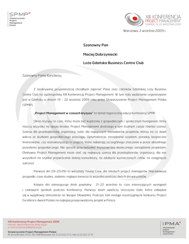 Warszawa, 2 września 2009 r. Szanowny Pan Maciej Dobrzyniecki Loża Gdańska Business Centre Club Szanowny Panie Kanclerzu, Z nieskrywaną przyjemnością chciałbym zaprosić Pana oraz członków Gdańskiej Loży Business Centre Club na ogólnopolską XIII Konferencją Project Management. W tym roku wydarzenie organizowane jest w Gdańsku w dniach 19 - 22 września 2009 roku przez Stowarzyszenie Project Management Polska (SPMP). „Project Management w czasach kryzysu” to temat tegorocznej edycji Konferencji SPMP. Okres kryzysu to czas, który może być kojarzony z gospodarczym i społecznym huraganem, który niszczy wszystko na swojej drodze. Project Management dostrzega w tym trudnym czasie również szanse. Szanse dla przedsiębiorstw, organizacji, ludzi, dla najlepszych menadżerów projektów, którzy na co dzień walczą ze skutkami gospodarczego przeciągu. Optymalizacja, zarządzanie ryzykiem, porażką, bezpieczne finansowanie, czy restrukturyzacja to pojęcia, które nabierają szczególnego znaczenia w porze aktualnego przesilenia gospodarczego. Nie sposób przeciwdziałać kryzysowi bez skutecznego zarządzenia projektami. Efektywny Project Management może stać się najlepszą szansą dla przedsiębiorstw, organizacji, dla nas wszystkich na szybkie przywrócenie dobrej koniunktury, na zdobycie wyznaczonych celów, na osiągnięcie sukcesu! Pierwsze dni (19-20.09) to warsztaty Young Crew, dla młodych project managerów. Najciekawsze przypadki, case studies, zadania i najlepsi trenerzy to wszystko podczas dwóch dni warsztatów. Kolejne dni zainauguruje drink powitalny. 21-22 września to czas interesujących wystąpień i ciekawych spotkań podczas Konferencji. Pierwszy dzień uwieńczy Uroczysta Gala, która odbędzie się w wyjątkowej atmosferze na Wyspie Ołowianka. Podczas Gali nastąpi rozstrzygnięcie konkursu Project Excellence Award Polska na najlepiej przeprowadzony projekt w Polsce. Część merytoryczną jako główni mówcy uświetnią: Stanisław Sroka – Prezes Zarządu Transsytem SA, Prezes Zarządu SPMP, Paweł Olechnowicz – Prezes Zarządu Grupy Lotos SA, Marek Litka – Wiceprezes Zarządu PERN „Przyjaźń” SA, Janusz Lewandowski – Poseł do Parlamentu Europejskiego. Blisko 400 osób to liczba uczestników jakiej spodziewamy się w tym roku. Większość z nich to wybitni eksperci w swoich branżach. Nazwiska znane i szanowane, szefowie instytucji państwowych i firm prywatnych, naukowcy i praktycy. Wiele z tych osób to również przedstawiciele firm i organizacji pomorskich. Ponadto, udział w XIII Konferencji Project Management 2009 potwierdzili już: Marszałek Województwa Pomorskiego Jan Kozłowski, Wojewoda Pomorski Roman Zaborowski, Prezydent Gdańska Paweł Adamowicz, Pragnę poinformować, że Stowarzyszenie Project Management Polska jest obecnie największą organizacją non profit w Polsce i jedną z większych w świecie skupiającą osoby zainteresowane zarządzaniem projektami. SPMP zrzesza ponad 1000 członków indywidualnych i ponad 50 instytucji. Stowarzyszenie należy do grona blisko 50 organizacji narodowych z całego świata skupionych w International Project Management Association (IPMA). Kierując na Pana ręce zaproszenie, licząc na rozwinięcie współpracy pomiędzy LG BCC a SPMP, proponuje 50% zniżki na udział w Konferencji dla członków BCC. Pełen program oraz więcej informacji nt. samej konferencji może Pan znaleźć na stronie: www.konferencja.spmp.org.pl. Mam nadzieje, iż ta ogólnopolska Konferencja będzie pretekstem do nawiązania trwałych kontaktów oraz współpracy pomiędzy naszymi organizacjami. Z serdecznym pozdrowieniem Leszek Miazga Wiceprezes Zarządu SPMP Przewodniczący Komitetu Organizacyjnego XIII KPM2009