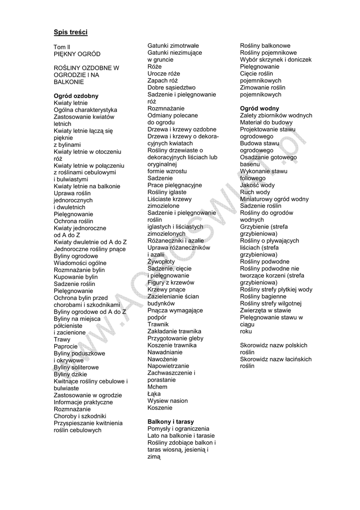 Spis treści Tom ll PIĘKNY OGRÓD ROŚLINY OZDOBNE W OGRODZIE l NA BALKONIE Ogród ozdobny Kwiaty letnie Ogólna charakterystyka Zastosowanie kwiatów letnich Kwiaty letnie łączą się pięknie z bylinami Kwiaty letnie w otoczeniu róŜ Kwiaty letnie w połączeniu z roślinami cebulowymi i bulwiastymi Kwiaty letnie na balkonie Uprawa roślin jednorocznych i dwuletnich Pielęgnowanie Ochrona roślin Kwiaty jednoroczne od A do Z Kwiaty dwuletnie od A do Z Jednoroczne rośliny pnące Byliny ogrodowe Wiadomości ogólne RozmnaŜanie bylin Kupowanie bylin Sadzenie roślin Pielęgnowanie Ochrona bylin przed chorobami i szkodnikami Byliny ogrodowe od A do Z Byliny na miejsca półcieniste i zacienione Trawy Paprocie Byliny poduszkowe i okrywowe Byliny soliterowe Byliny dzikie Kwitnące rośliny cebulowe i bulwiaste Zastosowanie w ogrodzie Informacje praktyczne RozmnaŜanie Choroby i szkodniki Przyspieszanie kwitnienia roślin cebulowych Gatunki zimotrwałe Gatunki niezimujące w gruncie RóŜe Urocze róŜe Zapach róŜ Dobre sąsiedztwo Sadzenie i pielęgnowanie róŜ RozmnaŜanie Odmiany polecane do ogrodu Drzewa i krzewy ozdobne Drzewa i krzewy o dekoracyjnych kwiatach Rośliny drzewiaste o dekoracyjnych liściach lub oryginalnej formie wzrostu Sadzenie Prace pielęgnacyjne Rośliny iglaste Liściaste krzewy zimozielone Sadzenie i pielęgnowanie roślin iglastych i liściastych zimozielonych RóŜaneczniki i azalie Uprawa róŜaneczników i azalii śywopłoty Sadzenie, cięcie i pielęgnowanie Figury z krzewów Krzewy pnące Zazielenianie ścian budynków Pnącza wymagające podpór Trawnik Zakładanie trawnika Przygotowanie gleby Koszenie trawnika Nawadnianie NawoŜenie Napowietrzanie Zachwaszczenie i porastanie Mchem Łąka Wysiew nasion Koszenie Balkony i tarasy Pomysły i ograniczenia Lato na balkonie i tarasie Rośliny zdobiące balkon i taras wiosną, jesienią i zimą Rośliny balkonowe Rośliny pojemnikowe Wybór skrzynek i doniczek Pielęgnowanie Cięcie roślin pojemnikowych Zimowanie roślin pojemnikowych Ogród wodny Zalety zbiorników wodnych Materiał do budowy Projektowanie stawu ogrodowego Budowa stawu ogrodowego Osadzanie gotowego basenu Wykonanie stawu foliowego Jakość wody Ruch wody Miniaturowy ogród wodny Sadzenie roślin Rośliny do ogrodów wodnych Grzybienie (strefa grzybieniowa) Rośliny o pływających liściach (strefa grzybieniowa) Rośliny podwodne Rośliny podwodne nie tworzące korzeni (strefa grzybieniowa) Rośliny strefy płytkiej wody Rośliny bagienne Rośliny strefy wilgotnej Zwierzęta w stawie Pielęgnowanie stawu w ciągu roku Skorowidz nazw polskich roślin Skorowidz nazw łacińskich roślin