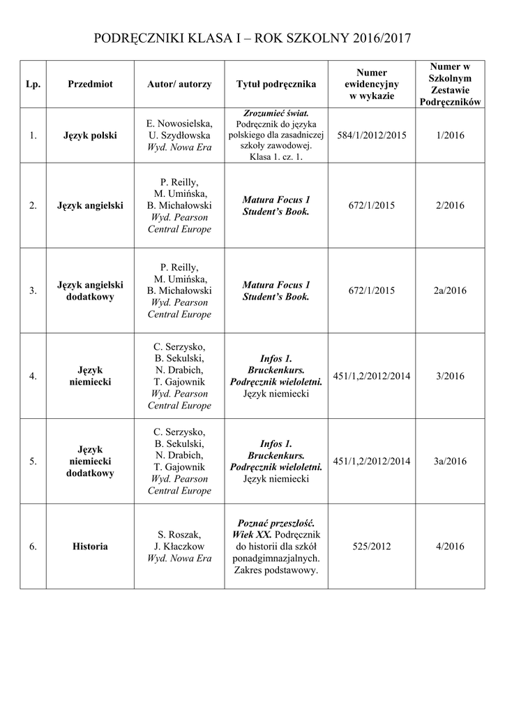 PODRĘCZNIKI KLASA I – ROK SZKOLNY 2016/2017 Lp. 1. 2. 3. 4. 5. 6. Numer w Szkolnym Zestawie Podręczników Przedmiot Autor/ autorzy Tytuł podręcznika Numer ewidencyjny w wykazie Język polski E. Nowosielska, U. Szydłowska Wyd. Nowa Era Zrozumieć świat. Podręcznik do języka polskiego dla zasadniczej szkoły zawodowej. Klasa 1. cz. 1. 584/1/2012/2015 1/2016 Język angielski P. Reilly, M. Umińska, B. Michałowski Wyd. Pearson Central Europe Matura Focus 1 Student’s Book. 672/1/2015 2/2016 Język angielski dodatkowy P. Reilly, M. Umińska, B. Michałowski Wyd. Pearson Central Europe Matura Focus 1 Student’s Book. 672/1/2015 2a/2016 Język niemiecki C. Serzysko, B. Sekulski, N. Drabich, T. Gajownik Wyd. Pearson Central Europe Infos 1. Bruckenkurs. Podręcznik wieloletni. Język niemiecki 451/1,2/2012/2014 3/2016 Język niemiecki dodatkowy C. Serzysko, B. Sekulski, N. Drabich, T. Gajownik Wyd. Pearson Central Europe Infos 1. Bruckenkurs. Podręcznik wieloletni. Język niemiecki 451/1,2/2012/2014 3a/2016 Historia S. Roszak, J. Kłaczkow Wyd. Nowa Era Poznać przeszłość. Wiek XX. Podręcznik do historii dla szkół ponadgimnazjalnych. Zakres podstawowy. 525/2012 4/2016 PODRĘCZNIKI KLASA I – ROK SZKOLNY 2016/2017 7. 8. 9. 10. 11. 12. R. Uliszak, K. Wiedermann Wyd. Nowa Era Oblicza geografii. Podręcznik dla szkół ponadgimnazjalnych. Zakres podstawowy. 433/2012/2014 5/2016 Fizyka Marcin Braun Weronika Śliwa Wyd. Nowa Era Odkryć fizykę. Podręcznik dla szkół ponadgimnazjalnych. Kształcenie ogólne w zakresie podstawowym. 447/2012/2015 6/2016 Biologia E. Bonar, W. Krzeszowiec – Jeleń, S. Czchorowski Wyd. Nowa Era Biologia na czasie. Podręcznik dla szkół ponadgimnazjalnych. Zakres podstawowy. 450/2012/2015 7/2016 Matematyka L. Wojciechowska, M. Bryński, K. Szymański Wyd. WSiP Matematyka dla zasadniczych szkół zawodowych. Część 1. 580/1/2012/2015 8/2016 Chemia R. Hassa, A. Mrzigod, J. Mrzigod, Wyd. Nowa Era To jest chemia. Podręcznik dla szkół ponadgimnazjalnych. Zakres podstawowy. 438/2012/2015 9/2016 J. Słoma, Wyd. Nowa Era Żyję i działam bezpiecznie. Podręcznik do edukacji dla bezpieczeństwa dla szkół ponadgimnazjalnych. 426/2012/2015 10/2016 Geografia Edukacja dla bezpieczeństwa PODRĘCZNIKI KLASA I – ROK SZKOLNY 2016/2017 13. Wychowanie fizyczne 14. Religia 15. Etyka 16. Bezpieczeństwo i higiena pracy (fryzjer) 17. Elementy dermatologii 18. Technologia fryzjerska Marek Stachyra, Nina Szczygielska, Patrycja Gil - Słowikowska - - 11/2016 ks. R. Strus, ks. W. Galant Wyd. GAUDIUM Świadczę o Jezusie w Kościele. AZ-41-01/10-LU1/12 12/2016 P. Kolodziński, J. Kapiszewski, Wyd. OPERON Etyka. Podręcznik dla szkół ponadgimnazjalnych 408/2011 13/2016 Z. Sumirska Wyd. P.P.H.U. SUZI Bezpieczeństwo i higiena pracy w zawodzie fryzjer. 23/2002 1/z/2016 Z. Sumirska Wyd. P.P.H.U. SUZI Bezpieczeństwo i higiena pracy w zawodzie fryzjer. 23/2002 1/z/2016 Nowoczesne fryzjerstwo – chemia, technologie, techniki. 50/2010 1/z/2016 M. Kostrzewska, I. Suligowska, Z. Sumirska, M. Teda Wyd. P.P.H.U. SUZI PODRĘCZNIKI KLASA I – ROK SZKOLNY 2016/2017 19. Stylizacja fryzur Z. Sumirska, A. Bernat, M. Kostrzewska, Wyd. SUZI 20. Język niemiecki dla fryzjerów - 21. Wyposażenie zakładów gastronomicznych M. Zienkiewicz, Wyd. WSiP E. Superczyńska, M. Żylińska – Kaczmarek, Wyd. REA 22. Nowoczesna stylizacja – kolor, forma,styl. 17/2011 1/z/2016 Materiały dodatkowe - 1/z/2016 Sporządzanie i ekspedycja potraw i napojów. Część 3. Wyposażenie zakładów gastronomicznych. 11/2014 2/z/2016 10/2004 Zasady żywienia. Zasady żywienia 2/z/2016 D. Czerwińska, Wyd. WSiP Zasady żywienia. Część 1 i 2. 12/2015 13/2015 PODRĘCZNIKI KLASA I – ROK SZKOLNY 2016/2017 23. Technologia gastronomiczna z towaroznawstwem 24. Język angielski dla kucharzy - Materiały dodatkowe - 2/z/2016 25. Technologia mechaniczna A. Górecki, Wyd. REA Technologia ogólna. Podstawy technologii mechanicznych. 2009 3/z/2016 26. Budowa pojazdów samochodowych Praca zbiorowa, Wyd. REA Budowa pojazdów samochodowych. 47/2003 3/z/2016 27. Podstawy konstrukcji maszyn T. Lewandowski, Wyd. WSiP Rysunek techniczny dla mechaników. 4/2007 3/z/2016 28. Pracownia elektrotechniki i elektroniki P. Fundowicz, B. Michałowski, M. Radzimierski, Wyd. WSiP Podstawy elektroniki i elektroniki samochodowej. 17/2007 3/z/2016 M. Konarzewska, Wyd. REA Gastronomia. Tom II. Technologia gastronomiczna z towaroznawstwem. Część 1. 69/2013 2/z/2016 PODRĘCZNIKI KLASA I – ROK SZKOLNY 2016/2017 29. Bezpieczeństwo pracy - - - 3/z/2016