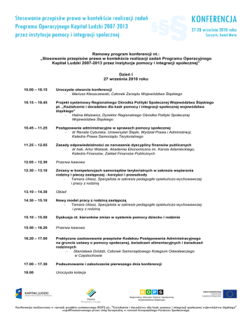Ramowy program konferencji nt.: „Stosowanie przepisów prawa w kontekście kontek realizacji zadań Programu Operacyjnego Kapitał Ludzki 2007-2013 2007 przez instytucje pomocy i integracji społecznej” Dzień I 27 września 2010 roku 10.00 – 10.15 Uroczyste otwarcie konferencji – Mariusz Kleszczewski, Członek Zarządu Zarz Województwa Śląskiego 10.15 – 10.45 Projekt systemowy Regionalnego Ośrodka O rodka Polityki Społecznej Województwa Śląskiego pt. „Kształcenie i doradztwo dla kadr pomocy i integracji społecznej województwa śląskiego” – Halina Misiewicz, Dyrektor Regionalnego Ośrodka O rodka Polityki Społecznej Województwa Śląskiego 10.45 – 11.25 Postępowanie powanie administracyjne w sprawach pomocy społecznej – dr Renata Cybulska, Uniwersytet Śląski, ski, Wydział Prawa i Administracji, Katedra Prawa Samorządu Samorz Terytorialnego 11.25 – 12.05 Zasady odpowiedzialności odpowiedzialno ci za naruszenie dyscypliny finansów publicznych – dr hab. Artur Walasik, Akademia Ekonomiczna im. Karola Adamieckiego, Katedra Finansów, Zakład Finansów Publicznych 12.05 – 12.30 Przerwa kawowa 12.30 – 13.10 Zmiany w kompetencjach samorządów samorz dów terytorialnych w zakresie wspierania rodziny i pieczy zastępczej zastę - korzyści i przeszkody – Tamara Uliasz, Specjalista w zakresie pedagogiki opiekuńczo-wychowawczej opieku wychowawczej i pracy z rodziną rodzin 13.10 – 14.30 Obiad 14.30 – 15.10 Nowy model pracy z rodziną rodzin zastępczą – Tamara Uliasz, Specjalista w zakresie pedagogiki opiekuńczo-wychowawczej wychowawczej i pracy z rodziną rodzin 15.10 – 15.50 Dyskusja nt. kierunków zmian w systemie pomocy dziecku i rodzinie 15.50 – 16.20 Przerwa kawowa 16.20 – 17.00 Praktyczne zastosowanie przepisów Kodeksu Postępowania Post powania Administracyjnego na gruncie ustawy o pomocy społecznej, świadczeń alimentacyjnych i świadczeń ś rodzinnych – Stanisława DróŜdŜ, Dró Członek Samorządowego dowego Kolegium Odwoławczego w Częstochowie stochowie 17.00 – 17.30 Podsumowanie i zakończenie zako pierwszego dnia konferencji 18.00 Uroczysta kolacja Dzień II 28 września 2010 roku 8.00 – 9.00 Śniadanie 9.00 – 9.40 Funkcjonowanie systemu kontroli zarządczej zarz dczej w instytucjach pomocy i integracji społecznej – Barbara Kunysz-Syrytczyk, Kunysz Radca prawny 9.40 – 10.20 Ochrona danych osobowych w jednostkach pomocy społecznej – Anna Kawecka, Członek Samorządowego Samorz dowego Kolegium Odwoławczego w Krakowie 10.20 - 10.40 Przerwa kawowa 10.40 – 11.40 Warsztaty: Grupa I – Kontrola zarządcza zarz w praktyce – Barbara Kunysz-Syrytczyk, Radca prawny Grupa II – Praktyczne zastosowanie przepisów KPA – Stanisława DróŜdŜ, Członek Samorządowego dowego Kolegium Odwoławczego w Częstochowie Grupa III – Ochrona danych osobowych – Anna Kawecka, Członek Samorządowego dowego Kolegium Odwoławczego w Krakowie 11.40 – 12.40 Warsztaty: Grupa I – Praktyczne zastosowanie przepisów KPA – Stanisława DróŜdŜ, Członek Samorządowego dowego Kolegium Odwoławczego w Częstochowie Grupa II – Ochrona danych osobowych – Anna Kawecka, Członek Samorządowego dowego Kolegium Odwoławczego w Krakowie Grupa III – Kontrola zarządcza zarz w praktyce – Barbara Kunysz-Syrytczyk, Radca prawny 12.40 – 12.50 Przerwa organizacyjna 12.50 – 13.10 Podsumowanie i zakończenie zako konferencji 13.10 Obiad
