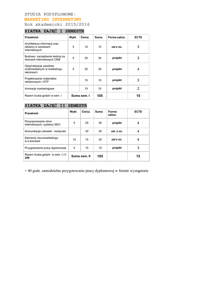 STUDIA PODYPLOMOWE: MARKETING INTERNETOWY Rok akademicki 2015/2016 SIATKA ZAJĘĆ I SEMESTR Przedmiot Wykł. Ćwicz. Suma Forma zalicz. ECTS Architektura informacji oraz reklamy w serwisach internetowych 5 10 15 zal z oc. 3 Budowa i zarządzenie treścią na stronach internetowych CMS 5 25 30 projekt 3 Optymalizacja zasobów multimedialnych w marketingu sieciowym 5 25 30 projekt 4 Projektowanie materiałów reklamowych i DTP 15 15 projekt 3 Animacje marketingowe 15 15 projekt 2 Razem liczba godzin w sem. I Suma sem. I 105 15 SIATKA ZAJĘĆ II SEMESTR Przedmiot Pozycjonowanie stron internetowych, systemy SEO Wykł. Ćwicz. 5 25 30 projekt 4 30 30 zal. z oc. 4 Komunikacja człowiek - komputer Suma Forma zalicz. ECTS Elementy neuromarketingu w e-biznesie 15 15 30 zal z oc. 4 Przygotowanie pracy dyplomowej 5 15 15 projekt 3 Razem liczba godzin w sem. I i II 240 Suma sem. II 105 15 + 40 godz. samodzielne przygotowanie pracy dyplomowej w formie wystąpienia