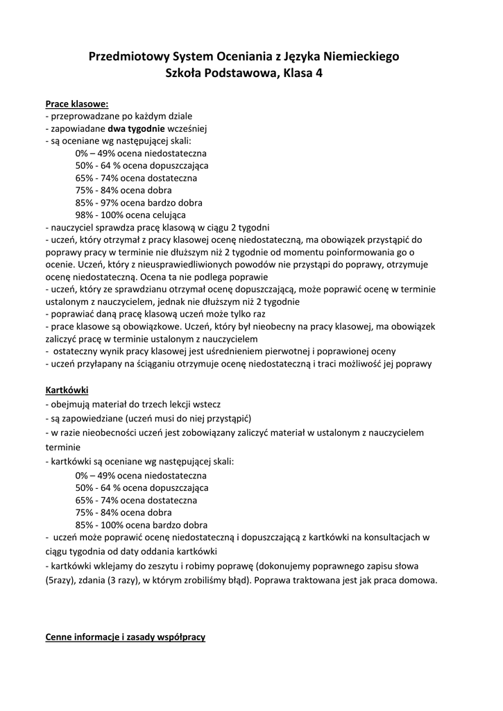 Przedmiotowy System Oceniania z Języka Niemieckiego Szkoła Podstawowa, Klasa 4 Prace klasowe: - przeprowadzane po każdym dziale - zapowiadane dwa tygodnie wcześniej - są oceniane wg następującej skali: 0% – 49% ocena niedostateczna 50% - 64 % ocena dopuszczająca 65% - 74% ocena dostateczna 75% - 84% ocena dobra 85% - 97% ocena bardzo dobra 98% - 100% ocena celująca - nauczyciel sprawdza pracę klasową w ciągu 2 tygodni - uczeń, który otrzymał z pracy klasowej ocenę niedostateczną, ma obowiązek przystąpić do poprawy pracy w terminie nie dłuższym niż 2 tygodnie od momentu poinformowania go o ocenie. Uczeń, który z nieusprawiedliwionych powodów nie przystąpi do poprawy, otrzymuje ocenę niedostateczną. Ocena ta nie podlega poprawie - uczeń, który ze sprawdzianu otrzymał ocenę dopuszczającą, może poprawić ocenę w terminie ustalonym z nauczycielem, jednak nie dłuższym niż 2 tygodnie - poprawiać daną pracę klasową uczeń może tylko raz - prace klasowe są obowiązkowe. Uczeń, który był nieobecny na pracy klasowej, ma obowiązek zaliczyć pracę w terminie ustalonym z nauczycielem - ostateczny wynik pracy klasowej jest uśrednieniem pierwotnej i poprawionej oceny - uczeń przyłapany na ściąganiu otrzymuje ocenę niedostateczną i traci możliwość jej poprawy Kartkówki - obejmują materiał do trzech lekcji wstecz - są zapowiedziane (uczeń musi do niej przystąpić) - w razie nieobecności uczeń jest zobowiązany zaliczyć materiał w ustalonym z nauczycielem terminie - kartkówki są oceniane wg następującej skali: 0% – 49% ocena niedostateczna 50% - 64 % ocena dopuszczająca 65% - 74% ocena dostateczna 75% - 84% ocena dobra 85% - 100% ocena bardzo dobra - uczeń może poprawić ocenę niedostateczną i dopuszczającą z kartkówki na konsultacjach w ciągu tygodnia od daty oddania kartkówki - kartkówki wklejamy do zeszytu i robimy poprawę (dokonujemy poprawnego zapisu słowa (5razy), zdania (3 razy), w którym zrobiliśmy błąd). Poprawa traktowana jest jak praca domowa. Cenne informacje i zasady współpracy - Aby być przygotowanym do lekcji, uczeń musi mieć pracę domową, zeszyt, podręcznik, teczkę z materiałami, przybory szkolne: długopis, ołówek, temperówkę, nożyczki, klej, cienkopisy w 4 kolorach (niebieskim, czerwonym, czarnym i zielonym) - Nieprzygotowanie należy zgłosić przed rozpoczęciem lekcji. Uczniowi przysługuje prawo do dwóch nieprzygotowań w semestrze. Nieprzygotowanie to: brak zeszytu lub podręcznika, brak całej pracy domowej lub jej części, brak poprawy sprawdzianu, kartkówki, brak uzupełnionych notatek po nieobecności w szkole. Nie można zgłosić nieprzygotowania przed zapowiedzianym sprawdzianem (również kartkówką) - Jeżeli uczeń nie uważa na lekcji i nie umie odpowiedzieć na zadane przez nauczyciela pytanie dotyczące omawianego materiału, otrzymuje ostrzegawczy „minus”. Trzy minusy to ocena (cząstkowa) niedostateczna za pracę na lekcji - wszystkie dodatkowe materiały uczeń przechowuje w teczce A4, którą zabiera na lekcję, brak „kserówek” traktowane będzie jak nieprzygotowanie - wystawianie oceny semestralnej i na koniec roku szkolnego dokonuję na podstawie ocen cząstkowych, przy czym większą wagę mają oceny z prac klasowych, w drugiej kolejności są kartkówki i odpowiedzi ustne. Pozostałe oceny są wspomagające - O ocenach proponowanych semestralnych i końcoworocznych nauczyciel informuje również na miesiąc przed Radą Klasyfikacyjną. Ocena proponowana może ulec zmianie. Uczeń, który otrzymał informację o ocenie proponowanej może ubiegać się o ocenę wyższą niż przewidywana w ciągu 7 dni od poinformowania go o ocenie, pod warunkiem, że: - nie przekroczył przysługującej mu liczby nieprzygotowań, - zaliczył wszystkie prace klasowe w pierwszym terminie - z prac klasowych i sprawdzianów w danym semestrze ma co najmniej 50% ocen takich o jaką się ubiega - ma uzupełniony zeszyt i zeszyt ćwiczeń - jego średnia ocen wynosi co najmniej 1,4 przy ubieganiu się o ocenę dop, 2,4 - dst, 3,4 – db, 4,4 – bdb - uczeń aspirujący na ocenę celującą musi zaliczyć 3 prace dodatkowe w ciągu roku szkolnego/ brać udział w konkursach/projektach językowych - Nauczyciel ustala wtedy z uczniem indywidualnie zasady i sposób zaliczeń oraz prac do wykonania, zapisuje je w postaci kontraktu. Nie dotyczy to oceny celującej. Prace dodatkowe W ciągu całego roku szkolnego możesz wykonać 4 prace dodatkowe (2+2) i zaliczyć je nie później niż na 3 tygodnie przed Radą Klasyfikacyjną. Twoja praca musi być staranna i wypracowana, jeśli twoja praca nie będzie estetycznie wykonana i będą się na niej znajdować błędy, nie zostaniesz dopuszczony do zaliczenia - moja praca dodatkowa może polegać na : - wykonaniu planszy/prezentacji Power Point ze słownictwem i znajomości tego słownictwa; na planszy musi być 15 bezbłędnie napisanych słówek opatrzonych obrazkiem/zdjęciem/ilustracją z wybranego działu tematycznego, rzeczowniki z rodzajnikami; uczeń zalicza słownictwo ustnie i pisemnie tematy prac do wyboru: środki transportu, owoce, warzywa, zwierzęta, kształty, rośliny, kwiaty, języki, państwa, części ciała, kosmetyki, narzędzia, instrumenty, części garderoby, meble... jeśli masz inny pomysł, skonsultuj się ze mną WSIPNET Wykonywanie treningów na platformie wsipnet będzie również traktowanie jako zaliczanie pracy dodatkowej. W tym celu musisz wykonać wszystkie treningi z danego rozdziału na minimum 95%.