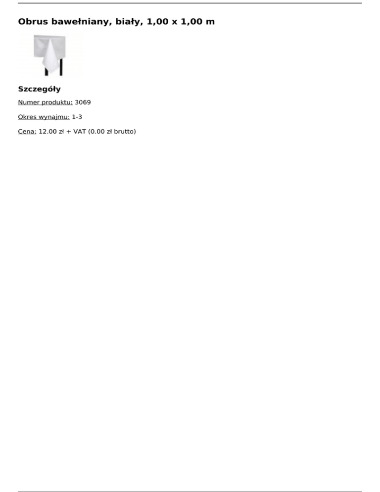Obrus bawełniany, biały, 1,00 x 1,00 m Szczegóły Numer produktu: 3069 Okres wynajmu: 1-3 Cena: 12.00 zł + VAT (0.00 zł brutto) Powered by TCPDF (www.tcpdf.org)