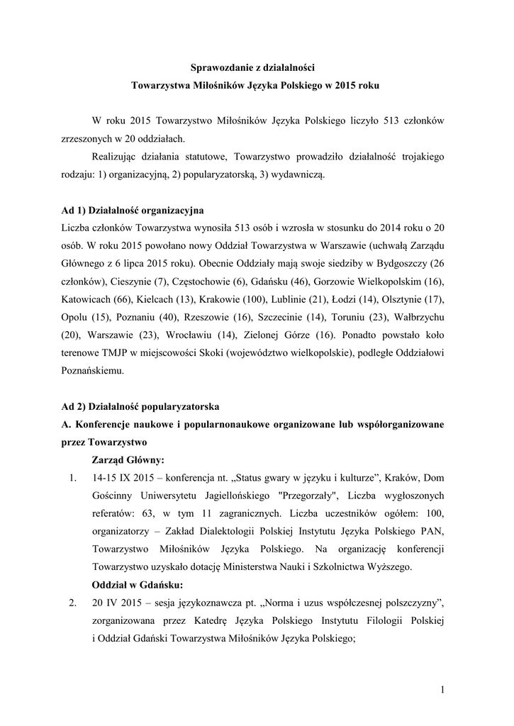 Sprawozdanie z działalności Towarzystwa Miłośników Języka Polskiego w 2015 roku W roku 2015 Towarzystwo Miłośników Języka Polskiego liczyło 513 członków zrzeszonych w 20 oddziałach. Realizując działania statutowe, Towarzystwo prowadziło działalność trojakiego rodzaju: 1) organizacyjną, 2) popularyzatorską, 3) wydawniczą. Ad 1) Działalność organizacyjna Liczba członków Towarzystwa wynosiła 513 osób i wzrosła w stosunku do 2014 roku o 20 osób. W roku 2015 powołano nowy Oddział Towarzystwa w Warszawie (uchwałą Zarządu Głównego z 6 lipca 2015 roku). Obecnie Oddziały mają swoje siedziby w Bydgoszczy (26 członków), Cieszynie (7), Częstochowie (6), Gdańsku (46), Gorzowie Wielkopolskim (16), Katowicach (66), Kielcach (13), Krakowie (100), Lublinie (21), Łodzi (14), Olsztynie (17), Opolu (15), Poznaniu (40), Rzeszowie (16), Szczecinie (14), Toruniu (23), Wałbrzychu (20), Warszawie (23), Wrocławiu (14), Zielonej Górze (16). Ponadto powstało koło terenowe TMJP w miejscowości Skoki (województwo wielkopolskie), podległe Oddziałowi Poznańskiemu. Ad 2) Działalność popularyzatorska A. Konferencje naukowe i popularnonaukowe organizowane lub współorganizowane przez Towarzystwo Zarząd Główny: 1. 14-15 IX 2015 – konferencja nt. „Status gwary w języku i kulturze”, Kraków, Dom Gościnny Uniwersytetu Jagiellońskiego "Przegorzały", Liczba wygłoszonych referatów: 63, w tym 11 zagranicznych. Liczba uczestników ogółem: 100, organizatorzy – Zakład Dialektologii Polskiej Instytutu Języka Polskiego PAN, Towarzystwo Miłośników Języka Polskiego. Na organizację konferencji Towarzystwo uzyskało dotację Ministerstwa Nauki i Szkolnictwa Wyższego. Oddział w Gdańsku: 2. 20 IV 2015 – sesja językoznawcza pt. „Norma i uzus współczesnej polszczyzny”, zorganizowana przez Katedrę Języka Polskiego Instytutu Filologii Polskiej i Oddział Gdański Towarzystwa Miłośników Języka Polskiego; 1 3. 25 V 2015 – VII konferencja językoznawcza z cyklu „W świecie słów i znaczeń” poświęcona pamięci Bogusława Krei pt. Słowotwórstwo języka mówionego i pisanego, zorganizowana przez Katedrę Języka Polskiego Instytutu Filologii Polskiej Uniwersytetu Gdańskiego oraz Oddział Gdański Towarzystwa Miłośników Języka Polskiego. Oddział w Gorzowie Wielkopolskim: 4. 27 III 2015 – Młodzieżowa Sesja Popularnonaukowa Człowiek XXI wieku w świecie słów, Gorzów Wielkopolski; 8 referatów; ok. 60 uczestników; współorganizator: IV Liceum Ogólnokształcące im. T. Kotarbińskiego w Gorzowie Wielkopolskim. Oddział w Katowicach: 5. 20-26 II 2015 – Festiwal Języka Ojczystego, zorganizowany przez Oddział Katowicki TMJP (współorganizatorzy: Instytut Języka Polskiego UŚ, CINiBA, Wydział Katechetyczny Kurii Metropolitalnej w Katowicach, Wydział Teologiczny UŚ) z okazji Międzynarodowego Dnia Języka Ojczystego (Katowice, 20, 25 i 26 II 2015 r.) – panel dyskusyjny, warsztaty i pogadanki językowe (sprawozdanie z festiwalu opublikowano w „Języku Polskim” (2015, z. 4, s. 395-396). 6. 21 IV 2015 – ogólnopolska konferencja naukowa (zorganizowana przez Instytut Języka Polskiego UŚ oraz Oddział Katowicki TMJP) pt. Dyskurs autopromocyjny dawniej i dziś – 12 referatów. Oddział w Kielcach: 7. 22-23 IV 2015 – współorganizacja ogólnopolskiej interdyscyplinarnej konferencji naukowej pt. „Człowiek – istota mówiąca”; 28 referatów i 3 postery; 32 zarejestrowanych uczestników oraz pracownicy i studenci UJK, kieleccy logopedzi, niespecjaliści zainteresowani tą tematyką; IFP UJK i KTN; 8. 24 IV 2015 – współorganizacja ogólnopolskiej interdyscyplinarnej konferencji dla doktorantów i studentów pt. „Jak to dobrze powiedzieć. Różnorodne aspekty komunikacji”; 39 referatów; 40 zarejestrowanych uczestników oraz pracownicy i studenci UJK, niespecjaliści zainteresowani tą tematyką; IFP UJK i KTN; 9. 28-29 IX 2015 – współorganizacja LXXIII Zjazdu PTJ pt. „Granice interpretacji lingwistycznej”; 36 referatów, 4 plakaty; 70 zarejestrowanych uczestników oraz pracownicy i studenci UJK, specjaliści i niespecjaliści zainteresowani tematyką zjazdu; PTJ, IFP UJK i KTN. Oddział w Rzeszowie: 2 10. 26-27 II 2015 – Rzeszów, Ogólnopolska Konferencja Naukowa „Język nasz ojczysty w sferze życia rodzinnego”, liczba wygłoszonych referatów – 18, liczba uczestników ogółem – 55, współorganizator: Zakład Języka Polskiego Instytutu Filologii Polskiej Uniwersytetu Rzeszowskiego. Oddział w Szczecinie: 11. 11-12 V 2015 – Pobierowo, „Dyskursy trzeciego tysiąclecia III” – ogólnopolska konferencja naukowa z udziałem gości zagranicznych, współorganizacja przez TMJP Oddział w Szczecinie, liczba referatów: 25, liczba uczestników: 30, współorganizacja: Instytut Polonistyki i Kulturoznawstwa Uniwersytetu Szczecińskiego; 12. 10-12 VI 2015 – Pobierowo, „Współczesny i dawny obraz mężczyzny w literaturze, języku, kulturze, sztuce” – ogólnopolska konferencja interdyscyplinarna, współorganizacja przez TMJP Oddział w Szczecinie, liczba referatów: 45, liczba uczestników: 53, współorganizacja: Instytut Polonistyki i Kulturoznawstwa Uniwersytetu Szczecińskiego; 13. 27-29 III 2015 – Pobierowo, ogólnopolska konferencja językoznawcza „Horyzonty języka IV, czyli jak daleko sięga językoznawstwo”, współorganizacja z Kołem Młodych Językoznawców Uniwersytetu Szczecińskiego, liczba referatów: 22, liczba uczestników: 45. Oddział w Toruniu: 14. 19 I 2015 – sesja naukowa z okazji jubileuszu Macieja Grochowskiego, w trakcie której referat pt. „Język – pytania podstawowe” wygłosił Andrzej Bogusławski (ok. 50 osób; współorganizator: Instytut Języka Polskiego Uniwersytetu Mikołaja Kopernika w Toruniu). Oddział w Wałbrzychu: 15. 12-13 VI 2015 – Świebodzice, sesja popularnonaukowa w ramach Dni Kultury Regionalnej w Świebodzicac