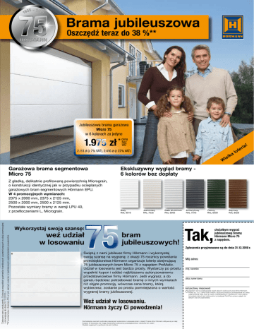 Brama jubileuszowa Oszczędź teraz do 38 %** Jubileuszowa brama garażowa Micro 75 w 6 kolorach za jedyne 1.9 zł * cena bez VAT 2.113 zł (z 7% VAT), 2.410 zł (z 22% VAT) W Garażowa brama segmentowa Micro 75 Ekskluzywny wygląd bramy 6 kolorów bez dopłaty Z gładką, delikatnie profilowaną powierzchnią Micrograin, o konstrukcji identycznej jak w przypadku ocieplanych garażowych bram segmentowych Hörmann EPU. W 4 promocyjnych wymiarach: 2375 x 2000 mm, 2375 x 2125 mm, 2500 x 2000 mm, 2500 x 2125 mm. Pozostałe wymiary bramy w wersji LPU 40, z przetłoczeniami L, Micrograin. Biały RAL 9016 Jasnoszary RAL 7035 Białe Aluminium RAL 9006 Antracytowy RAL 7016 Zielony RAL 6009 k iel a l e ot ria ! Brązowy RAL 8028 Wykorzystaj swoją szansę: i obowiązują do dnia 31.12.2010 r. **W porównaniu z bramą LPU w tym samym wzorze i z jednakowym wykończeniem powierzchni. *Zalecane ceny producenta. Dotyczą wszystkich partnerów handlowych uczestniczących w akcji promocyjnej M233 weź udział w losowaniu bram jubileuszowych! Świętuj z nami jubileusz firmy Hörmann i wykorzystaj swoją szansę na wygraną: z okazji 75 rocznicy powstania przedsiębiorstwa Hörmann organizuje loterię obejmującą 75 jubileuszowych bram Micro 75 z napędem ProMatic. Udział w losowaniu jest bardzo prosty. Wystarczy po prostu wypełnić kupon i oddać najbliższemu autoryzowanemu przedstawicielowi firmy Hörmann. Jeśli wygrasz, a do garażu będziesz potrzebować bramę o innych wymiarach niż objęte promocją, wówczas cena bramy, którą wybierzesz, zostanie po prostu pomniejszona o wartość wygranej bramy jubileuszowej. Weź udział w losowaniu. Hörmann życzy Ci powodzenia! Dochodzenie roszczeń na drodze prawnej jest wykluczone. Losowanie bram z okazji 75-lecia firmy Hörmann odbywa się w całej Europie. W losowaniu nie mogą uczestniczyć pracownicy przedsiębiorstwa i członkowi ich rodzin. Wypłata wygranych w gotówce nie jest możliwa. Tak, chciałbym wygrać jubileuszową bramę Hörmann Micro 75 z napędem. Zgłoszenia przyjmowane są do dnia 31. 12. 2010 r. Mój adres: imię, nazwisko ulica, numer domu kod pocztowy, miejscowość Zgadzam się na przetwarzanie moich danych osobowych przez firmę Hörmann Polska sp. z o.o. (KRS 0000104824) i jej autoryzowanych przedstawicieli do celów organizowanej loterii oraz do celów marketingowych i handlowych. Informujemy, że podanie danych jest dobrowolne i przysługuje Pani/Panu prawo wglądu do danych oraz ich poprawiania. Jubileuszowe ceny: dzięki nim wymiana Drzwi zewnętrzne RenoDoor 75 jedynie Garażowa brama segmentowa RenoMatic 75 z napędem jedynie cena bez VAT 3.932 zł (z 7% VAT), 4.484 zł (z 22% VAT) cena bez VAT 2.969 zł (z 7% VAT), 3.386 zł (z 22% VAT) 3.6 zł * 2.7 zł * zchni powier Zalety in a Decogr y charakter drewnćacieplna Garażowa brama segmentowa RenoMatic 75 Razem z napędem do bram garażowych Hörmann ProMatic. Brama o konstrukcji identycznej jak w przypadku ocieplanych segmentowych bram garażowych Hörmann EPU. W 4 promocyjnych wymiarach: 2375 x 2000 mm, 2375 x 2125 mm, 2500 x 2000 mm, 2500 x 2125 mm. Pozostałe wymiary bramy w wersji LPU 40, z przetłoczeniami M i takim samym wykończeniem powierzchni. Drzwi zewnętrzne RenoDoor 75 Konstrukcja identyczna jak w przypadku drzwi zewnętrznych Hörmann ThermoPro z aluminiową ościeżnicą, w promocyjnym wymiarze 1100 x 2100 mm. Głębokość montażowa 46 mm. Inne wymiary drzwi dostępne na zapytanie. 4 rodzaje wysokiej jakości powierzchni w jednej jubileuszowej cenie oś raln • Natu dobra izolacyjn zo • Bard czna ać i akusty trzeba malow y nie ię s m a ra z c B a • yp a nie w • Bram Powierzchnia w strukturze Silkgrain, kolor biały Powierzchnia Decograin Golden Oak Brama garażowa z powierzchnią Silkgrain, kolor biały, stalowe drzwi zewnętrzne lakierowane w kolorze białym. Dzięki wrażeniu niezwykłej elegancji półmatowa powierzchnia Silkgrain pasuje szczególnie do nowoczesnych rozwiązań architektonicznych. Brama garażowa i stalowe drzwi zewnętrzne z powierzchnią Decograin Golden Oak. Dzięki wytłoczonym słojom ta odporna na działanie promieni UV powierzchnia sprawia wrażenie wykonanej z prawdziwego drewna. Powierzchnia Decograin Titan Metallic Powierzchnia Decograin Dark Oak Stalowa brama garażowa i drzwi zewnętrzne z powierzchnią Decograin Titan Metallic. Ta powłoka odporna na działanie promieni UV ma bardzo ekskluzywny i szlachetny charakter – wykończenie jest podobne do koloru CH 703 Hörmann. Brama garażowa i stalowe drzwi zewnętrzne z powierzchnią Decograin Dark Oak. Dzięki wytłoczonym słojom ta odporna na działanie promieni UV powierzchnia nie tylko wygląda jak prawdziwe drewno (ciemny dąb), lecz przypomina je również w dotyku. a bramy sprawi Ci podwójną radość Brama uchylna Pearl 75 jedynie 7 Drzwi zewnętrzne RenoDoor 75 light jedynie 1.9 zł * cena bez VAT 829 zł (z 7% VAT), 946 zł (z 22% VAT) zł * cena bez VAT 2.113 zł (z 7% VAT), 2.410 zł (z 22% VAT) Drzwi zewnętrzne RenoDoor 75 light Brama uchylna Pearl 75 Z powierzchnią strukturalną Pearlgrain w 2 kolorach w tej samej cenie. W 4 promocyjnych wymiarach: 2375 x 2000 mm, 2375 x 2125 mm, 2500 x 2000 mm, 2500 x 2125 mm. Konstrukcja identyczna jak w przypadku drzwi Biały RAL 9016 zewnętrznych Hörmann ThermoPro z aluminiową ościeżnicą, w 2 kolorach w tej samej cenie i w promocyjnym wymiarze 1100 x 2100 mm. Głębokość montażowa 46 mm. Inne wymiary drzwi dostępne na zapytanie. Brązowy RAL 8028 Biały RAL 9016 Brązowy RAL 8028 Napęd do bram skrzydłowych RotaMatic 2 Napęd do bram przesuwnych LineaMatic www.hoermann.com Informacje dla budujących nowe domy i planujących remont: wszystko na temat bram garażowych, napędów, drzwi zewnętrznych i innych produktów firmy Hörmann. Napęd do bram skrzydłowych • Wytrzymały napęd RotaMatic 2 jedynie elektromechaniczny z dwoma siłownikami * cena bez VAT do 2-skrzydłowych bram 1.922 zł (