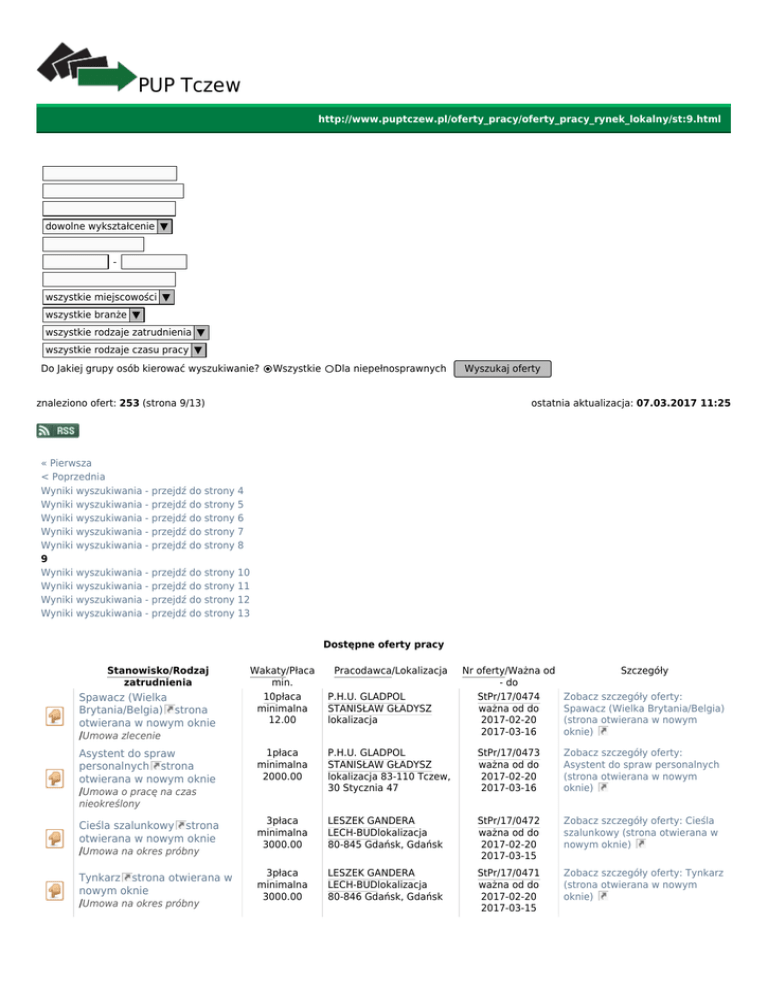PUP Tczew http://www.puptczew.pl/oferty_pracy/oferty_pracy_rynek_lokalny/st:9.html Ukryj wyszukiwarke dowolne wykształcenie ▼ wszystkie miejscowości ▼ wszystkie branże ▼ wszystkie rodzaje zatrudnienia ▼ wszystkie rodzaje czasu pracy ▼ Do Jakiej grupy osób kierować wyszukiwanie? Wszystkie Dla niepełnosprawnych znaleziono ofert: 253 (strona 9/13) Wyszukaj oferty ostatnia aktualizacja: 07.03.2017 11:25 « Pierwsza < Poprzednia Wyniki wyszukiwania - przejdź do strony 4 Wyniki wyszukiwania - przejdź do strony 5 Wyniki wyszukiwania - przejdź do strony 6 Wyniki wyszukiwania - przejdź do strony 7 Wyniki wyszukiwania - przejdź do strony 8 9 Wyniki wyszukiwania - przejdź do strony 10 Wyniki wyszukiwania - przejdź do strony 11 Wyniki wyszukiwania - przejdź do strony 12 Wyniki wyszukiwania - przejdź do strony 13 Dostępne oferty pracy Stanowisko/Rodzaj zatrudnienia Spawacz (Wielka Brytania/Belgia) strona otwierana w nowym oknie /Umowa zlecenie Wakaty/Płaca min. 10płaca minimalna 12.00 Pracodawca/Lokalizacja P.H.U. GLADPOL STANISŁAW GŁADYSZ lokalizacja Nr oferty/Ważna od - do StPr/17/0474 ważna od do 2017-02-20 2017-03-16 Szczegóły Zobacz szczegóły oferty: Spawacz (Wielka Brytania/Belgia) (strona otwierana w nowym oknie) 1płaca minimalna 2000.00 P.H.U. GLADPOL STANISŁAW GŁADYSZ lokalizacja 83-110 Tczew, 30 Stycznia 47 StPr/17/0473 ważna od do 2017-02-20 2017-03-16 Zobacz szczegóły oferty: Asystent do spraw personalnych (strona otwierana w nowym oknie) Cieśla szalunkowy strona otwierana w nowym oknie /Umowa na okres próbny 3płaca minimalna 3000.00 LESZEK GANDERA LECH-BUDlokalizacja 80-845 Gdańsk, Gdańsk StPr/17/0472 ważna od do 2017-02-20 2017-03-15 Zobacz szczegóły oferty: Cieśla szalunkowy (strona otwierana w nowym oknie) Tynkarz strona otwierana w nowym oknie /Umowa na okres próbny 3płaca minimalna 3000.00 LESZEK GANDERA LECH-BUDlokalizacja 80-846 Gdańsk, Gdańsk StPr/17/0471 ważna od do 2017-02-20 2017-03-15 Zobacz szczegóły oferty: Tynkarz (strona otwierana w nowym oknie) Asystent do spraw personalnych strona otwierana w nowym oknie /Umowa o pracę na czas nieokreślony Stanowisko/Rodzaj zatrudnienia Wakaty/Płaca min. 3płaca minimalna 3000.00 LESZEK GANDERA LECH-BUDlokalizacja 80-845 Gdańsk, Gdańsk Murarz strona otwierana w nowym oknie /Umowa na okres próbny 3płaca minimalna 3000.00 LESZEK GANDERA LECH-BUDlokalizacja 80-845 Gdańsk, Gdańsk StPr/17/0469 ważna od do 2017-02-20 2017-03-15 Zobacz szczegóły oferty: Murarz (strona otwierana w nowym oknie) Pracownik produkcji strona otwierana w nowym oknie /Umowa o pracę na czas 5płaca minimalna 2000.00 MBF SP. Z O.O.lokalizacja 83-110 Tczew, Skarszewska 1 StPr/17/0468 ważna od do 2017-02-17 2017-03-17 Zobacz szczegóły oferty: Pracownik produkcji (strona otwierana w nowym oknie) 1płaca minimalna 2000.00 IMPEL SECURITY POLSKA SP. Z O.O. OCHRONA OSÓB I MIENIAlokalizacja 82-200 Malbork, Malbork StPr/17/0460 ważna od do 2017-02-17 2017-03-17 Zobacz szczegóły oferty: Pracownik ochrony (z orzeczeniem o nieopelnosprawności) (strona otwierana w nowym oknie) Sprzedawca strona otwierana w nowym oknie /Umowa zlecenie 1płaca minimalna 2000.00 " DEJTA " Żaneta Data lokalizacja 83-110 Tczew, Pomorska 1 StPr/17/0452 ważna od do 2017-02-17 2017-03-17 Zobacz szczegóły oferty: Sprzedawca (strona otwierana w nowym oknie) Ustawiacz / Manewrowy strona otwierana w nowym oknie /Umowa na okres próbny 2płaca minimalna 2000.00 PKP CARGOTABOR SP. Z O.O.lokalizacja 83-110 Tczew, Solidarności 16 StPr/17/0451 ważna od do 2017-02-17 2017-03-31 Zobacz szczegóły oferty: Ustawiacz / Manewrowy (strona otwierana w nowym oknie) Technolog chemii gospodarczej (1/2 etatu) strona otwierana w nowym oknie /Umowa o pracę na czas 1płaca minimalna 1000.00 CREO JAN DOBOSZ lokalizacja 82-500 Brachlewo, Brachlewo 55A StPr/17/0450 ważna od do 2017-02-17 2017-03-31 Zobacz szczegóły oferty: Technolog chemii gospodarczej (1/2 etatu) (strona otwierana w nowym oknie) Operator maszyn skrawających strona otwierana w nowym oknie /Umowa na okres próbny 2płaca minimalna 2000.00 PKP CARGOTABOR SP. Z O.O.lokalizacja 83-110 Tczew, Solidarności 16 StPr/17/0449 ważna od do 2017-02-17 2017-03-31 Zobacz szczegóły oferty: Operator maszyn skrawających (strona otwierana w nowym oknie) Spawacz strona otwierana w nowym oknie /Umowa na okres próbny 12płaca minimalna 2000.00 PKP CARGOTABOR SP. Z O.O.lokalizacja 83-110 Tczew, Solidarności 16 StPr/17/0448 ważna od do 2017-02-17 2017-03-31 Zobacz szczegóły oferty: Spawacz (strona otwierana w nowym oknie) Elektromonter strona otwierana w nowym oknie /Umowa na okres próbny 6płaca minimalna 2000.00 PKP CARGOTABOR SP. Z O.O.lokalizacja 83-110 Tczew, Solidarności 16 StPr/17/0447 ważna od do 2017-02-17 2017-03-31 Zobacz szczegóły oferty: Elektromonter (strona otwierana w nowym oknie) Elektromechanik strona otwierana w nowym oknie /Umowa na okres próbny 9płaca minimalna 2000.00 PKP CARGOTABOR SP. Z O.O.lokalizacja 83-110 Tczew, Solidarności 16 StPr/17/0446 ważna od do 2017-02-17 2017-03-31 Zobacz szczegóły oferty: Elektromechanik (strona otwierana w nowym oknie) Rzemieślnik strona otwierana w nowym oknie /Umowa na okres próbny 8płaca minimalna 2000.00 PKP CARGOTABOR SP. Z O.O.lokalizacja 83-110 Tczew, Solidarności 16 StPr/17/0445 ważna od do 2017-02-17 2017-03-31 Zobacz szczegóły oferty: Rzemieślnik (strona otwierana w nowym oknie) Przedstawiciel handlowy strona otwierana w nowym oknie /Umowa o pracę na czas 1płaca minimalna 2000.00 CREO JAN DOBOSZ lokalizacja 83-110 Tczew, Tczew StPr/17/0444 ważna od do 2017-02-17 2017-03-31 Zobacz szczegóły oferty: Przedstawiciel handlowy (strona otwierana w nowym oknie) 1płaca minimalna 2500.00 TADEUSZ BĄK - ZAKŁAD PRODUKCJI I USŁUG TECHNICZNYCH METO lokalizacja 82-223 Lisewo Malborskie, Lisewo Malborskie StPr/17/0439 ważna od do 2017-02-17 2017-03-15 Zobacz szczegóły oferty: Operator CNC (centrum obróbki skrawa