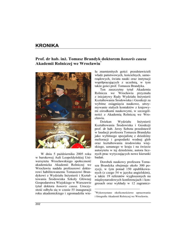 KRONIKA Prof. dr hab. inŜ. Tomasz Brandyk doktorem honoris causa Akademii Rolniczej we Wrocławiu* W dniu 5 października 2005 roku w barokowej Auli Leopoldyńskiej Uniwersytetu Wrocławskiego społeczność akademicka Akademii Rolniczej we Wrocławiu nadała profesorowi doktorowi habilitowanemu Tomaszowi Brandykowi z Wydziału InŜynierii i Kształtowania Środowiska Szkoły Głównej Gospodarstwa Wiejskiego w Warszawie tytuł doktora honoris causa. Uroczystość odbyła się w czasie 55 inauguracji roku akademickiego i zgromadziła wie- 202 lu znamienitych gości: przedstawicieli władz państwowych, kościelnych, samorządowych, świata nauki oraz instytucji współpracujących z uczelnią, w tym takŜe gości prof. Tomasza Brandyka. Ten zaszczytny tytuł Akademia Rolnicza we Wrocławiu przyznała z inicjatywy Rady Wydziału InŜynierii Kształtowania Środowiska i Geodezji za wybitne osiągnięcia naukowe, utrzymywanie stałych kontaktów z krajowymi ośrodkami naukowymi, w szczególności z Akademią Rolniczą we Wrocławiu. ∗ Dziekan Wydziału InŜynierii Kształtowania Środowiska i Geodezji prof. dr hab. Jerzy Sobota przedstawił w laudacji profesora Tomasza Brandyka jako wybitnego specjalistę z dziedziny melioracji i gospodarki wodnej gleb oraz kształtowania środowiska wiejskiego, uznanego w kraju i na świecie autorytetu w tej dziedzinie, autora licznych prac wytyczających nowe kierunki badań. Dorobek naukowy profesora Tomasza Brandyka obejmuje około 300 pozycji, w tym ponad 150 opublikowanych (z czego 54 w języku angielskim), a takŜe 19 referatów wygłoszonych na międzynarodowych konferencjach i kongresach oraz wykłady w 12 zagranicz∗ Wykorzystano okolicznościowe opracowania i fotografie Akademii Rolniczej we Wrocławiu. nych ośrodkach uniwersyteckich, w których przebywał na długoterminowych staŜach naukowych (Iowa State University, Institute for Land and Water Management Research i University College Dublin), oraz podczas staŜy krótkoterminowych w ośrodkach naukowych w Wielkiej Brytanii, Belgii, Holandii, Niemczech, Austrii, Turcji i Stanach Zjednoczonych. Tematyka badawcza profesora Tomasza Brandyka obejmuje badania dotyczące: wpływu nawodnień nawoŜących i oczyszczających na parametry fizyczne i wodne gleb, metod pomiaru parametrów glebowych charakteryzujących ruch wody w strefie nienasyconej i oceny zmienności przestrzennej tych parametrów, zastosowania modelowania matematycznego w gospodarce wodnej gleb dolinowych, znaczenia uwilgotnienia gleby w modelowaniu klimatu, gospodarowania wodą na potrzeby ochronyi renaturyzacji zdegradowanych gleb torfowych, analizy przepływu wody w glebach o zmiennej geometrii. Jest współautorem skryptu Ćwiczenia z melioracji rolnych – drenowanie (1980, 1988) oraz podręczników: Współczesne problemy melioracji (1993), Ochrona i zrównowaŜony rozwój środowiska wiejskiego (1996), Geosyntetyki w konstrukcjach inŜynierskich (2000), The quality of organic soils and peat materials in agriculture (2002), Torfowiska i torf (2002). Profesor Tomasz Brandyk był dziekanem Wydziału Melioracji i InŜynierii Środowiska SGGW w Warszawie w latach 1994–1999, od 2000 roku jest kierownikiem Katedry Kształtowania Środowiska na Wydziale InŜynierii i Kształtowania Środowiska SGGW. W 2002 roku został członkiem korespondentem PAN, a od 2003 roku jest wiceprzewodniczącym Wydziału V Nauk Rolniczych, Leśnych i Weterynaryjnych PAN. Profesor Tomasz Brandyk pełni wiele odpowiedzialnych funkcji z wyboru w instytucjach krajowych i zagranicznych: od 2004 roku jest wiceprzewodniczącym Międzynarodowego Stowarzyszenia Torfowego (IPS), od 2000 roku – członkiem komisji III IPS „Agricultural Use of Peat”, w której pełnił 203 funkcję przewodniczącego w latach 2000–2004, od 2003 roku – członkiem Sekcji III Nauk Biologicznych, Rolniczych i Leśnych Centralnej Komisji ds. Stopni i Tytułów, od 1999 roku – członkiem Prezydium Komitetu Melioracji i InŜynierii Środowiska Rolniczego PAN, od 2003 roku – wiceprzewodniczącym Polskiego Komitetu Narodowego IPS, od 1999 roku – członkiem Prezydium Komitetu Krajowego Międzynarodowej Komisji Nawodnień i Odwodnień (ICID), od 1999 roku – członkiem Rady Naukowej Instytutu Melioracji i UŜytków Zielonych w Falentach, a od 2002 roku – członkiem Rady Naukowej Zakładu Badań Środowiska Rolniczego i Leśnego PAN w Poznaniu. Profesor Tomasz Brandyk aktywnie uczestniczy w pracach wydawnictw i czasopism naukowych, jest m.in. członkiem Komitetu Redakcyjnego czasopisma Postępy Nauk Rolniczych, członkiem rad redakcyjnych czasopism: Academia, Acta Agrophysica, Peatlands International oraz członkiem Rady Programowej Woda. Środowisko. Obszary wiejskie. 204 Związki profesora Brandyka z wrocławską Akademią Rolniczą są wieloletnie i wielostronne. Obejmują współpracę w zakresie kształcenia kadr, modernizacji planów i programów studiów oraz badań naukowych. Gratulacje z okazji wręczenia tytułu doktora honoris causa profesorowi Tomaszowi Brandykowi przesłali ministrowie: Edukacji Narodowej, Nauki i Informatyzacji oraz Rolnictwa i Rozwoju Wsi, Prezes Polskiej Akademii Nauk, przedstawiciele parlamentu i samorządów oraz rektorzy wyŜszych uczelni. Społeczność akademicka jednoimiennych wydziałów InŜynierii i Kształtowania Środowiska i katedr Melioracji i Kształtowania Środowiska uczelni rolniczych wraz z kadrą inŜynierską odczuwa satysfakcję z nadania profesorowi Tomaszowi Brandykowi tytułu doktora honoris causa. Jerzy Jeznach
