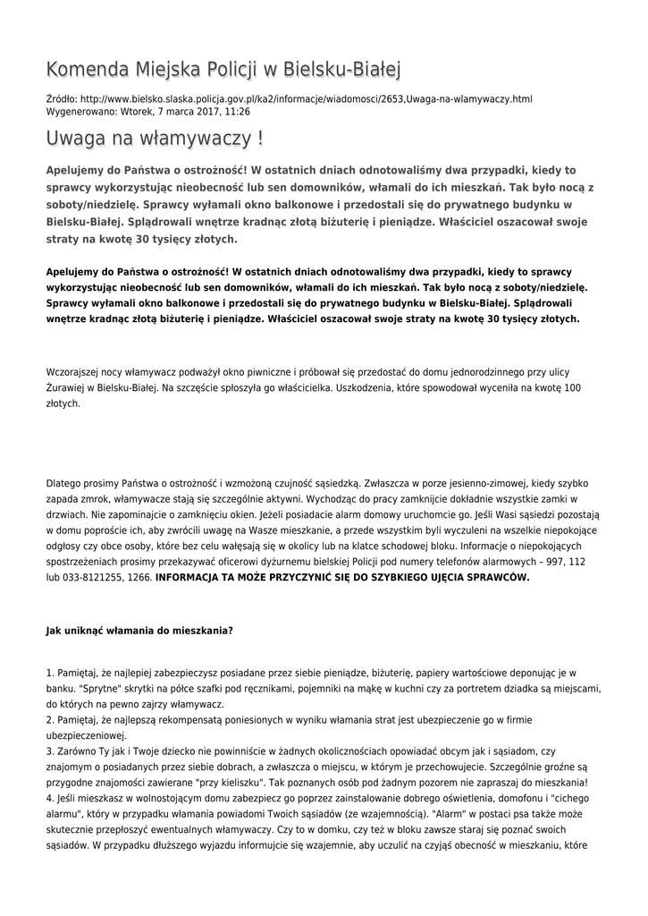 Komenda Miejska Policji w Bielsku-Białej Źródło: http://www.bielsko.slaska.policja.gov.pl/ka2/informacje/wiadomosci/2653,Uwaga-na-wlamywaczy.html Wygenerowano: Wtorek, 7 marca 2017, 11:26 Uwaga na włamywaczy ! Apelujemy do Państwa o ostrożność! W ostatnich dniach odnotowaliśmy dwa przypadki, kiedy to sprawcy wykorzystując nieobecność lub sen domowników, włamali do ich mieszkań. Tak było nocą z soboty/niedzielę. Sprawcy wyłamali okno balkonowe i przedostali się do prywatnego budynku w Bielsku-Białej. Splądrowali wnętrze kradnąc złotą biżuterię i pieniądze. Właściciel oszacował swoje straty na kwotę 30 tysięcy złotych. Apelujemy do Państwa o ostrożność! W ostatnich dniach odnotowaliśmy dwa przypadki, kiedy to sprawcy wykorzystując nieobecność lub sen domowników, włamali do ich mieszkań. Tak było nocą z soboty/niedzielę. Sprawcy wyłamali okno balkonowe i przedostali się do prywatnego budynku w Bielsku-Białej. Splądrowali wnętrze kradnąc złotą biżuterię i pieniądze. Właściciel oszacował swoje straty na kwotę 30 tysięcy złotych. Wczorajszej nocy włamywacz podważył okno piwniczne i próbował się przedostać do domu jednorodzinnego przy ulicy Żurawiej w Bielsku-Białej. Na szczęście spłoszyła go właścicielka. Uszkodzenia, które spowodował wyceniła na kwotę 100 złotych. Dlatego prosimy Państwa o ostrożność i wzmożoną czujność sąsiedzką. Zwłaszcza w porze jesienno-zimowej, kiedy szybko zapada zmrok, włamywacze stają się szczególnie aktywni. Wychodząc do pracy zamknijcie dokładnie wszystkie zamki w drzwiach. Nie zapominajcie o zamknięciu okien. Jeżeli posiadacie alarm domowy uruchomcie go. Jeśli Wasi sąsiedzi pozostają w domu poproście ich, aby zwrócili uwagę na Wasze mieszkanie, a przede wszystkim byli wyczuleni na wszelkie niepokojące odgłosy czy obce osoby, które bez celu wałęsają się w okolicy lub na klatce schodowej bloku. Informacje o niepokojących spostrzeżeniach prosimy przekazywać oficerowi dyżurnemu bielskiej Policji pod numery telefonów alarmowych – 997, 112 lub 033-8121255, 1266. INFORMACJA TA MOŻE PRZYCZYNIĆ SIĘ DO SZYBKIEGO UJĘCIA SPRAWCÓW. Jak uniknąć włamania do mieszkania? 1. Pamiętaj, że najlepiej zabezpieczysz posiadane przez siebie pieniądze, biżuterię, papiery wartościowe deponując je w banku. "Sprytne" skrytki na półce szafki pod ręcznikami, pojemniki na mąkę w kuchni czy za portretem dziadka są miejscami, do których na pewno zajrzy włamywacz. 2. Pamiętaj, że najlepszą rekompensatą poniesionych w wyniku włamania strat jest ubezpieczenie go w firmie ubezpieczeniowej. 3. Zarówno Ty jak i Twoje dziecko nie powinniście w żadnych okolicznościach opowiadać obcym jak i sąsiadom, czy znajomym o posiadanych przez siebie dobrach, a zwłaszcza o miejscu, w którym je przechowujecie. Szczególnie groźne są przygodne znajomości zawierane "przy kieliszku". Tak poznanych osób pod żadnym pozorem nie zapraszaj do mieszkania! 4. Jeśli mieszkasz w wolnostojącym domu zabezpiecz go poprzez zainstalowanie dobrego oświetlenia, domofonu i "cichego alarmu", który w przypadku włamania powiadomi Twoich sąsiadów (ze wzajemnością). "Alarm" w postaci psa także może skutecznie przepłoszyć ewentualnych włamywaczy. Czy to w domku, czy też w bloku zawsze staraj się poznać swoich sąsiadów. W przypadku dłuższego wyjazdu informujcie się wzajemnie, aby uczulić na czyjąś obecność w mieszkaniu, które powinno być puste. Poproś, aby sąsiedzi regularnie opróżniali skrzynkę na listy. 5. Spisz numery posiadanego sprzętu elektronicznego oraz znaki szczególne, jakie on posiada. Nanieś w dyskretnych miejscach sprzętu, tylko sobie wiadome oznakowanie. Dzięki temu łatwiej udowodnisz, że skradzione przedmioty stanowią Twoją własność. Sugerujemy sfotografowanie następujących rzeczy: - kolekcja znaczków pocztowych, - kolekcja monet, - antyki i biżuteria 6. Niech każda obca i dziwnie zachowująca się osoba (wyczekiwanie na klatce schodowej, kręcenie się bez celu przy drzwiach mieszkań) wzbudzi Twoją czujność. Postaraj się zapamiętać ich wygląd zewnętrzny oraz charakterystyczne szczegóły wyglądu i ubrania, które później pomogą Policji w zidentyfikowaniu danej osoby. 7. Nie wpuszczaj do domu obcych osób, które chcą sprzedać lub zareklamować Ci jakiś towar. Jeśli się na to zdecydujesz sprawdź ich dokumenty i tożsamość. Pamiętaj! Taka z pozoru "niewinna" wizyta może być rozpoznaniem terenu przyszłego działania. 8. Pamiętaj! Typowe drzwi wraz z wkładkami patentowymi, podklamkowymi instalowane w blokach mieszkalnych, nie stanowią żadnej przeszkody dla włamywacza. Tylko atestowane zamki i drzwi mogą stworzyć przeszkodę i wydłużyć czas potrzebny na ich pokonanie, co może zaalarmować sąsiada i narazić włamywacza na zatrzymanie. Na rynku jest obecnie w sprzedaży ponad 150 różnego rodzaju zamków, jednakże tylko niewielka ich ilość posiada "Świadectwo Badań Kwalifikacyjnych", który to dokument jest wyznacznikiem ich jakości. Stosuj zamki o zróżnicowanej konstrukcji i zasadzie działania mechanizmów. Wskazanie jest zamontowanie łańcucha i wizjera. W sprzedaży są zamki połączone z akustycznym sygnałem dźwiękowym. 9. Nie zostawiaj kluczy pod wycieraczką lub w innych umówionych miejscach. Nigdy nie powierzaj kluczy osobie mało Ci znanej i zabroń tego dziecku. Drzwi nie są jedyną drogą, którą może wejść włamywacz. W oknach proponujemy wymianę zwykłych klamek na takie, które umożliwiają odblokowanie ich od wewnątrz tylko przy użyciu klucza. Okna można zabezpieczyć folią antywłamaniową uniemożliwiającą wybicie szyby, roletami okiennymi czy kratami. Przy montażu krat należy pamiętać o ich kształcie - nie może ułatwiać wejścia włamywaczowi do sąsiadów mieszkających powyżej - jak po drabinie. 10. Pamiętaj, że włamywacz zani