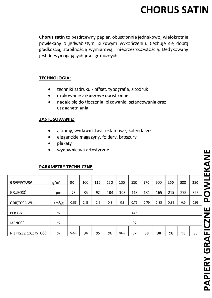 CHORUS SATIN Chorus satin to bezdrzewny papier, obustronnie jednakowo, wielokrotnie powlekany o jedwabistym, silkowym wykończeniu. Cechuje się dobrą gładkością, stabilnością wymiarową i nieprzezroczystością. Dedykowany jest do wymagających prac graficznych. TECHNOLOGIA: techniki zadruku - offset, typografia, sitodruk drukowanie arkuszowe obustronne nadaje się do tłoczenia, bigowania, sztancowania oraz uszlachetniania albumy, wydawnictwa reklamowe, kalendarze eleganckie magazyny, foldery, broszury plakaty wydawnictwa artystyczne PARAMETRY TECHNICZNE GRAMATURA GRUBOŚĆ OBJĘTOŚĆ WŁ. g/m2 90 100 115 130 135 150 170 200 250 300 350 µm 78 85 92 104 108 118 134 165 215 275 325 cm³/g 0,86 0,85 0,8 0,8 0,8 0,79 0,79 0,83 0,86 0,9 0,93 98 98 98 98 98 POŁYSK % <45 JASNOŚĆ % 97 NIEPRZEZROCZYSTOŚĆ % 92,5 94 95 96 96,5 97 PAPIERY GRAFICZNE POWLEKANE ZASTOSOWANIE: