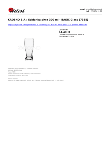 e-mail: [email protected] tel. : (17) 854 91 85 KROSNO S.A.: Szklanka piwa 300 ml - BASIC Glass (7335) http://stary.helios-szklo.pl/krosno-s.a.-szklanka-piwa-300-ml--basic-glass-7335-produkt-3539.html Cena brutto: 14.40 zł Cena katalogowa brutto: 16.00 zł Oszczędzasz: 1,60 zł Producent: Krośnieńskie Huty Szkła KROSNO S.A. Kolekcja: BASIC Glass Fason: 7335 Sposób wykonania: szkło automatycznie formowane Opakowanie: pudełko tekturowe Zestaw zawiera: Szklanka do piwa: pojemność 300 ml, wys.171 mm, średnica 71 mm, ilość –1 kpl. (6 szt.)