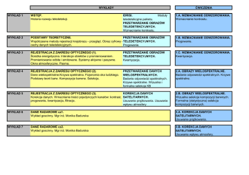 WYKŁADY ĆWICZENIA WYKŁAD 1 WSTĘP. Historia rozwoju teledetekcji. IDRISI. Moduły teledetekcyjne pakietu. PRZETWARZANIE OBRAZÓW TELEDETEKCYJNYCH. Wzmacnianie kontrastu. WYKŁAD 2 PRZETWARZANIE OBRAZÓW PODSTAWY TEORETYCZNE. Współczesne metody rejestracji krajobrazu - przegląd. Obraz cyfrowy - TELEDETEKCYJNYCH. cechy danych teledetekcyjnych. Progowanie. 1.B. WZMACNIANIE ODWZOROWANIA. Progowanie. WYKŁAD 3 REJESTRACJA Z ZAKRESU OPTYCZNEGO (1). ŚcieŜka energetyczna. Interakcje obiektów z promieniowaniem. Promieniowanie odbite i emitowane. Systemy aktywne i pasywne. Okna atmosferyczne. Pasma. PRZETWARZANIE OBRAZÓW TELEDETEKCYJNYCH. Kwantyzacja. 1.C. WZMACNIANIE ODWZOROWANIA. Kwantyzacja. WYKŁAD 4 REJESTRACJA Z ZAKRESU OPTYCZNEGO (2). Dane wielospektralne.Krzywa spektralna. Fizjonomia oka ludzkiego. Podstawy teorii barw. Kompozycje barwne. Selekcja. PRZETWARZANIE DANYCH WIELOSPEKTRALNYCH. Badanie odpowiedzi spektralnych. Krzywe spektralne. Wizualna i formalna selekcja KB 2.A. OBRAZY WIELOSPEKTRALNE. Badanie odpowiedzi spektralnych. Krzywe spektralne. WYKŁAD 5 REJESTRACJA Z ZAKRESU OPTYCZNEGO (3). KOREKCJA DANYCH Korekcja danych. Wmacnianie treści pojedynczych kanałów: kontrast, SATELITARNYCH. progowanie, kwantyzacja, filtracje. Usuwanie prąŜkowania. Usuwanie wpływu atmosfery 2.B. OBRAZY WIELOSPEKTRALNE. Wizualna selekcja kompozycji barwnych. Formalna (statystyczna) selekcja kompozycji barwnych. WYKŁAD 6 DANE RADAROWE cz1. Wykład goscinny. Mgr inŜ. Monika Badurska 3.A. KOREKCJA DANYCH SATELITARNYCH. Usuwanie prąŜkowania. WYKŁAD 7 DANE RADAROWE cz2. Wykład goscinny. Mgr inŜ. Monika Badurska 3.B. KOREKCJA DANYCH SATELITARNYCH. Usuwanie wpływu atmosfery. 1.A. WZMACNIANIE ODWZOROWANIA. Wzmacnianie kontrastu.
