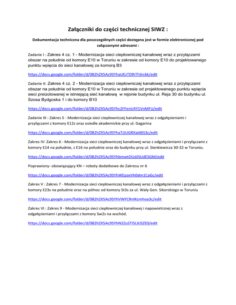 Załączniki do części technicznej SIWZ : Dokumentacja techniczna dla poszczególnych części dostępna jest w formie elektronicznej pod załączonymi adresami : Zadanie I : Zakres 4 cz. 1 - Modernizacja sieci ciepłowniczej kanałowej wraz z przyłączami obszar na południe od komory E10 w Toruniu w zakresie od komory E10 do projektowanego punktu wpięcia do sieci kanałowej za komorą B3 https://docs.google.com/folder/d/0B2hZX5Ac9SYhaUEzTDlhTFdrckk/edit Zadanie II: Zakres 4 cz. 2 - Modernizacja sieci ciepłowniczej kanałowej wraz z przyłączami obszar na południe od komory E10 w Toruniu w zakresie od projektowanego punktu wpięcia sieci preizolowanej w istniejącą sieć kanałową w rejonie budynku ul. Reja 30 do budynku ul. Szosa Bydgoska 1 i do komory B10 https://docs.google.com/folder/d/0B2hZX5Ac9SYhc2FFenU4Y1VnMFU/edit Zadanie III : Zakres 5 - Modernizacja sieci ciepłowniczej kanałowej wraz z odgałęzieniami i przyłączami z komory E12s oraz osiedle akademickie przy ul. Gagarina https://docs.google.com/folder/d/0B2hZX5Ac9SYhaTJJUGRXald6S3c/edit Zakres IV: Zakres 6 - Modernizacja sieci ciepłowniczej kanałowej wraz z odgałęzieniami i przyłączami z komory E14 na południe, z E16 na południe oraz do budynku przy ul. Sienkiewicza 30-32 w Toruniu. https://docs.google.com/folder/d/0B2hZX5Ac9SYhbmwtOUdJSUdESGM/edit Poprawiony- obowiązujący KN – roboty dodatkowe do Zakresu nr 6 https://docs.google.com/folder/d/0B2hZX5Ac9SYhWEpzeVh0dm1CaGc/edit Zakres V : Zakres 7 - Modernizacja sieci ciepłowniczej kanałowej wraz z odgałęzieniami i przyłączami z komory E23s na południe oraz na północ od komory St3s za ul. Wały Gen. Sikorskiego w Toruniu https://docs.google.com/folder/d/0B2hZX5Ac9SYhVWFCRnlKcmhoa3c/edit Zakres VI : Zakres 9 - Modernizacja sieci ciepłowniczej kanałowej i napowietrznej wraz z odgałęzieniami i przyłączami z komory Sw2s na wschód. https://docs.google.com/folder/d/0B2hZX5Ac9SYhN2ZuSTI5LXJSZE0/edit