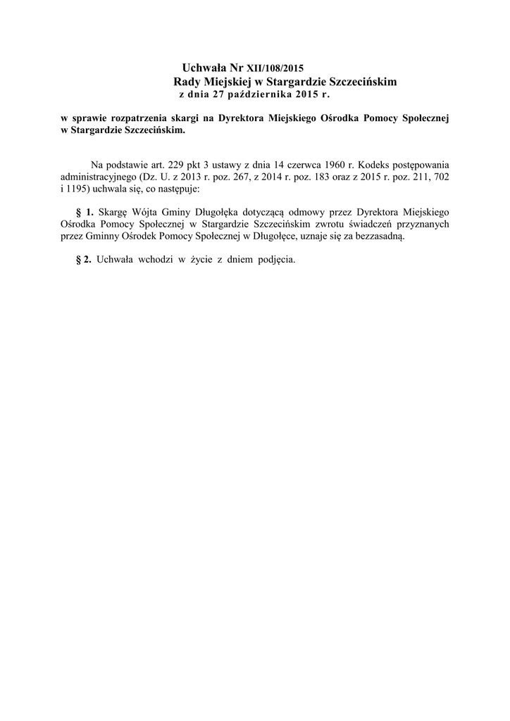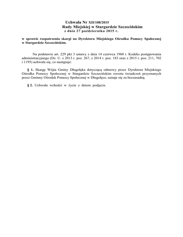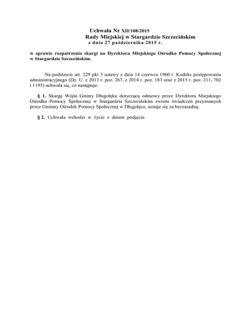 Uchwała Nr XII/108/2015 Rady Miejskiej w Stargardzie Szczecińskim z dnia 27 października 2015 r. w sprawie rozpatrzenia skargi na Dyrektora Miejskiego Ośrodka Pomocy Społecznej w Stargardzie Szczecińskim. Na podstawie art. 229 pkt 3 ustawy z dnia 14 czerwca 1960 r. Kodeks postępowania administracyjnego (Dz. U. z 2013 r. poz. 267, z 2014 r. poz. 183 oraz z 2015 r. poz. 211, 702 i 1195) uchwala się, co następuje: § 1. Skargę Wójta Gminy Długołęka dotyczącą odmowy przez Dyrektora Miejskiego Ośrodka Pomocy Społecznej w Stargardzie Szczecińskim zwrotu świadczeń przyznanych przez Gminny Ośrodek Pomocy Społecznej w Długołęce, uznaje się za bezzasadną. § 2. Uchwała wchodzi w życie z dniem podjęcia. UZASADNIENIE W dniu 16 września 2015 roku do Urzędu Miejskiego w Stargardzie Szczecińskim wpłynęła, kierowana na ręce Prezydenta Miasta Stargard Szczeciński, skarga Wójta Gminy Długołęka, z dnia 8 września 2015 roku dotycząca odmowy Dyrektora Miejskiego Ośrodka Pomocy Społecznej w Stargardzie Szczecińskim zwrotu świadczeń przyznanych przez Gminny Ośrodek Pomocy Społecznej w Długołęce . W dniu 22 września 2015 roku, zgodnie z właściwością, Prezydent przekazał skargę Radzie Miejskiej w Stargardzie Szczecińskim. Pismem ERM.0012.5.12.2015.3 z dnia 22 września 2015 roku poinformowano Wójta Gminy Długołęka o rozpatrzeniu skargi przez merytoryczną Komisję w miesiącu październiku 2015 r., natomiast pismem ERM.0012.5.12.2015.3 z dnia 1 października 2015 roku o rozpatrzeniu skargi przez merytoryczną Komisję oraz Radę Miejską w terminach wskazanych w piśmie. Na posiedzeniu w dniu 19 października 2015 roku członkowie Komisji Społecznej Rady Miejskiej wnikliwie zapoznali się z całością dokumentacji w sprawie oraz wysłuchali wyjaśnień złożonych przez Dyrektor Miejskiego Ośrodka Pomocy Społecznej w Stargardzie Szczecińskim Panią Danutę Bojarską. Skarżący, pomimo prawidłowego zawiadomienia o posiedzeniu Komisji, nie skorzystał z przysługującego mu, jako stronie, prawa uczestniczenia w wyznaczonym posiedzeniu. W złożonej skardze Wójt Gminy Długołęka zarzuca Dyrektor Miejskiego Ośrodka Pomocy Społecznej w Stargardzie Szczecińskim odmowę zwrotu poniesionych przez GOPS w Długołęce wydatków w formie zasiłku celowego na zakup między innymi żywności i zasiłku okresowego na rzecz bezdomnego . W przedmiotowej sprawie ustalono, iż , będąc mieszkańcem Stargardu Szczecińskiego posiadał stały meldunek przy ulicy . W 1995 roku w trybie administracyjnym został wymeldowany ze stałego adresu. W lutym 2014 roku wymieniony zwrócił się do MOPS w Stargardzie Szczecińskim z podaniem o przyznanie pomocy społecznej. Przeprowadzony wywiad środowiskowy wykazał, że przebywa w schronisku dla bezdomnych mężczyzn Towarzystwa Pomocy im. Św. Brata Alberta w miejscowości Mirków, Szczodre. Przed umieszczeniem w schronisku ww. podejmował prace dorywcze. W listopadzie 2013 roku z powodu schorzeń kończyn dolnych trafił do szpitala, a następnie do schroniska. Przyznano mu również status osoby niepełnosprawnej w stopniu znacznym. W okresie pobytu w schronisku Miejski Ośrodek Pomocy Społecznej w Stargardzie Szczecińskim udzielał wyżej wymienionemu pomocy w formie zasiłku stałego i zasiłków celowych na pokrycie kosztów pobytu w schronisku, na podstawie ustawy z dnia 12 marca 2004 roku o pomocy społecznej. W dniu 15 października 2014 roku opuścił schronisko, nie informując o tym fakcie MOPS w Stargardzie Szczecińskim i nie wskazując nowego miejsca pobytu. Na podstawie cytowanej ustawy Ośrodek w dniu 29 grudnia 2014 roku wydał decyzję o odmowie dalszej wypłaty świadczeń. Decyzja została wysłana na ostatni znany adres , ale pomimo dwukrotnego awizowania korespondencja nie została podjęta. Z uwagi na przekroczenie terminów ustawowych odwołanie do Samorządowego Kolegium Odwoławczego w Szczecinie nie zostało uwzględnione. Pan w dniu 19 stycznia 2015 roku wystąpił do MOPS w Stargardzie Szczecińskim z wnioskiem o przesłanie zasiłku stałego, podając konto i adres pobytu w miejscowości Wilczyce ulica . Uznając złożony wniosek za wniosek o ponowne przyznanie pomocy MOPS w Stargardzie Szczecińskim uznał się za niewłaściwy miejscowo do jego rozpatrzenia i przesłał dokument GOPS w Długołęce. Ośrodek w Długołęce uznał z kolei, że nie ubiega się o przyznanie zasiłku stałego, a jedynie wnioskuje o przesłanie zasiłku przyznanego wcześniejszą decyzją. Uzasadnił, że jest nadal osobą bezdomną, a w miejscu przebywania nie posiada meldunku. Miejski Ośrodek Pomocy Społecznej w Stargardzie Szczecińskim nie podziela stanowiska GOPS w Długołęce, argumentując, iż ww. nie jest osobą bezdomną w rozumieniu ustawy o pomocy społecznej. Podtrzymał również stanowisko w przedmiocie zwrotu poniesionych przez GOPS w Długołęce wydatków. Dążąc do merytorycznego rozstrzygnięcia sprawy MOPS w Stargardzie Szczecińskim wystąpił w dniu 12 marca 2015 roku do Samorządowego Kolegium Odwoławczego w Szczecinie z wnioskiem o rozstrzygnięcie sporu o właściwość. W dniu 25 marca 2015 roku SKO uznało, że nie jest organem właściwym do rozpoznania wniosku, w związku z czym wniosek w dniu 1 kwietnia 2015 roku został przesłany do Wojewódzkiego Sądu Administracyjnego we Wrocławiu, który w dniu 14 kwietnia 2015 roku uznał się również za niewłaściwy i przekazał sprawę do Naczelnego Sądu Administracyjnego w Warszawie. Do dnia dzisiejszego nie nastąpiło rozstrzygnięcie w sprawie. Aktualnie od dnia 1 lipca 2015 roku przebywa w Domu Pomocy Społecznej w Ziębicach na podstawie skierowania MOPS w Stargardzie Szczecińskim, który również pokrywa odpłatność za jego pobyt oraz wypłaca zasiłek stały. Zgodnie z art. 6 pkt 8 ustawy z dnia 12 marca 2004 r. o pomocy społecznej (Dz. U. z 2015 r. poz. 163 z późn. zm.) osobą bezdomną jest osoba 