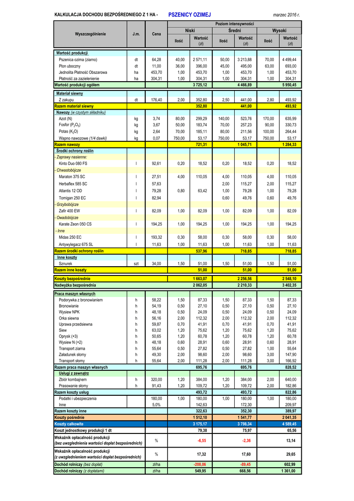 KALKULACJA DOCHODU BEZPOŚREDNIEGO Z 1 HA - PSZENICY OZIMEJ marzec 2016 r. Poziom intensywności Wyszczególnienie J.m. Niski Cena Średni Wysoki Ilość Wartość (zł) Ilość Wartość (zł) Ilość Wartość (zł) Wartość produkcji Pszenica ozima (ziarno) dt 64,28 40,00 2 571,11 50,00 3 213,88 70,00 4 499,44 dt ha ha 11,00 453,70 304,31 36,00 1,00 1,00 396,00 453,70 304,31 3 725,12 45,00 1,00 1,00 495,00 453,70 304,31 4 466,89 63,00 1,00 1,00 693,00 453,70 304,31 5 950,45 dt 176,40 2,00 352,80 352,80 2,50 441,00 441,00 2,80 493,92 493,92 kg kg 3,74 3,67 80,00 50,00 299,29 183,74 140,00 70,00 523,76 257,23 170,00 90,00 635,99 330,73 kg 2,64 70,00 185,11 80,00 211,56 100,00 264,44 kg 0,07 750,00 53,17 721,31 750,00 53,17 1 045,71 750,00 53,17 1 284,33 l 92,61 0,20 18,52 0,20 18,52 0,20 18,52 Maraton 375 SC l 27,51 4,00 110,05 4,00 110,05 4,00 110,05 Herbaflex 585 SC l 57,63 2,00 115,27 2,00 115,27 Atlantis 12 OD l 79,28 0,80 63,42 1,00 79,28 1,00 79,28 Tomigan 250 EC l 82,94 0,60 49,76 0,60 49,76 l 82,09 1,00 82,09 1,00 82,09 1,00 82,09 l 194,25 1,00 194,25 1,00 194,25 1,00 194,25 l 193,32 0,30 58,00 0,30 58,00 0,30 58,00 l 11,63 1,00 11,63 1,00 11,63 1,00 11,63 Plon uboczny Jednolita Płatność Obszarowa Płatność za zazielenienie Wartość produkcji ogółem Materiał siewny Z zakupu Razem materiał siewny Nawozy (w czystym składniku) Azot (N) Fosfor (P2O5) Potas (K2O) Wapno nawozowe (1/4 dawki) Razem nawozy Środki ochrony roślin - Zaprawy nasienne: Kinto Duo 080 FS - Chwastobójcze - Grzybobójcze Zafir 400 EW - Owadobójcze Karate Zeon 050 CS - Inne Midas 250 EC Antywylegacz 675 SL Razem środki ochrony roślin Inne koszty Sznurek Razem inne koszty 537,96 szt 34,00 1,50 Koszty bezpośrednie Nadwyżka bezpośrednia Praca maszyn własnych Podorywka z bronowianiem Bronowianie Wysiew NPK Orka siewna Uprawa przedsiewna Siew Oprysk (×3) Wysiew N (×2) Transport ziarna Załadunek słomy Transport słomy Razem praca maszyn własnych Usługi z zewnątrz Zbiór kombajnem Prasowanie słomy Razem koszty usług Podatki i ubezpieczenia Inne Razem koszty inne Koszty pośrednie Koszty całkowite Koszt jednostkowy produkcji 1 dt 51,00 51,00 718,85 1,50 1 663,07 2 062,05 51,00 51,00 718,85 1,50 2 256,56 2 210,33 51,00 51,00 2 548,10 3 402,35 h h h h h h h h h h h 58,22 54,19 48,18 56,16 59,87 63,02 50,65 48,18 55,64 49,30 55,64 1,50 0,50 0,50 2,00 0,70 1,20 1,20 0,60 0,50 2,00 2,00 87,33 27,10 24,09 112,32 41,91 75,62 60,78 28,91 27,82 98,60 111,28 695,76 1,50 0,50 0,50 2,00 0,70 1,20 1,20 0,60 0,50 2,00 2,00 87,33 27,10 24,09 112,32 41,91 75,62 60,78 28,91 27,82 98,60 111,28 695,76 1,50 0,50 0,50 2,00 0,70 1,20 1,20 0,60 1,00 3,00 3,00 87,33 27,10 24,09 112,32 41,91 75,62 60,78 28,91 55,64 147,90 166,92 828,52 h h 320,00 91,43 1,20 1,20 1,20 1,20 1,00 384,00 109,72 493,72 180,00 172,30 352,30 1 541,77 3 798,34 75,97 2,00 2,00 180,00 5,0% 384,00 109,72 493,72 180,00 142,63 322,63 1 512,10 3 175,17 79,38 640,00 182,86 822,86 180,00 209,97 389,97 2 041,35 4 589,45 65,56 1,00 1,00 Wskaźnik opłacalność produkcji (bez uwzglednienia wartości dopłat bezpośrednich) % -6,55 -2,36 13,14 Wskaźnik opłacalność produkcji (z uwzglednieniem wartości dopłat bezpośrednich) % 17,32 17,60 29,65 -208,06 549,95 -89,45 668,56 602,99 1 361,00 Dochód rolniczy (bez dopłat) Dochód rolniczy (z dopłatami) zł/ha zł/ha