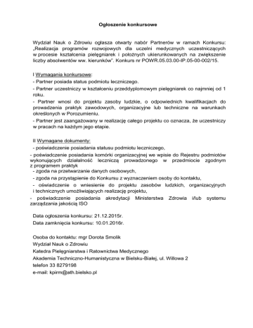 Ogłoszenie konkursowe Wydział Nauk o Zdrowiu ogłasza otwarty nabór Partnerów w ramach Konkursu: „Realizacja programów rozwojowych dla uczelni medycznych uczestniczących w procesie kształcenia pielęgniarek i położnych ukierunkowanych na zwiększenie liczby absolwentów ww. kierunków”. Konkurs nr POWR.05.03.00-IP.05-00-002/15. I Wymagania konkursowe: - Partner posiada status podmiotu leczniczego. - Partner uczestniczy w kształceniu przeddyplomowym pielęgniarek co najmniej od 1 roku. - Partner wnosi do projektu zasoby ludzkie, o odpowiednich kwalifikacjach do prowadzenia praktyk zawodowych, organizacyjne lub techniczne na warunkach określonych w Porozumieniu. - Partner jest zaangażowany w realizację całego projektu co oznacza, że uczestniczy w pracach na każdym jego etapie. II Wymagane dokumenty: - poświadczenie posiadania statusu podmiotu leczniczego, - poświadczenie posiadania komórki organizacyjnej we wpisie do Rejestru podmiotów wykonujących działalność leczniczą prowadzonego w przedmiocie zgodnym z programem praktyk - zgoda na przetwarzanie danych osobowych, - zgoda na przystąpienie do Konkursu z wyznaczeniem osoby do kontaktu, - oświadczenie o wniesienie do projektu zasobów ludzkich, organizacyjnych i technicznych umożliwiających realizację projektu, - poświadczenie posiadania zarządzania jakością ISO akredytacji Ministerstwa Zdrowia Data ogłoszenia konkursu: 21.12.2015r. Data zamknięcia konkursu: 10.01.2016r. Osoba do kontaktu: mgr Dorota Smolik Wydział Nauk o Zdrowiu Katedra Pielęgniarstwa i Ratownictwa Medycznego Akademia Techniczno-Humanistyczna w Bielsku-Białej, ul. Willowa 2 telefon 33 8279198 e-mail: [email protected] i/lub systemu