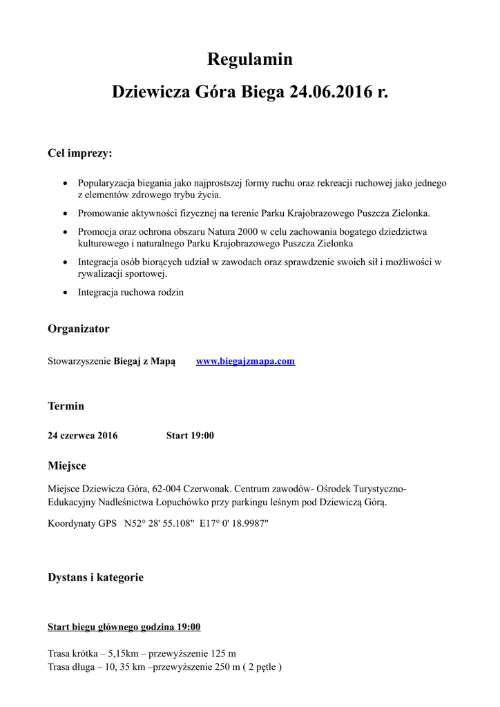 Regulamin Dziewicza Góra Biega 24.06.2016 r. Cel imprezy: · Popularyzacja biegania jako najprostszej formy ruchu oraz rekreacji ruchowej jako jednego z elementów zdrowego trybu życia. · Promowanie aktywności fizycznej na terenie Parku Krajobrazowego Puszcza Zielonka. · Promocja oraz ochrona obszaru Natura 2000 w celu zachowania bogatego dziedzictwa kulturowego i naturalnego Parku Krajobrazowego Puszcza Zielonka · Integracja osób biorących udział w zawodach oraz sprawdzenie swoich sił i możliwości w rywalizacji sportowej. · Integracja ruchowa rodzin Organizator Stowarzyszenie Biegaj z Mapą www.biegajzmapa.com Termin 24 czerwca 2016 Start 19:00 Miejsce Miejsce Dziewicza Góra, 62-004 Czerwonak. Centrum zawodów- Ośrodek TurystycznoEdukacyjny Nadleśnictwa Łopuchówko przy parkingu leśnym pod Dziewiczą Górą. Koordynaty GPS N52° 28' 55.108" E17° 0' 18.9987" Dystans i kategorie Start biegu głównego godzina 19:00 Trasa krótka – 5,15km – przewyższenie 125 m Trasa długa – 10, 35 km –przewyższenie 250 m ( 2 pętle ) Kategorie wiekowe: M - 20 M – 40 M – 50 do 30 lat 31 - 49 lat 50 lat i więcej K – 20 K – 40 K – 50 do 30 lat 31 – 49 lat 50 lat i więcej ( roczniki 1986 i młodsi ) ( roczniki 1967 – 1985 ) ( roczniki 1966 i starsi ) Marsz Nordic Walking – kategoria OPEN K i OPEN M tylko na dystansie 5 km. Biuro zawodów Czynne w dniu biegu w godzinach 17:30 – 18:45 w centrum zawodów ( Dziewicza Baza ). Trasa Trasa prowadzi drogami leśnymi ( możliwość biegu w kolcach ), bardzo wymagająca z licznymi podbiegami, trasa nie posiada atestu. Trasa w terenie oznaczona co kilometr. Długość pętli 5,15km ( przewyższenie 125 m ). Zawodnicy startujący na dystansie 10 km, przebiegają przez linie mety i kierują się na drugą pętle. Zgłoszenia i opłata startowa Istnieją dwie możliwości zgłoszenia: 1) Wcześniejsze, tańsze wpisowe, online: Należy zgłosić się poprzez formularz zgłoszeniowy na stronie www.dziewiczagorabiega.pl oraz przelać opłatę startową na konto 11 1090 1447 0000 0001 2216 3207 tylko do środy (włącznie) poprzedzającej dany bieg. Osoba która do środy nie uiści opłaty startowej, jest zobowiązana do opłacenia wyższej kwoty w dniu imprezy w biurze zawodów. 2) W biurze zawodów w dniu imprezy: wystarczy przyjść na miejsce, zapisać się w biurze zawodów i wnieść opłatę startową. Wpisowe dla zapisanych w ten sposób jest droższe o 5zł. W razie problemów ze zgłoszeniem prosimy o kontakt na [email protected] Dane do przelewu Biegaj z Mapą Nr konta 11 1090 1447 0000 0001 2216 3207 ul. Wilczak 4/17 61-623 Poznań z dopiskiem Dziewicza Góra Biega Opłata startowa Opłata startowa online, w terminie Opłata startowa na miejscu - 25 zł - 30 zł Pomiar czasu Na zawodach będzie prowadzony elektroniczny pomiar czasu za pomocą chipa, którego zawodnik otrzyma z numerem startowym w biurze zawodów. Numer startowy należy przymocować na wysokości klatki piersiowej. Chip jest zwrotny. Numer startowy jest dla zawodnika na pamiątkę. Nie zwrócenie chipa po biegu spowoduje naliczenie kary umownej w wysokości 20 złotych. Dodatkowo za każdy nie zwrócony chip zawodnik zostanie obciążony kosztami administracyjnymi wynoszącymi 30zł brutto za sztukę. Nagrody Dla najlepszych 3 zawodników poszczególnych kategorii dyplomu oraz drobne nagrody rzeczowe w tym karnet na wieczorne wejście na wieże widokową. Dla każdego zawodnika który ukończy bieg przewidziano napój i słodką przekąskę. Każdy zawodnik będzie mógł po biegu przyjemnie spędzić czas przy ognisku. Postanowienia końcowe Uczestnik zawodów wyraża zgodę na przetwarzanie swoich danych osobowych zgodnie z ustawą z dnia 29 sierpnia 1997r. o ochronie danych osobowych (tekst jednolity: Dz. U. 2002 r. Nr 101 poz. 926, ze zm.) oraz wizerunku i zdjęć dla potrzeb związanych z organizacją i promocją imprezy. Uczestnik przyjmuje do wiadomości, że przysługuje mu prawo wglądu do treści swoich danych oraz ich poprawiania. Uczestnik zawodów wyraża zgodę na otrzymywanie od organizatora informacji dotyczących naszych zawodów, oraz informacji o naszych partnerach. Sprawy nie ujęte w niniejszym regulaminie oraz jego interpretacja należą do organizatora. Zawody odbędą się bez względu na pogodę. Uczestnicy ubezpieczają się we własnym zakresie i startują na własną odpowiedzialność. Biorąc udział w zawodach, są zdrowi i nie mają żadnych przeciwwskazań zdrowotnych by w nich uczestniczyć. Osoby, które zrezygnują ze startu nie mogą ubiegać się o zwrot wpisowego oraz przenosić opłaty startowej na innych uczestników. Osoby niepełnoletnie mogą startować tylko za pisemną zgoda opiekunów prawnych. Organizator nie ponosi odpowiedzialności za rzeczy zgubione podczas imprezy i za szkody wyrządzone przez uczestników. Limit czasu na wszystkich trasach i we wszystkich kategoriach wiekowych wynosi 2h. Zgłoszenie się na bieg przez formularz zgłoszeniowy oraz zgłoszenie się na miejscu w centrum zawodów świadczy o akceptacji powyższego regulaminu. Protesty należy składać mailowo do 24 h po opublikowaniu wyników.