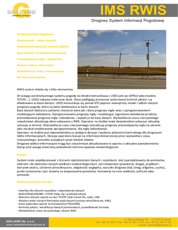 IMS RWIS Drogowy System Informacji Pogodowej Drogowa Stacja Pogodowa Elastycznoœæ - ró¿ne czujniki Rozwi¹zanie akwizycji danych (UDCS) Baza danych i przetwarzanie danych Przewidywanie mg³y i oblodzenia System niskiej widocznoœci Wyœwietlacze czasu rzeczywistego Wczesne ostrzeganie RWIS system sk³ada siê z kilku elementów. W zasiêgu automatycznego systemu pogody na drodze komunikacja z UDCS jest po GPRS (radio modem, TCP/IP,…). UDCS nabywa zmierzone dane. Dane podlegaj¹ procesowi systemowej kontroli jakoœci i s¹ sk³adowane w bazie danych. UDCS komunikuje siê ponad GTS poprzez zewnêtrzny model i odbiór danych prognozy pogody, które s¹ tak¿e sk³adowane w bazie danych. Baza danych dostarcza zarówno mierzone dane jak i dane prognozy mg³a wraz z oprogramowaniem modeluj¹cym oblodzenia. Oprogramowanie prognozy mg³y i modeluj¹ce zagro¿enie oblodzenia przelicza przewidywania prognozy mg³y i oblodzenia, i wysy³a je do bazy danych. Wyœwietlacze czasu rzeczywistego natychmiast aktualizuj¹ dane nabywane z RWS. Operator na s³u¿bie mo¿e bezpoœrednio zobaczyæ aktualn¹ sytuacjê w terenie. Wyœwietlacze czasu rzeczywistego wizualizuj¹ prognozy przewidywania mg³y na ekranie jako rezultat modelowanie oprogramowania dla mg³y (oblodzenia). Operator na s³u¿bie jest odpowiedzialny za podjêcie decyzje i wydaniu polecenia kontrolnego dla drogowym tablic informacyjnych. Decyzja operatora bazuje na informacji dostarczonej przez wyœwietlacz czasu rzeczywistego i procedur przyjêtych przez lokalne w³adze. Drogowe tablice informacyjne mog¹ byæ natychmiast aktualizowane w oparciu o aktualne powiadomienia bior¹c pod uwagê zmierzon¹ widzialnoœæ lub inne zjawiska meteorologiczne. Pomiar System mo¿e wspó³pracowaæ z licznymi rejestratorami danych i czujnikami. Jest zaprojektowany do pomiarów, obliczeñ i do zbierania ró¿nych wielkoœci meteorologicznych jak temperatur (powietrze, droga), prêdkoœæ i kierunek wiatru, ciœnienie atmosferyczne, wilgotnoœæ wzglêdna, warunki drogowe (lód, œnieg, wilgotno, sucho), punkt zamarzania i jest otwarty na dopasowanie pomiarów i konwersji na inne wielkoœci, jeœli jest taka potrzeba. Modu³ pomiarowy oferuje: - Interfejs dla ró¿nych czujników i rejestratorów danych - RS232/RS422/RS485, TCP/IP (http, ftp i protokó³ telnet) - Zbieranie danych oparte na sieci TCP/IP i/lub liniach RS, radio, USB - Wspiera wiele ró¿nych formatów wejœciowych (surowy tekst/binarnie, XML) - Dane wejœciowe oparte na konwerterze Plain2XML - Kontrola jakoœci, weryfikacja danych pomiarowych, prawid³owoœæ formatu - Wyœwietlacze czasy rzeczywistego, ekrany Web GOLLAND Sp. z o.o. www.oswietlenielotniskowe.pl ul. Styczyñskiego 83 ; 41-500 Chorzów tel. +48 32 349 17 00, +48 32 349 17 01, fax +48 32 349 17 02 e-mail: [email protected] Opis systemu: Automatyczna stacja pogody na drodze dostarcza wiarygodnych danych z gruntu na powierzchni drogi. Dane s¹ prezentowane na wyœwietlaczach czasu rzeczywistego. Zmierzone dane z gruntu s¹ podstaw¹ dla modelu prognozy mg³y (lodu), weryfikuj¹c rezultaty wynikaj¹ce z modelu. Automatyczna stacja pogody sk³ada siê z kilku czêœci: - Rejestrator - Czujniki - Maszt meteorologiczny - Akcesoria czujnik prêdkoœci i kierunku wiatru kamera kamera Nieintruzyjne czujniki jezdni (temperatura powierzchni i warunki drogowe) czujnik widzialnoœci i pogody bie¿¹cej czujnik temperatury i wilgotnoœci wzglêdnej czujnik ciœnienia Czujniki w terenie Typowe ustawienie czujników w terenie sk³ada siê z: - Czujników prêdkoœci i kierunku wiatru - Czujników ciœnienia - Czujników temperatury i wilgotnoœci wzglêdnej - Czujników widzialnoœci i pogody bie¿¹cej - Czujniki temperatury i wilgoci gruntu - Kamera Nieintruzyjne czujniki jezdni: - Temperatura powierzchni - Warunki drogowe Aktywne/pasywne czujniki drogowe czujnik temperatury i wilgoci gruntu Intruzyjne czujniki jezdni: - Inteligentny Drogowy Czujnik Warunków Powierzchniowych: temperatura na powierzchni i pod gruntem, koncentracja soli drogowej, punkt zamarzania, wysokoœæ filmu cieczy, warunki drogowe - Aktywne/pasywne czujniki drogowe GOLLAND Sp. z o.o. www.oswietlenielotniskowe.pl ul. Styczyñskiego 83 ; 41-500 Chorzów tel. +48 32 349 17 00, +48 32 349 17 01, fax +48 32 349 17 02 e-mail: [email protected] Modelowanie i prognozowanie Model prognozowania mg³y i oblodzenia dostarcza prognozy lokalnej widzialnoœci i predykcji go³oledzi. Oczywiœcie model mg³y (lodu) nie mo¿e zapobiegaæ warunkom pogodowym. Dostarcza jedynie wczesne ostrze¿enia o mo¿liwoœci tworzeniu siê mgie³ (go³oledzi). Modele mog¹ byæ stosowane jako wczesne ostrzeganie do utemperowania uwagi operatorów. Wyœwietlacz czasu rzeczywistego Wyœwietlacz czasu rzeczywistego jest kolekcj¹ ekranów zainstalowan¹ w centralnym biurze. G³ównym celem jest prezentowanie danych nabytych ze stacji terenowej AWS, wizualizowanie przewidywania mg³y (lodu), jak równie¿ aktualnych warunków na drodze z wyjœcia modelu. Powinny byæ obs³ugiwane przez operatorów na s³u¿bie dla wsparcia podejmowania decyzji o wczesnym ostrzeganiu. Alarmy IMS Road System pozwala na konfiguracjê bogatych ustawieñ alarmów zawieraj¹cych: - Diagnostykê rejestratora danych i b³êdów czujników - Kontrolê jakoœci mierzonych danych (limity, wewnêtrzne ustawienia) - Alarmy operacyjne (progi i limity ustawiane przez u¿ytkowników) - B³êdy komunikacyjne GOLLAND Sp. z o.o. www.oswietlenielotniskowe.pl ul. Styczyñskiego 83 ; 41-500 Chorzów tel. +48 32 349 17 00, +48 32 349 17 01, fax +48 32 349 17 02 e-mail: [email protected]