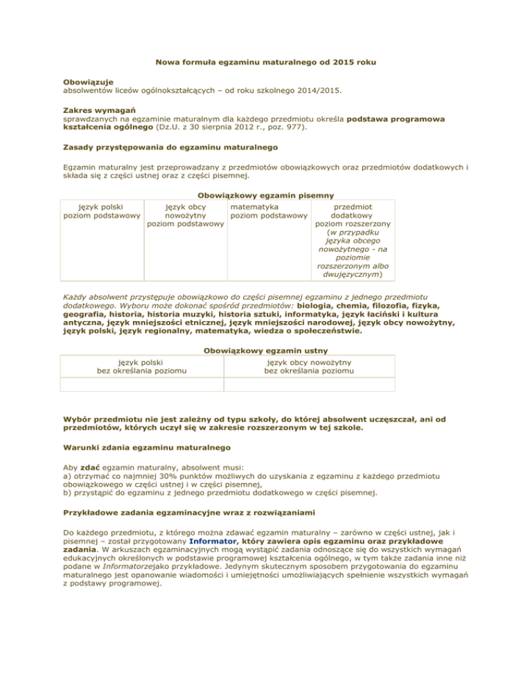 Nowa formuła egzaminu maturalnego od 2015 roku Obowiązuje