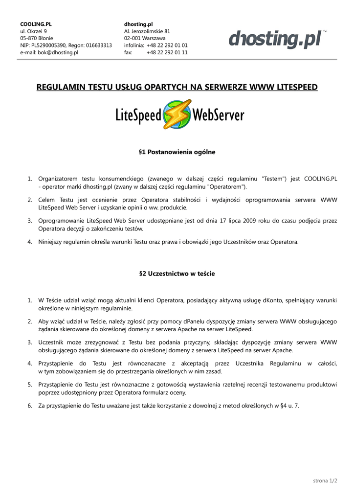COOLING.PL ul. Okrzei 9 05-870 Błonie NIP: PL5290005390, Regon: 016633313 e-mail: [email protected] dhosting.pl Al. Jerozolimskie 81 02-001 Warszawa infolinia: +48 22 292 01 01 fax: +48 22 292 01 11 REGULAMIN TESTU USŁUG OPARTYCH NA SERWERZE WWW LITESPEED §1 Postanowienia ogólne 1. Organizatorem testu konsumenckiego (zwanego w dalszej części regulaminu "Testem") jest COOLING.PL - operator marki dhosting.pl (zwany w dalszej części regulaminu "Operatorem"). 2. Celem Testu jest ocenienie przez Operatora stabilności i wydajności oprogramowania serwera WWW LiteSpeed Web Server i uzyskanie opinii o ww. produkcie. 3. Oprogramowanie LiteSpeed Web Server udostępniane jest od dnia 17 lipca 2009 roku do czasu podjęcia przez Operatora decyzji o zakończeniu testów. 4. Niniejszy regulamin określa warunki Testu oraz prawa i obowiązki jego Uczestników oraz Operatora. §2 Uczestnictwo w teście 1. W Teście udział wziąć mogą aktualni klienci Operatora, posiadający aktywną usługę dKonto, spełniający warunki określone w niniejszym regulaminie. 2. Aby wziąć udział w Teście, należy zgłosić przy pomocy dPanelu dyspozycję zmiany serwera WWW obsługującego żądania skierowane do określonej domeny z serwera Apache na serwer LiteSpeed. 3. Uczestnik może zrezygnować z Testu bez podania przyczyny, składając dyspozycję zmiany serwera WWW obsługującego żądania skierowane do określonej domeny z serwera LiteSpeed na serwer Apache. 4. Przystąpienie do Testu jest równoznaczne z akceptacją przez w tym zobowiązaniem się do przestrzegania określonych w nim zasad. 5. Przystąpienie do Testu jest równoznaczne z gotowością wystawienia rzetelnej recenzji testowanemu produktowi poprzez udostępniony przez Operatora formularz oceny. 6. Za przystąpienie do Testu uważane jest także korzystanie z dowolnej z metod określonych w §4 u. 7. Uczestnika Regulaminu w całości, strona 1/2 COOLING.PL ul. Okrzei 9 05-870 Błonie NIP: PL5290005390, Regon: 016633313 e-mail: [email protected] dhosting.pl Al. Jerozolimskie 81 02-001 Warszawa infolinia: +48 22 292 01 01 fax: +48 22 292 01 11 §3 Testowany produkt 1. Testowanym produktem jest oprogramowanie serwera WWW: LiteSpeed Web Server. 2. Po przystąpieniu Uczestnika do Testu, Operator zobowiązuje się do zmiany oprogramowania serwera WWW, z serwera Apache na LiteSpeed Web Server dla poszczególnych, zgodnych ze złożonymi dyspozycjami, domen Uczestnika. 3. Zmiana serwera WWW obsługującego ruch dla domeny dotyczy jednocześnie wszystkich subdomen zawartych w domenie, będącej przedmiotem dyspozycji. 4. Operator dołoży wszelkich starań, aby zachować ciągłość usług świadczonych przy pomocy testowanego oprogramowania. 5. Operator nie ponosi odpowiedzialności za wadliwe działanie testowanego oprogramowania i straty z tym związane. 6. Podczas trwania Testu Operator zobowiązuje się nie naliczać dodatkowych opłat za wygenerowany z wykorzystaniem testowanego oprogramowania ruch sieciowy. 7. Operator udostępnia dwie metody przeprowadzenia Testu: ◦ domyślną, dostępną bez potrzeby składania dyspozycji – poprzez konfigurację oprogramowania LiteSpeed Web Server działającego na porcie 81, dla wszystkich zaparkowanych domen klienta, ◦ uruchamianą na życzenie, dostępną po złożeniu dyspozycji w dPanelu – poprzez konfigurację oprogramowania LiteSpeed Web Server, działającego na porcie 80, dla wybranych przez Uczestnika domen. §4 Postanowienia końcowe 1. Regulamin wchodzi w życie z dniem publikacji na stronie WWW Operatora. 2. Niniejszy regulamin dostępny jest na stronie internetowej Operatora, pod adresem: http://dhosting.pl/download/regulamin_testow_litespeed.pdf 3. W sprawach nieuregulowanych niniejszym Regulaminem, zastosowanie mają regulaminy świadczenia posiadanych przez Uczestnika usług oraz przepisy Kodeksu Cywilnego. 4. Sądem rozstrzygającym wszelkie roszczenia w stosunku do Operatora będzie Sąd właściwy dla siedziby Operatora. strona 2/2