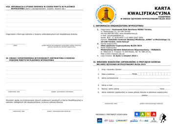 ……………………………………………………………………………………………………………………………………………………………………………………………………… KARTA KWALIFIKACYJNA ……………………………………………………………………………………………………………………………………………………………………………………………………… UCZESTNIKA W OBOZIE JĘZYKOWO-WYPOCZYNKOWY BLIZA 2015 VIII. INFORMACJA O STANIE ZDROWIA W CZASIE POBYTU W PLACÓWCE WYPOCZYNKU (dane o zaczopowaniach, urazach, leczeniu itp.) ……………………………………………………………………………………………………………………………………………………………………………………………………… ……………………………………………………………………………………………………………………………………………………………………………………………………… ……………………………………………………………………………………………………………………………………………………………………………………………………… I. INFORMACJA ORGANIZATORA WYPOCZYNKU 1. Organizator informuje rodziców o leczeniu ambulatoryjnym lub hospitalizacji dziecka ...................................... (data) ………………….............................................. (podpis lekarza lub pielęgniarki sprawującej opiekę medyczną podczas wypoczynku placówki wypoczynku) 2. 3. 4. IX. UWAGI I SPOSTRZEŻENIA WYCHOWAWCY-INSTRUKTORA O DZIECKU PODCZAS POBYTU W PLACÓWCE WYPOCZYNKU ……………………………………………………………………………………………………………………………………………………………………………………………………… Organizator: Uczniowski Klub Sportowy HESED Tarnów, ul. Mościckiego 12, 33-100 Tarnów tel./fax 609 663 654, www.hesedtarnow.pl, e-mail: [email protected], konto: BGŻ 27 2030 0045 1110 0000 0245 5950. Partner: Katolickie Centrum Edukacji Młodzieży „KANA” ul.Mościckiego 12, 33-100 Tarnów, www.kana.pl Forma wypoczynku: Obóz językowo-wypoczynkowy BLIZA 2015 Adres wypoczynku: Młodzieżowy Ośrodek Szkoleniowo-Wypoczynkowy - TRZĘSACZ, ul. Pałacowa 3, Trzęsacz 72-344 Rewal,, tel. 91-386-24-51, http://www.trzesacz.edu.pl/ Czas trwania: 21 lipiec-1 sierpień 2015 r. II. WNIOSEK RODZICÓW (OPIEKUNÓW) O PRZYJĘCIE DZIECKA NA OBÓZ JĘZYKOWO-WYPOCZYNKOWY BLIZA 2015 ……………………………………………………………………………………………………………………………………………………………………………………………………… 1. Imię i nazwisko dziecka ……………………………………………………………………………………………………………………………………………………………………………………………………… 2. Data urodzenia ……………………………………………………………………………………………………………………………………………………………………………………………………… 3. Adres zamieszkania miejscowość, data …………………............................................... (podpis wychowawcy-instruktora) …............................ PESEL .............,................................................................................... ……….……………………….……………………………………………………. ……………………………………………………………………………………………………………………………………………………………………………………………………… ...................................... ............................................................................................ 4. Adres e-mail 5. Nazwa i adres szkoły 6. Adres rodziców (opiekunów) w czasie pobytu dziecka w placówce wypoczynku: .............................................................................................................. .……….............................................................. klasa .......... .............................................................................telefon.......................................... Wyrażam zgodę na przetwarzanie danych osobowych zawartych w Karcie Kwalifikacyjnej w zakresie niezbędnym dla bezpieczeństwa i ochrony zdrowia dziecka. ...................................... miejscowość, data ………………………………………… (miejscowość, data) …………………............................................... (podpis rodzica/prawnego opiekuna) MECENASI I PARTNERZY KCEM KANA ……………………………………….. (podpis rodzica/prawnego opiekuna) III. INFORMACJA RODZICÓW (OPIEKUNÓW) O STANIE ZDROWIA DZIECKA (np. na co dziecko jest uczulone, jak znosi jazdę samochodem, czy przyjmuje stałe leki i w jakich dawkach, czy nosi aparat ortodontyczny lub okulary) V. INFORMACJA O DZIECKU WYCHOWAWCY KLASY (w przypadku braku możliwości uzyskania opinii wychowawcy klasy – wypełnia rodzic/opiekun) ……………………………………………………………………………………………………………………………………………………………………………………………………… ……………………………………………………………………………………………………………………………………………………………………………………………………… ……………………………………………………………………………………