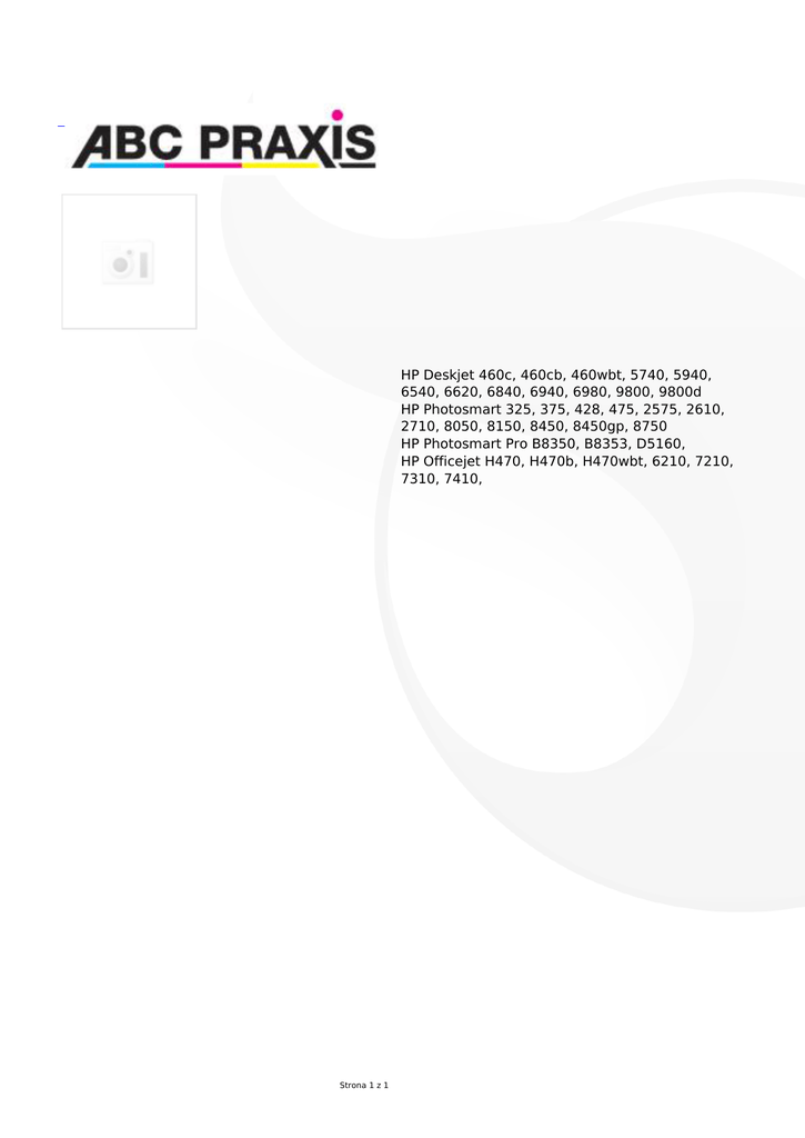 HP Deskjet 460c, 460cb, 460wbt, 5740, 5940, 6540, 6620, 6840, 6940, 6980, 9800, 9800d HP Photosmart 325, 375, 428, 475, 2575, 2610, 2710, 8050, 8150, 8450, 8450gp, 8750 HP Photosmart Pro B8350, B8353, D5160, HP Officejet H470, H470b, H470wbt, 6210, 7210, 7310, 7410, Strona 1 z 1